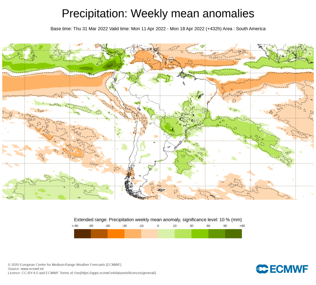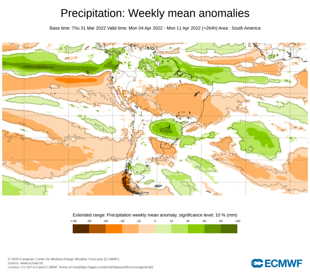 El pronostico semanal emitido por European Centre for Medium-Range Weather Forecast (ECMWF), se esperan eventos de precipitaciones dentro de promedio en casi todo el territorio nacional.