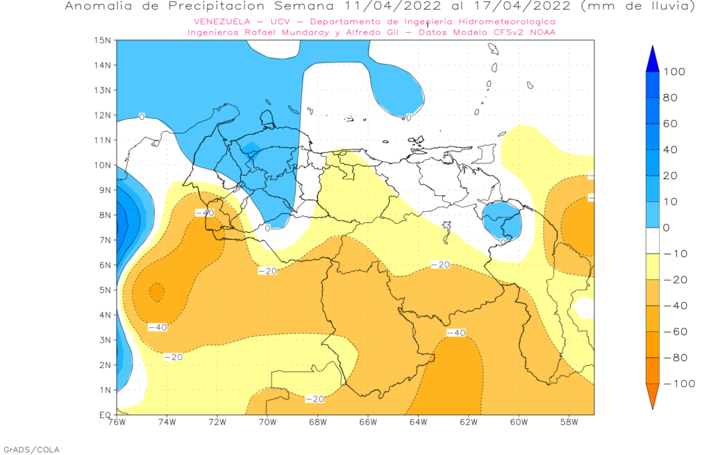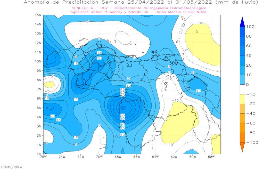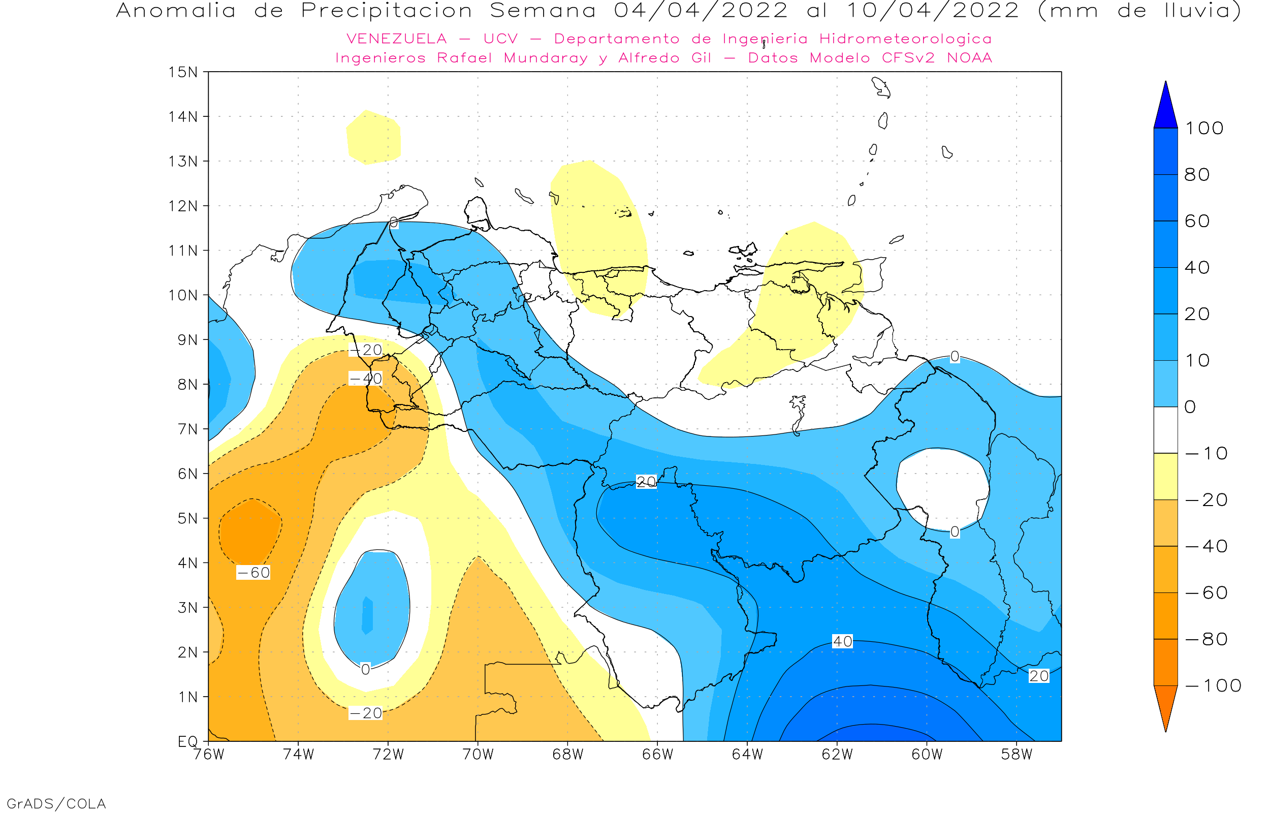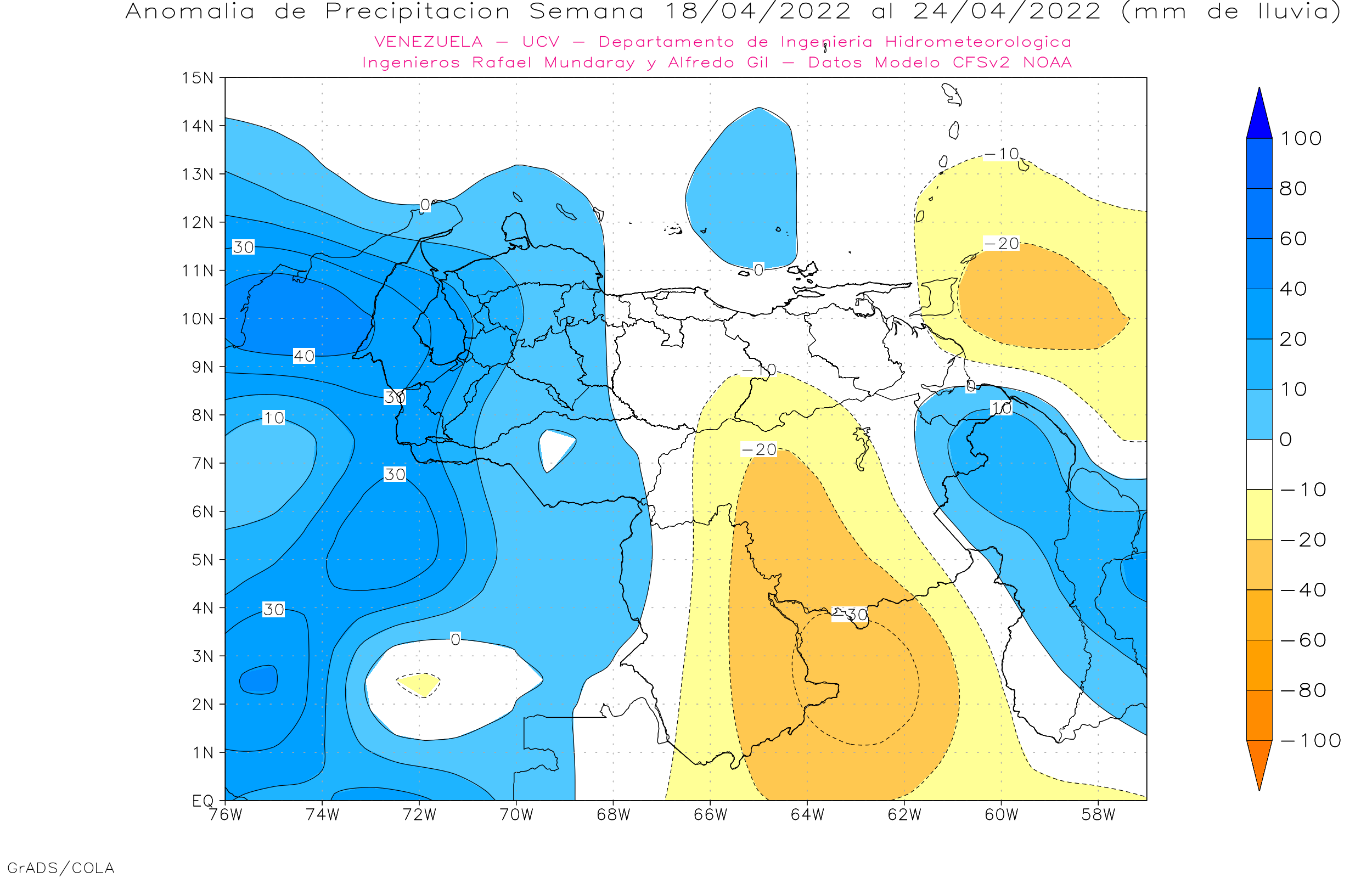 El modelo GFSV2 prevé en general eventos de precipitaciones dentro del promedio histórico y positivas importantes en los estados occidentales, Apure y los andes y anomalías negativas al sur de los estados Bolivar y Amazonas.