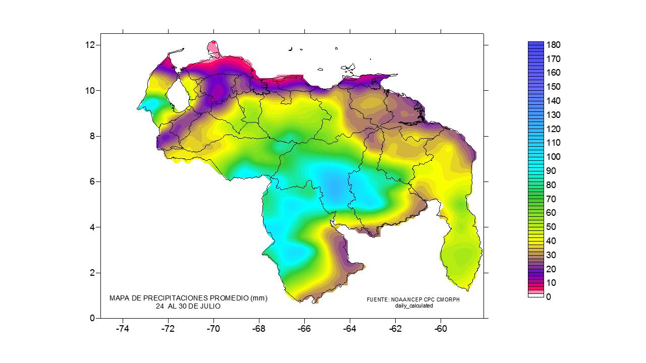 De acuerdo a la estadística de la precipitación estimada ( NOAA NCEP CPC CMORPH, daily_calculated) durante el periodo del 04 AL 30/07/22, se observa que los principales eventos de precipitaciones ocurren al sur del país (Amazonas y Bolívar), suroeste de Zulia, Apure, sur de Guárico y este de Barinas. Los eventos por encima de los 60 mm se ubican al sur de los 9° norte.