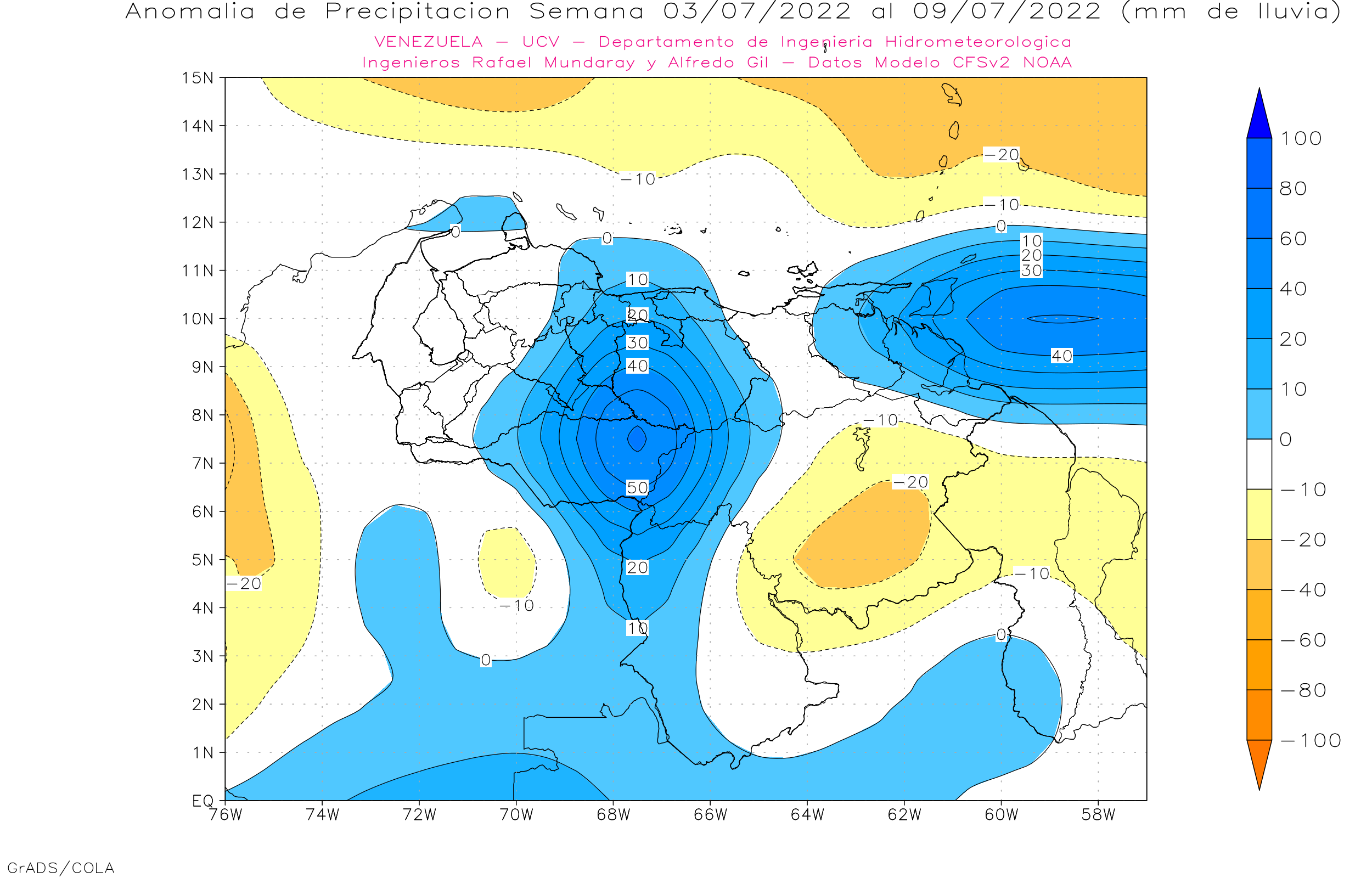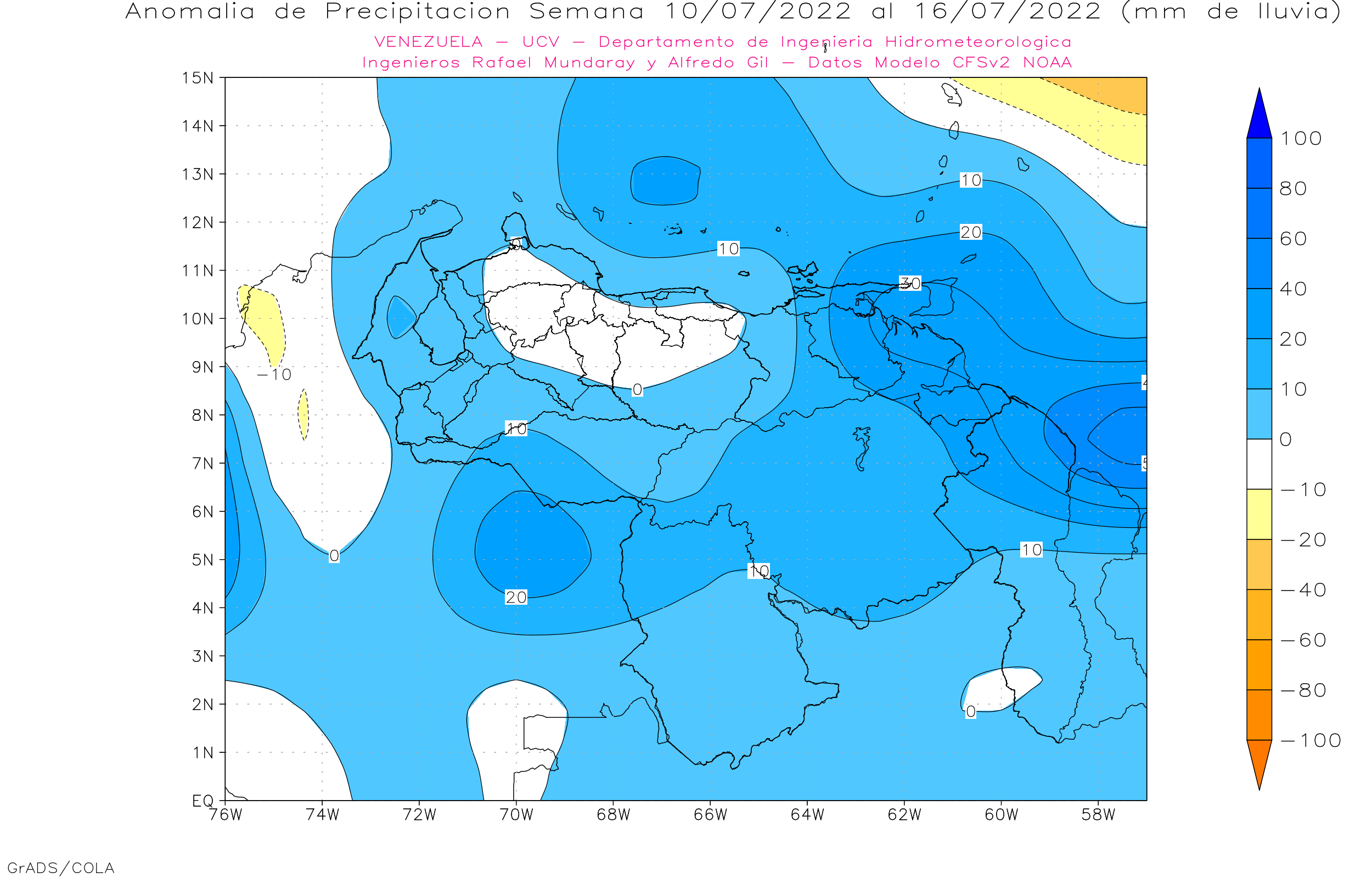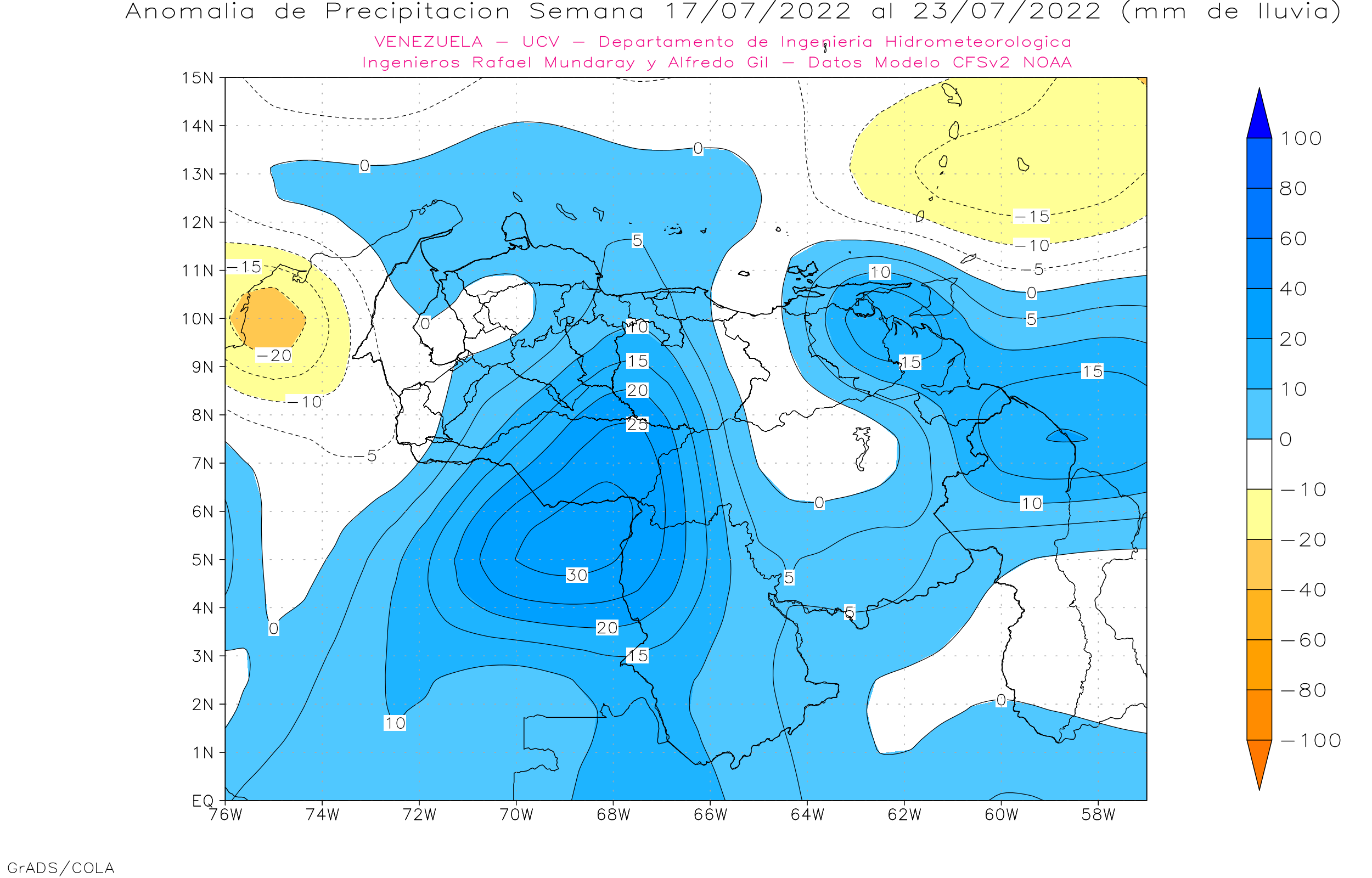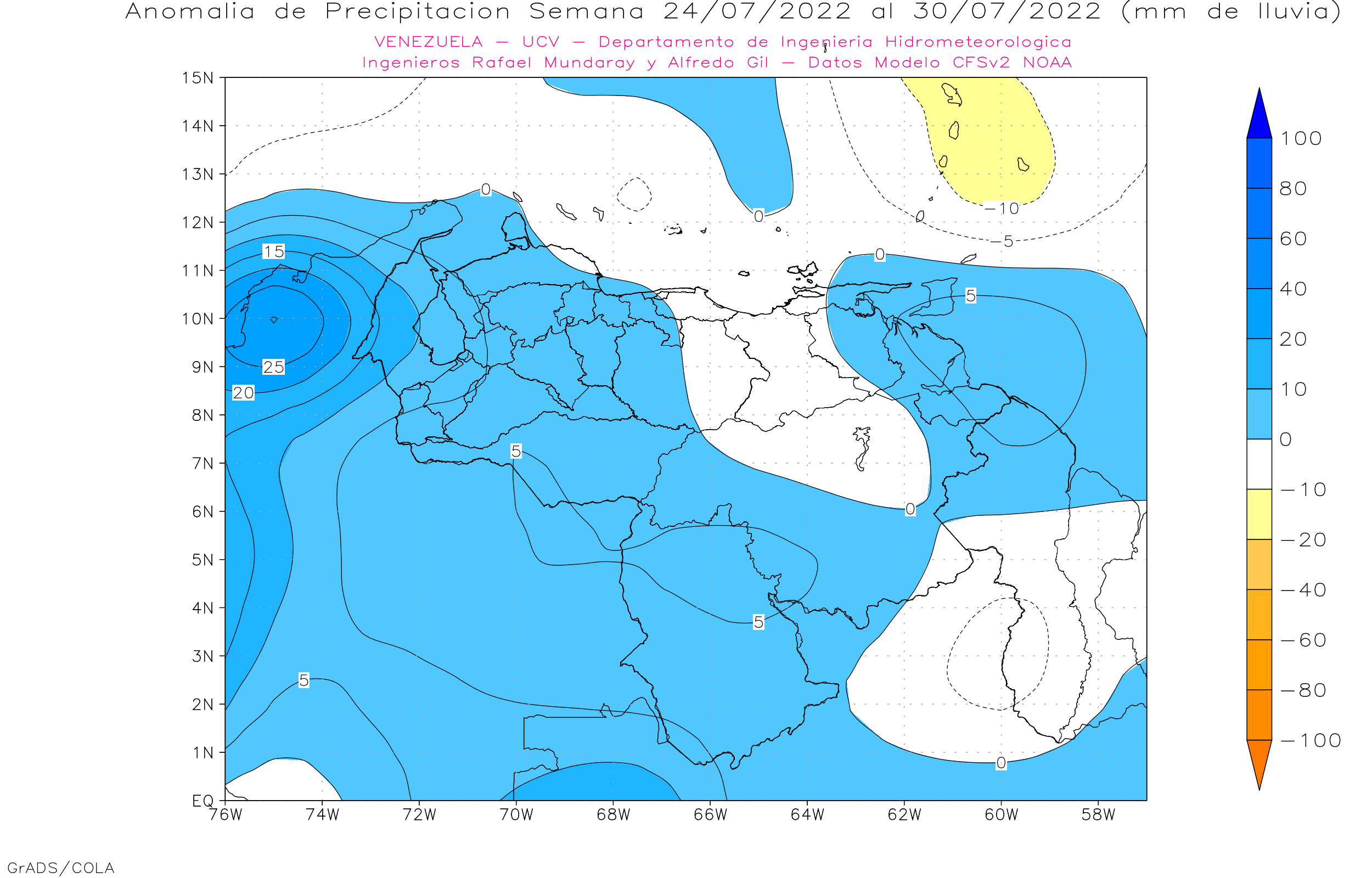 ronostico de Anomalías Semanales para Venezuela, del 04 al 30/07/22, usando datos del Modelo CFSv2 de NOAA y ECMWF.