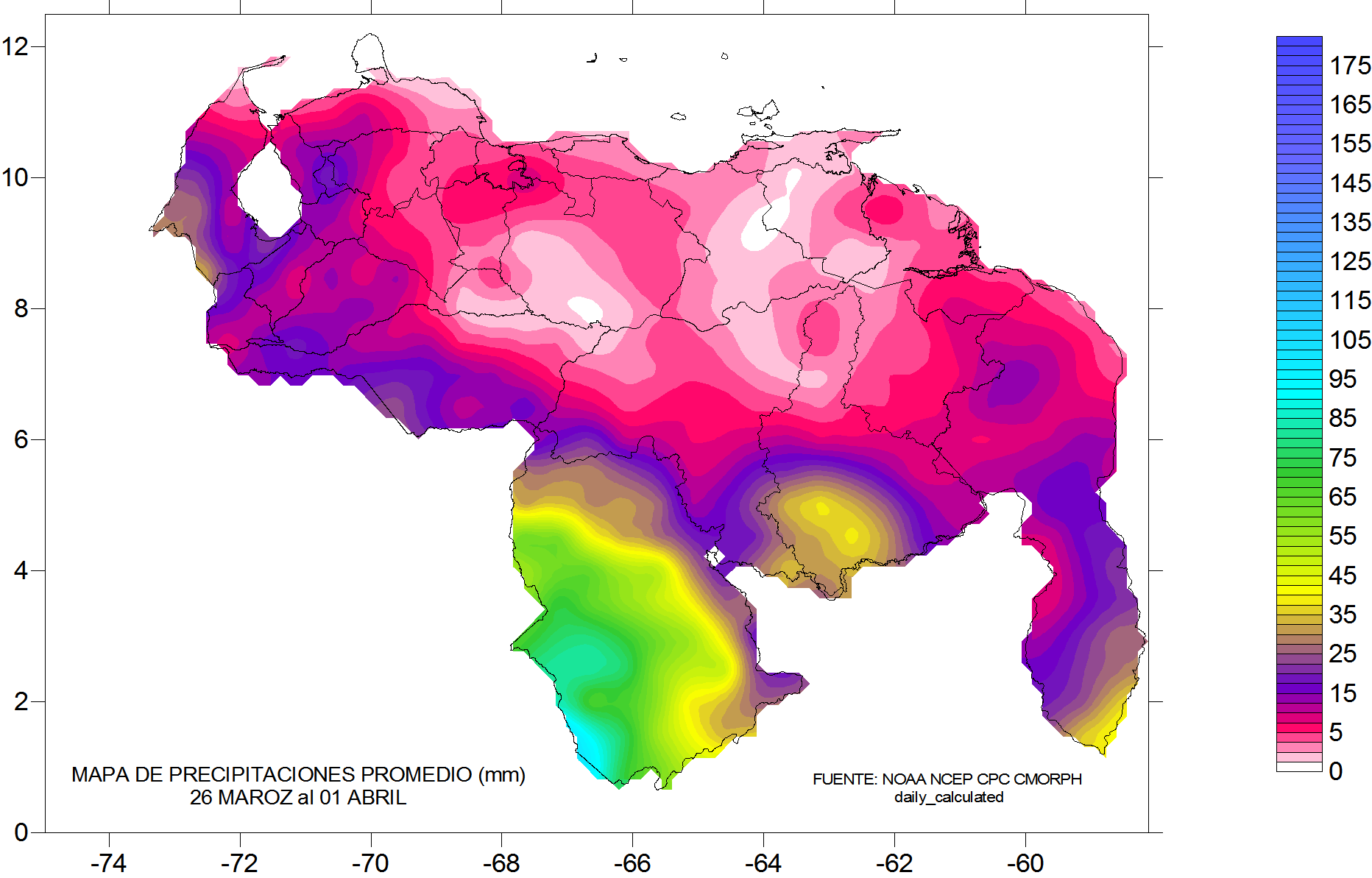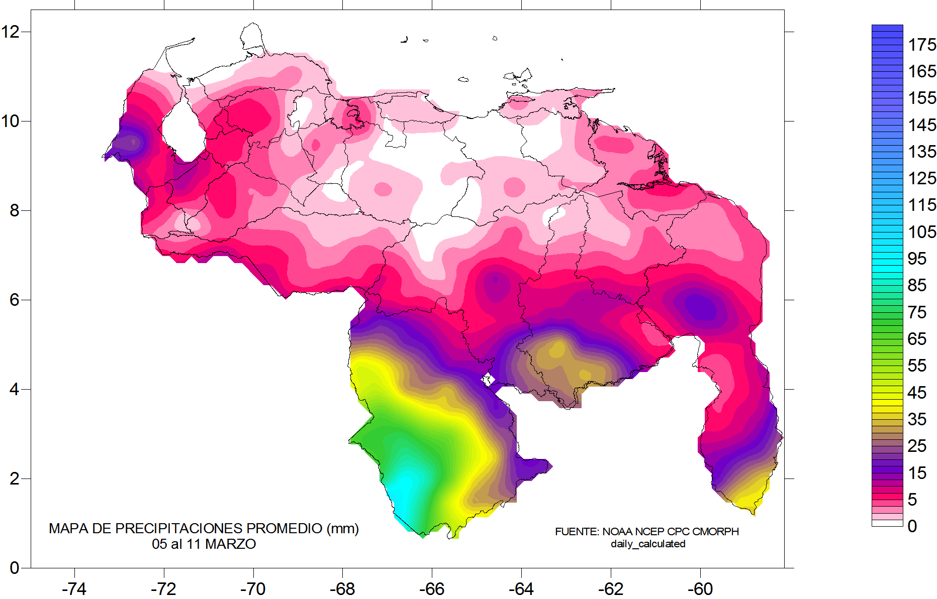 De acuerdo a la estadística de las precipitaciones estimadas para esta semana, se observa que los eventos más importantes se mantiene al sur del país, los centro de lluvias cercanos a 70 en el suroeste de Amazonas y 40 mm en el suroeste de Bolívar. Ya se observa que las lluvias por encima de los 30 mm se ubican al sur de 3° norte. Los llanos occidentales comienza a mostrar los primeros eventos de precipitaciones, la región central y oriental con valores cercanos a 0 mm. Oeste de Zulia con centro de lluvias de 30 mm, Ya se aprecia un incremento de las lluvias en varios sectores del país.