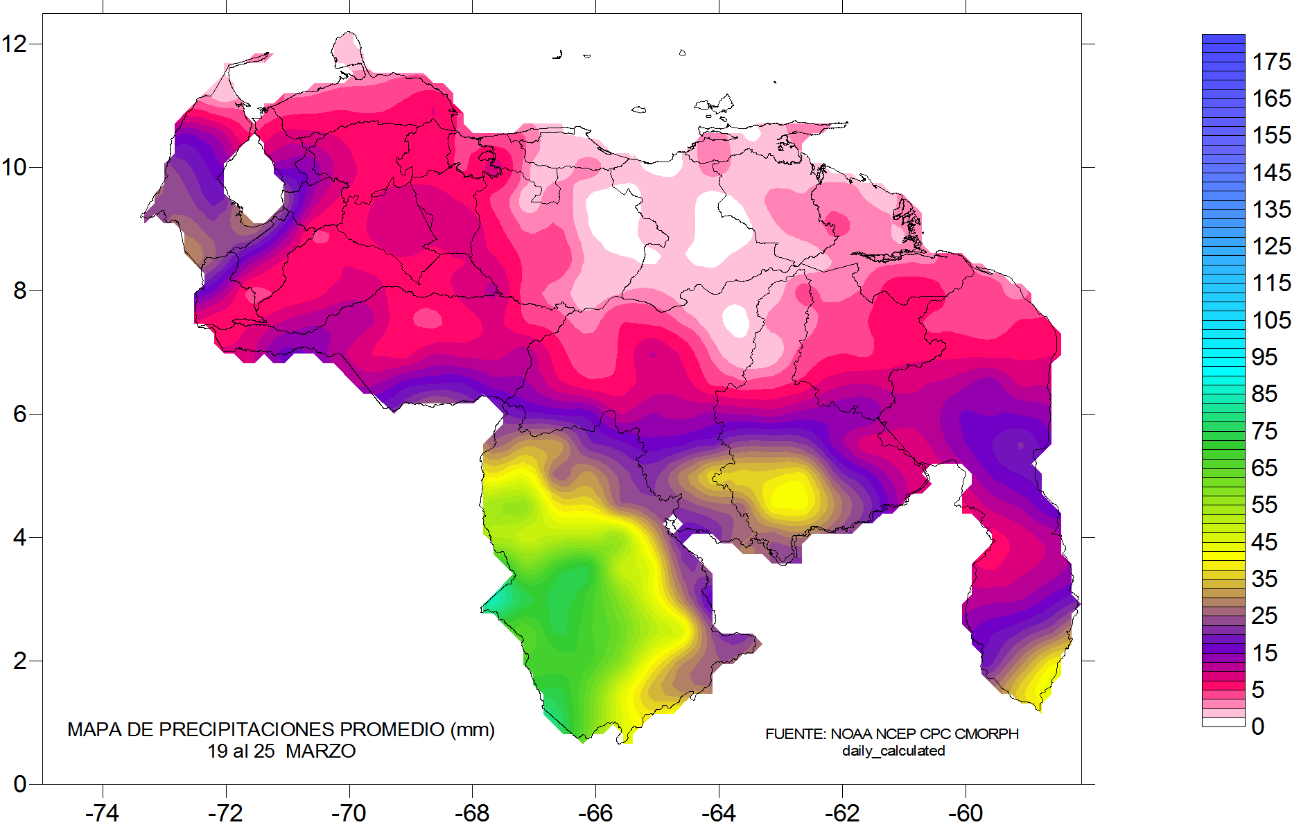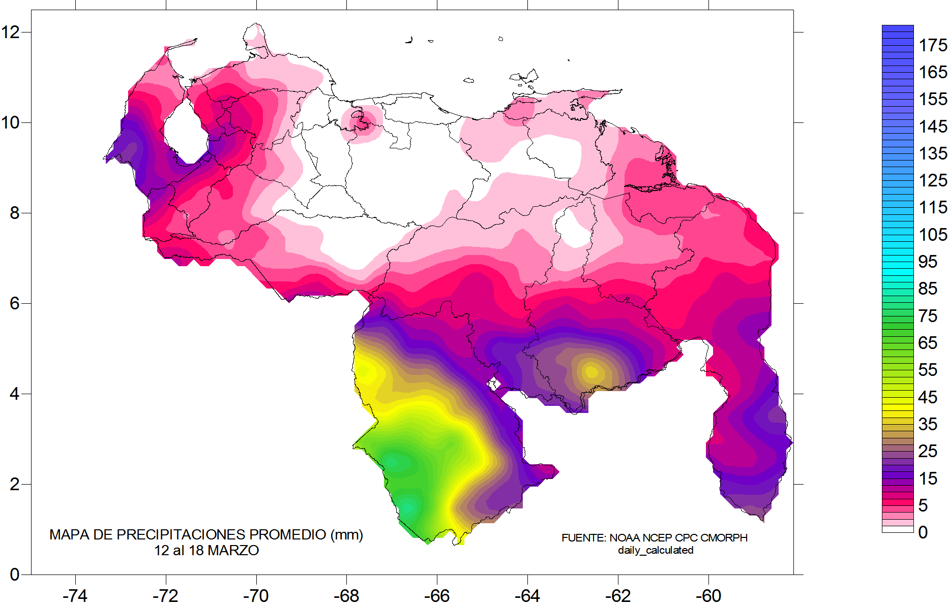 De acuerdo a la estadística de las precipitaciones estimadas para esta semana, se observa que los eventos más importantes se mantiene al sur del país, los centro de lluvias cercanos a 70 en el suroeste de Amazonas y 40 mm en el suroeste de Bolívar. Ya se observa que las lluvias por encima de los 25 mm se ubican al sur de 3° norte. Los llanos, región central y oriental con valores cercanos a 0 mm. Oeste de Zulia con centro de lluvias de 20 mm, con eventos cercano a los 10 mm. Ya se aprecia un incremento de las lluvias en varios sectores del país.