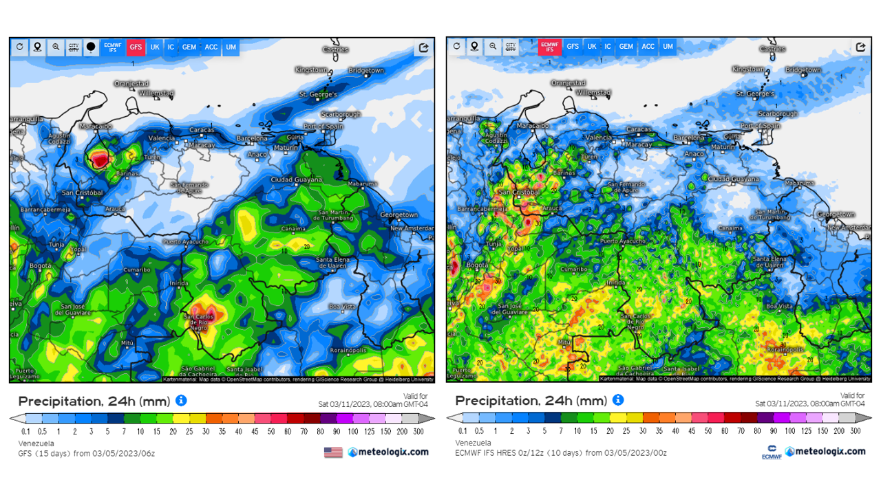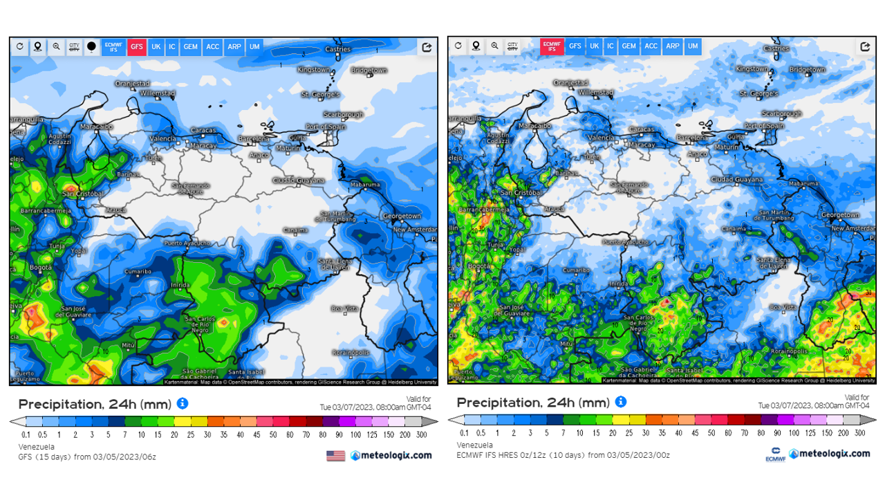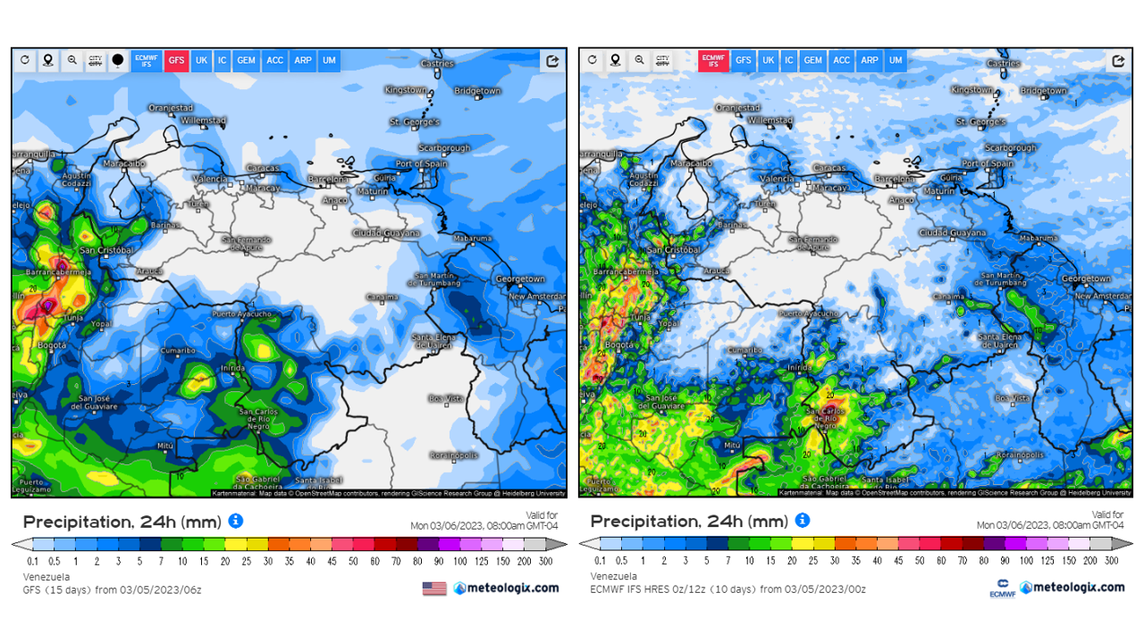 Estado del sur (Bolívar y Amazonas). En la semana se esperan que los eventos sean moderados, lo más importantes se deben presentar al sur de Amazonas y sur de Bolívar. La semana comienza con escasos eventos de precipitaciones, pero se van reactivando en el transcurso de la semana, los más importantes entre martes y miércoles, luego se presentara una reducción paulatina de los eventos de precipitaciones sobre la región, reactivándose para el fin de semana.