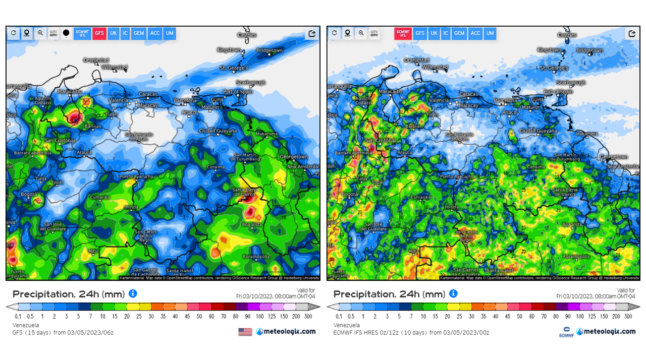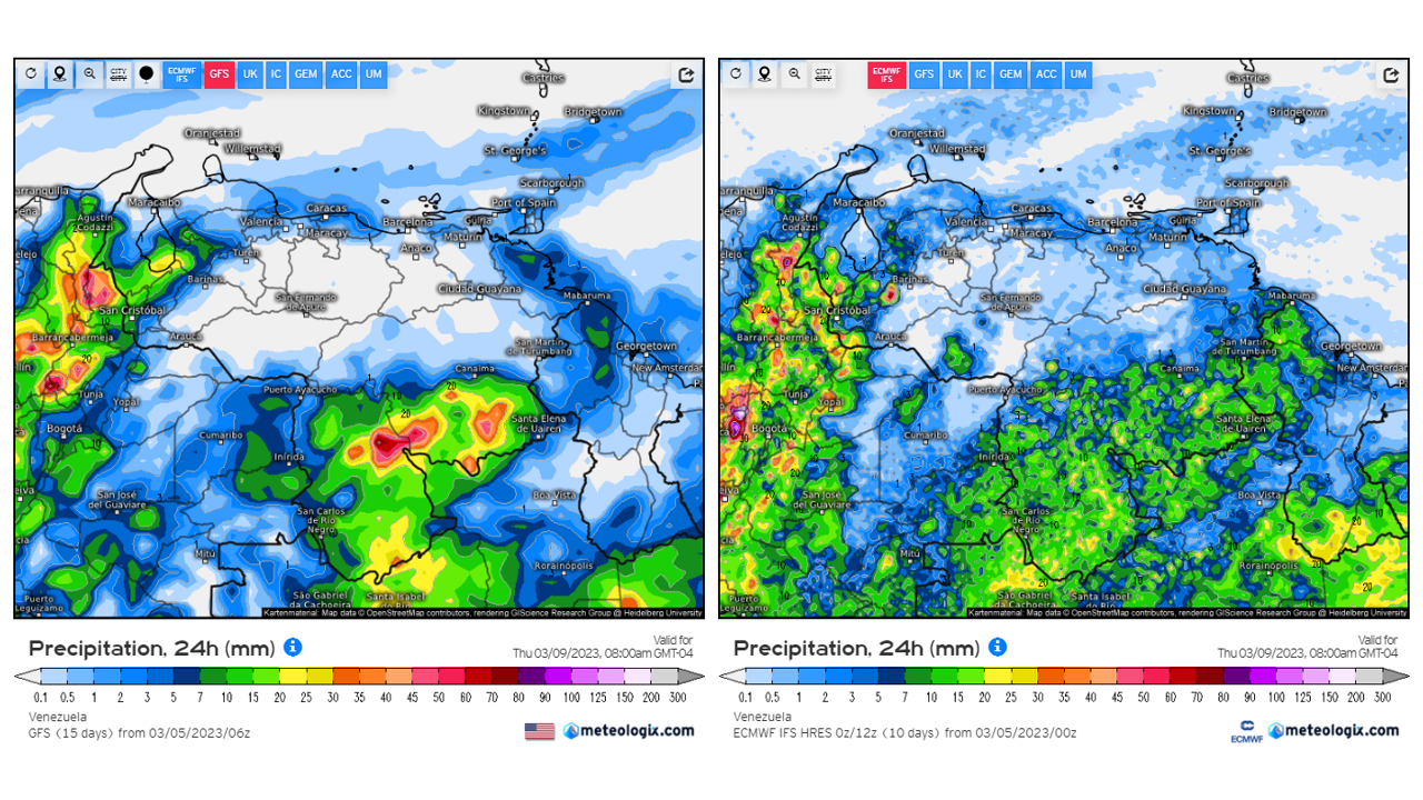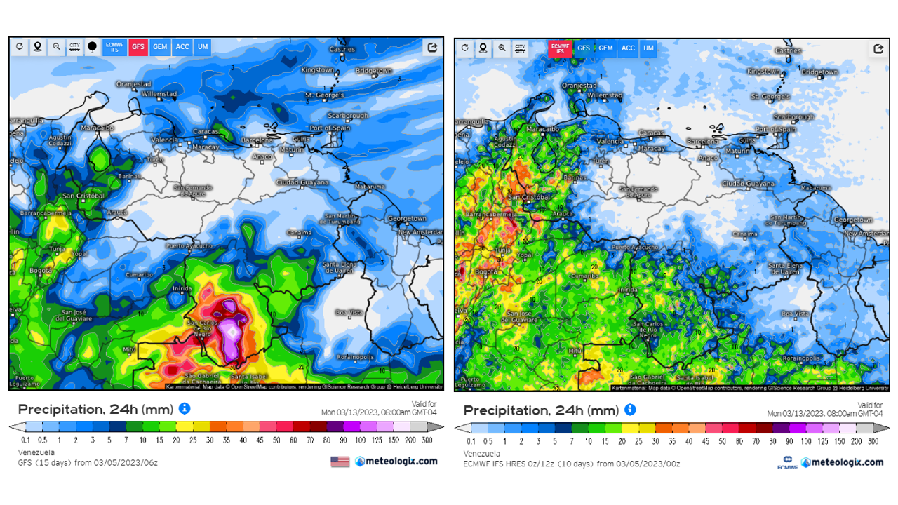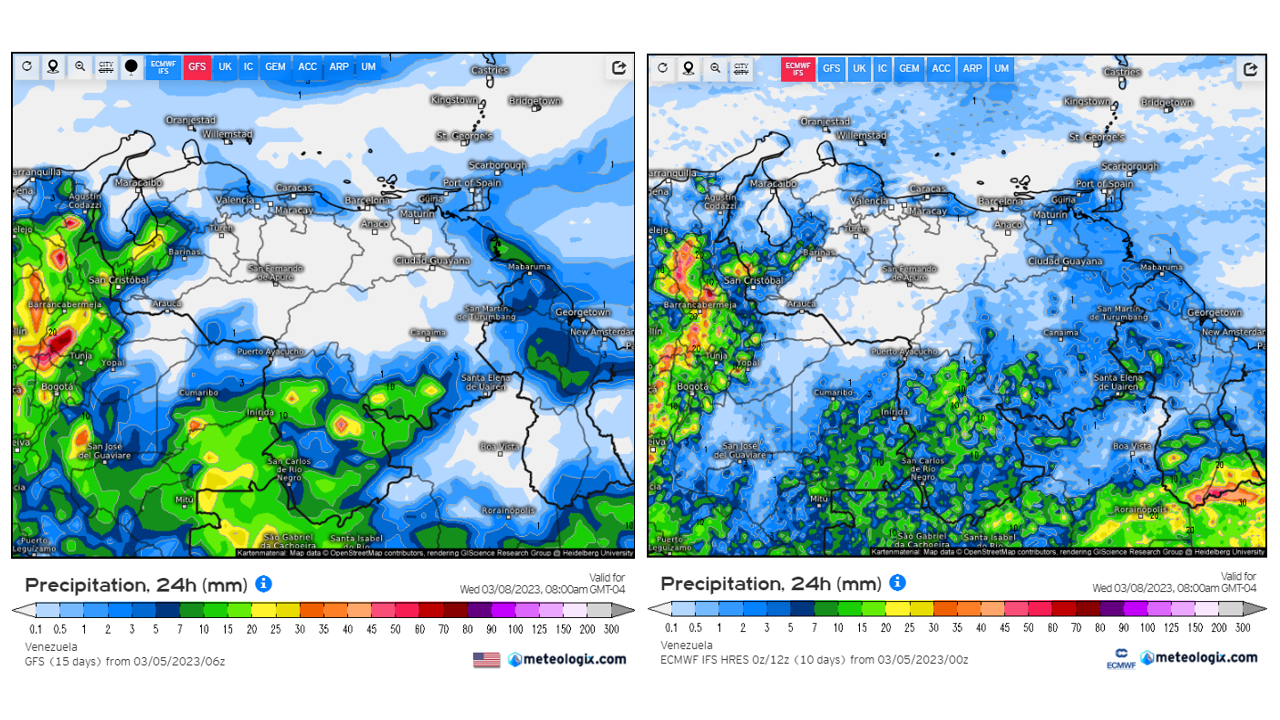 Estado del sur (Bolívar y Amazonas). En la semana se esperan que los eventos sean moderados, lo más importantes se deben presentar al sur de Amazonas y sur de Bolívar. La semana comienza con escasos eventos de precipitaciones, pero se van reactivando en el transcurso de la semana, los más importantes entre martes y miércoles, luego se presentara una reducción paulatina de los eventos de precipitaciones sobre la región, reactivándose para el fin de semana.