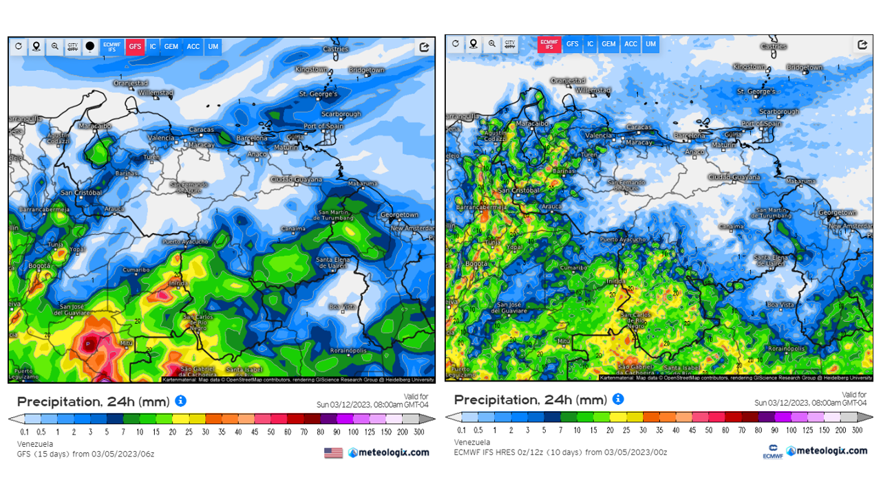 De acuerdo a la estadística de la precipitación estimada ( NOAA NCEP CPC CMORPH, daily_calculated) durante el periodo del 05/03 al 01/04/2023, se observa en general que los principales eventos de precipitaciones ocurren al sur del país (Amazonas y Bolívar), el oeste de Zulia comienza presentar eventos de precipitaciones con centros hasta 15 mm. Para la semana del 05/03 al 25/04, los eventos por encima de los 40 mm se ubican al sur de los 3° norte, se observa incremento de los totales de lluvia semanal hacia el suroeste de Zulia, se aprecian los primero eventos de precipitaciones en en el occidente del país y llanos occidentales, en el orden de los 5 mm.