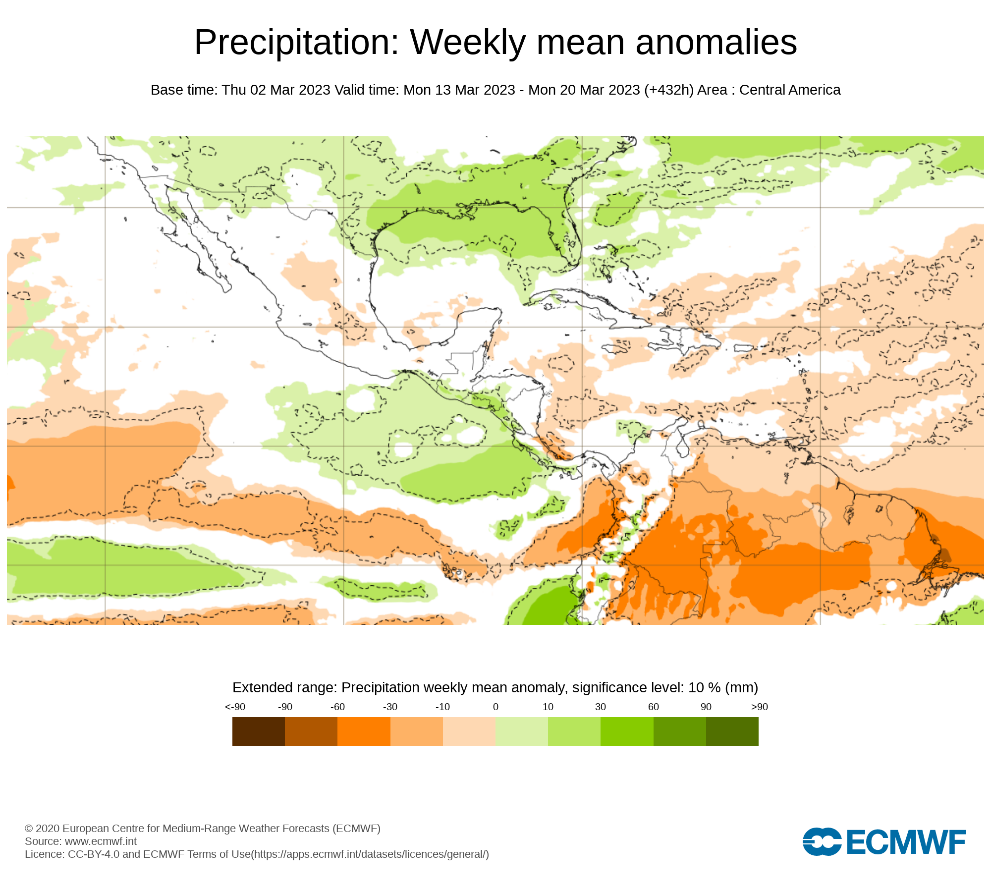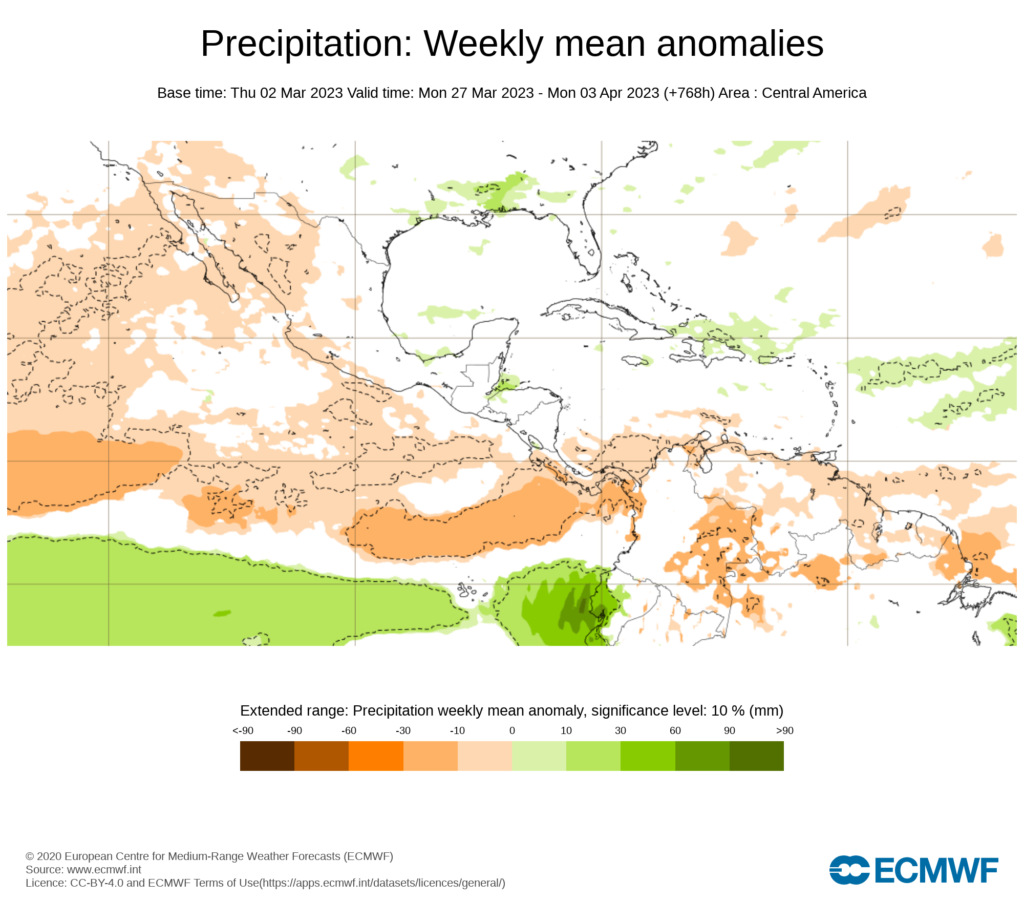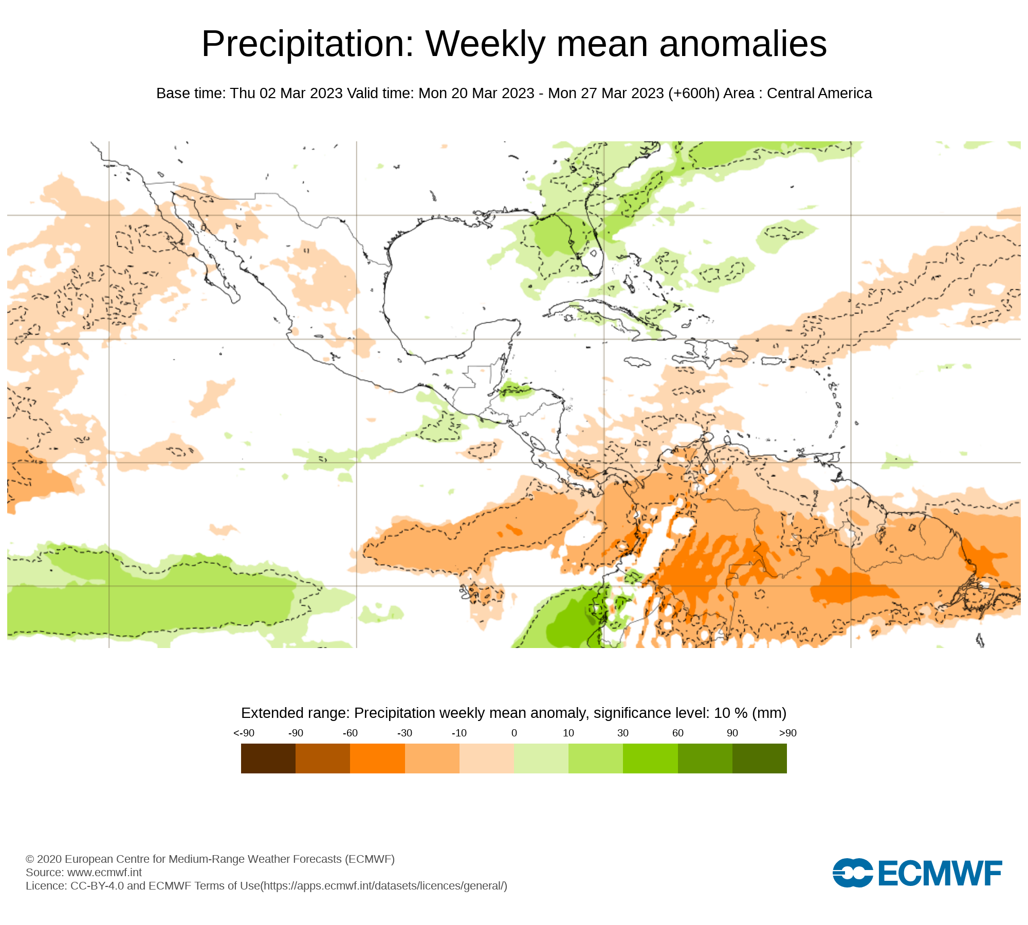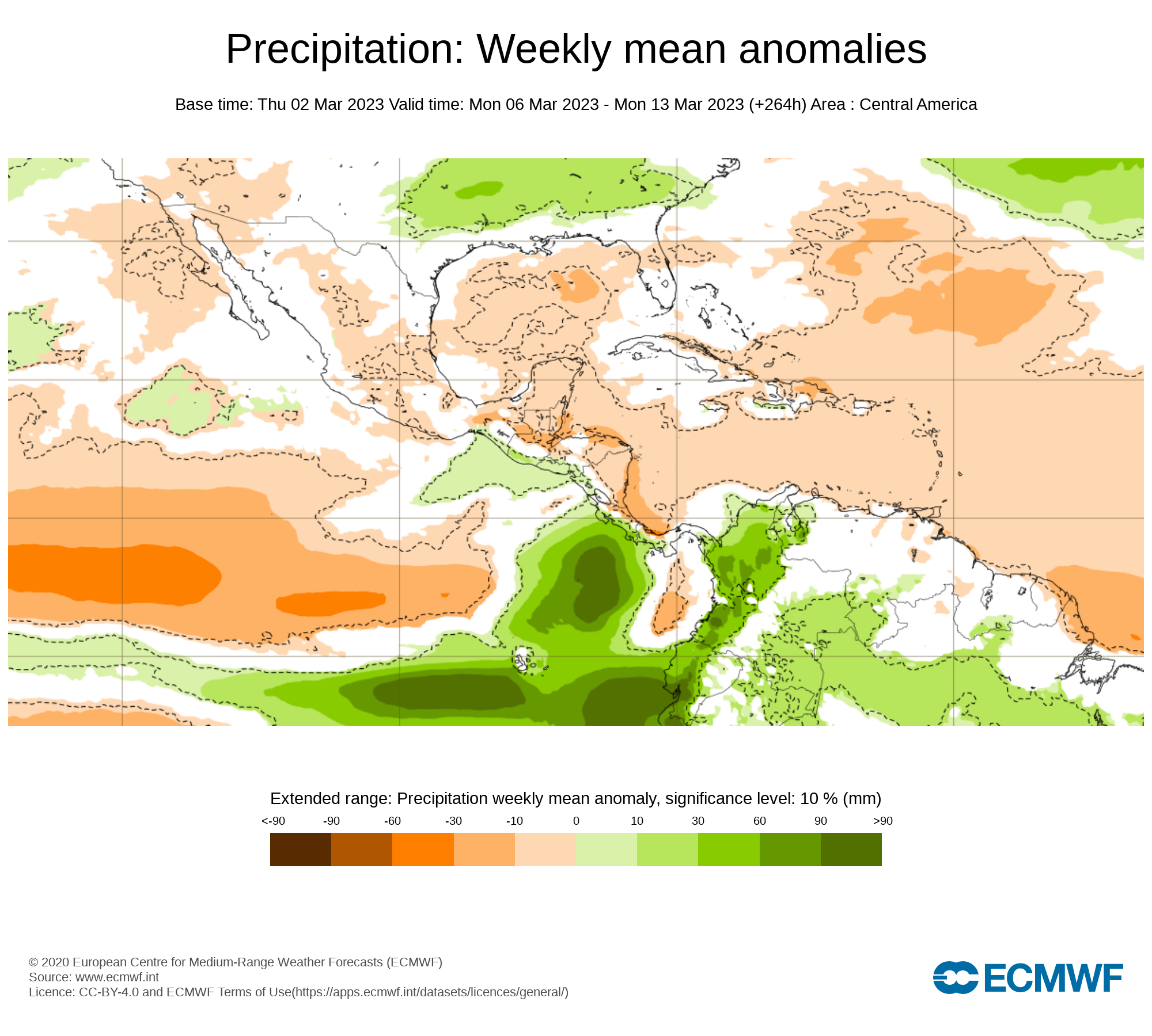 El pronostico semanal emitido por European Centre for Medium-Range Weather Forecast (ECMWF), se esperan eventos de precipitaciones promedio sobre el territorio nacional. Con anomalías negativas al sur del país