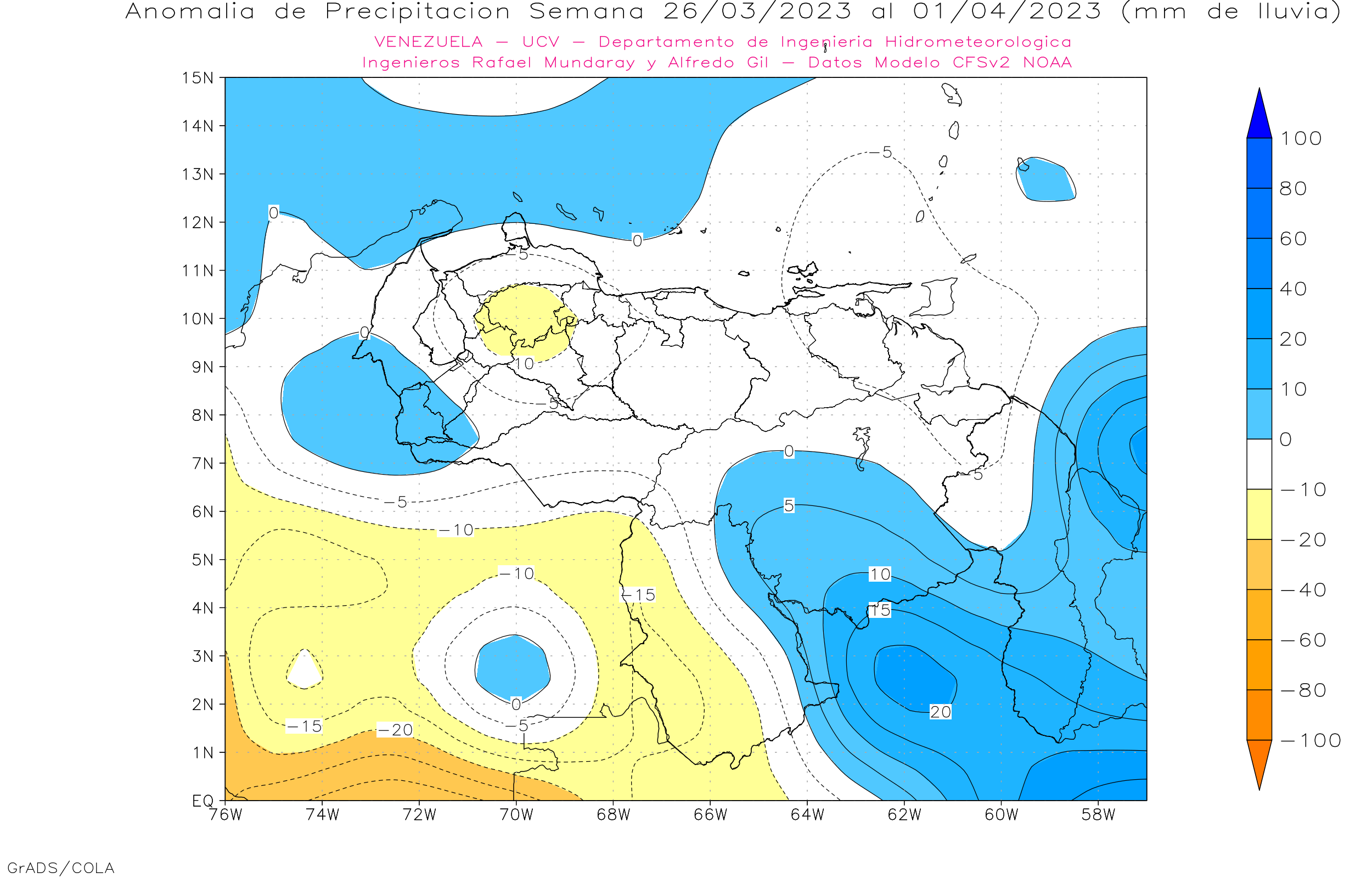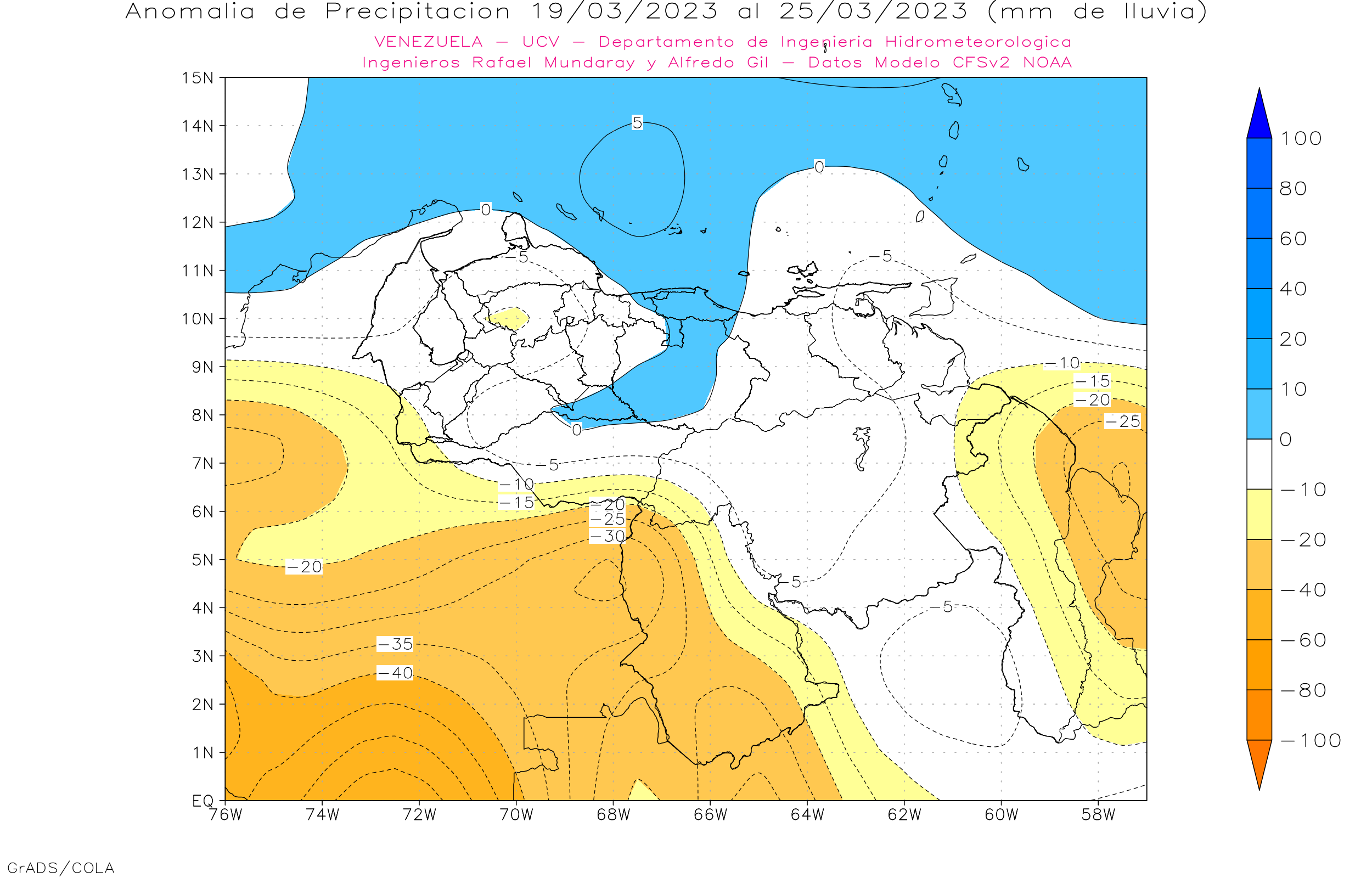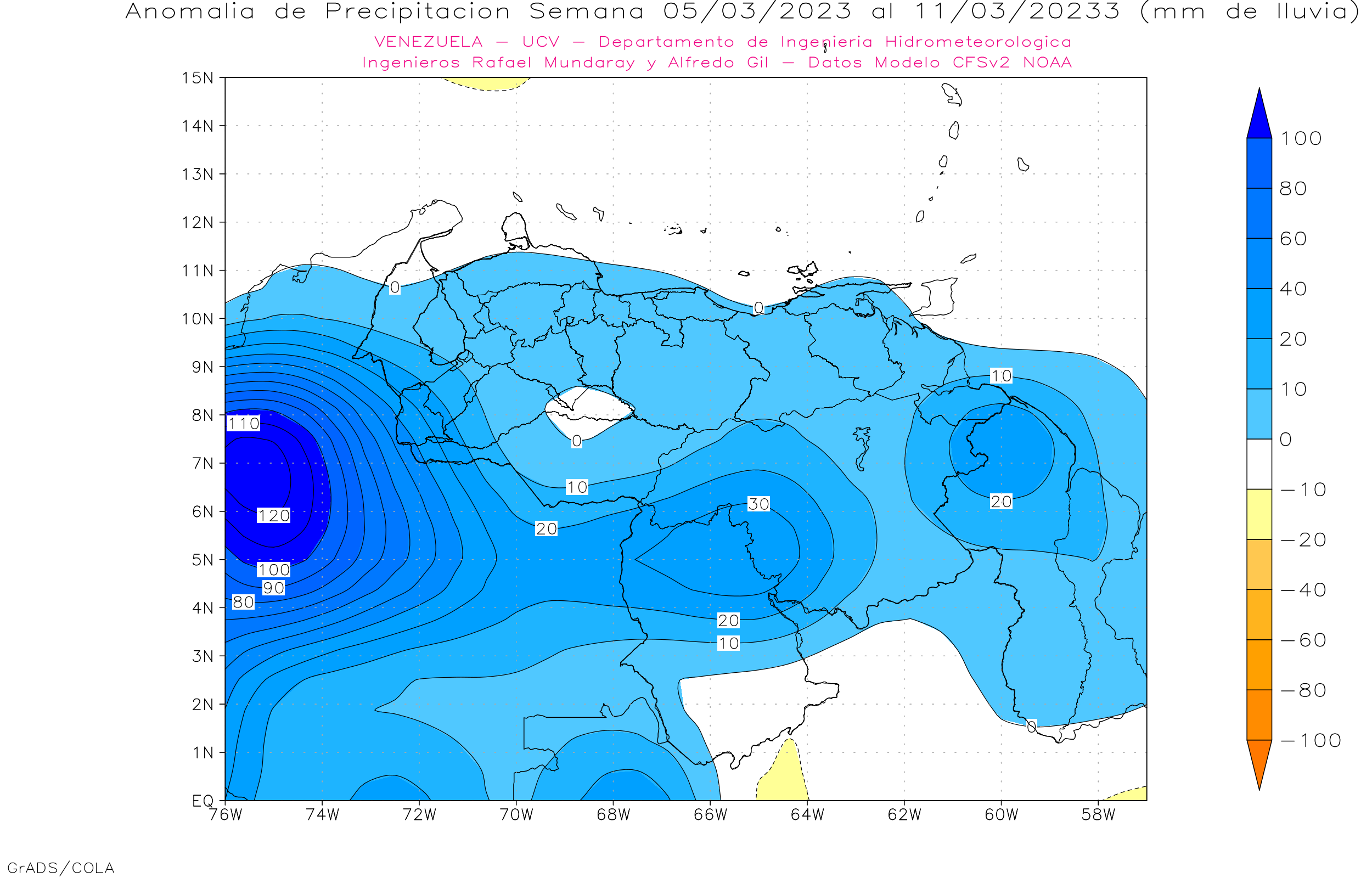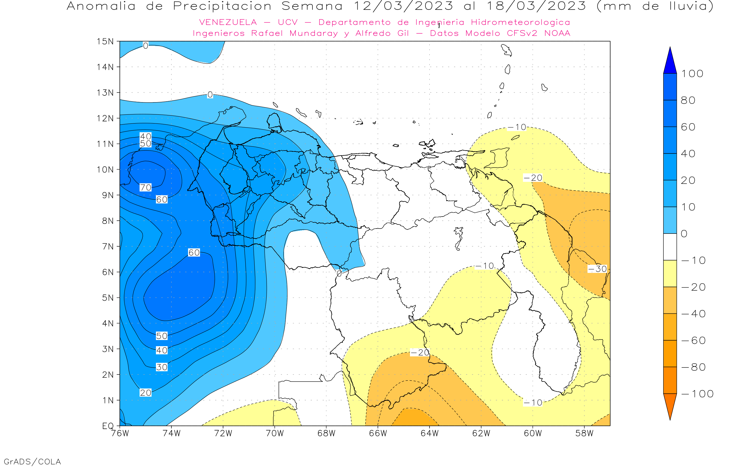 Pronostico de Anomalías Semanales para Venezuela, del 05/03 al 01/04/2023, usando datos del Modelo CFSv2 de NOAA y ECMWF.