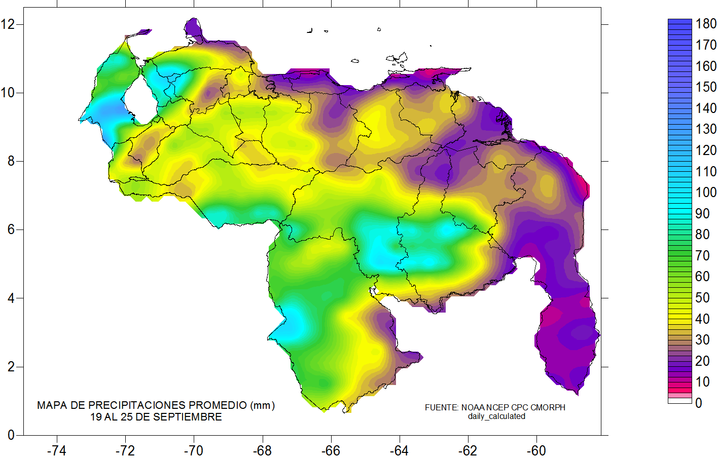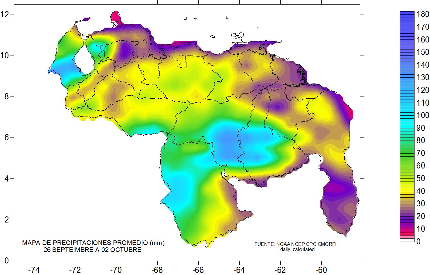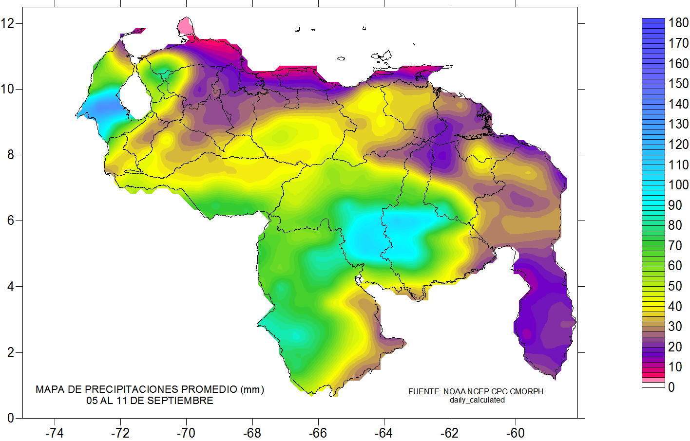 De acuerdo a la estadística de las precipitaciones estimadas para esta semana, se observa que los eventos más importantes se mantiene al sur del país, suroeste y noroeste de Zulia, sureste de Falcón y sur de Apure . Ya se observa que las lluvias por encima de los 70 mm se ubican al sur de 7 norte, debilitándose las lluvias a lo largo de la cordillera andina, Falcón, cuenca baja del Caroní, Lara, llanos occidentales, Monagas, Sucre, Miranda, norte de Aragua, noreste de Bolívar y sureste de Amazonas.