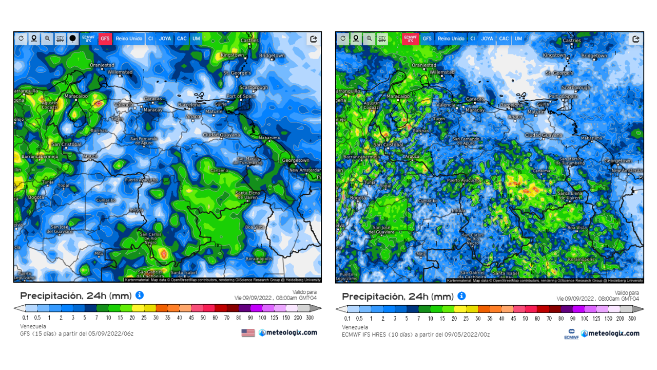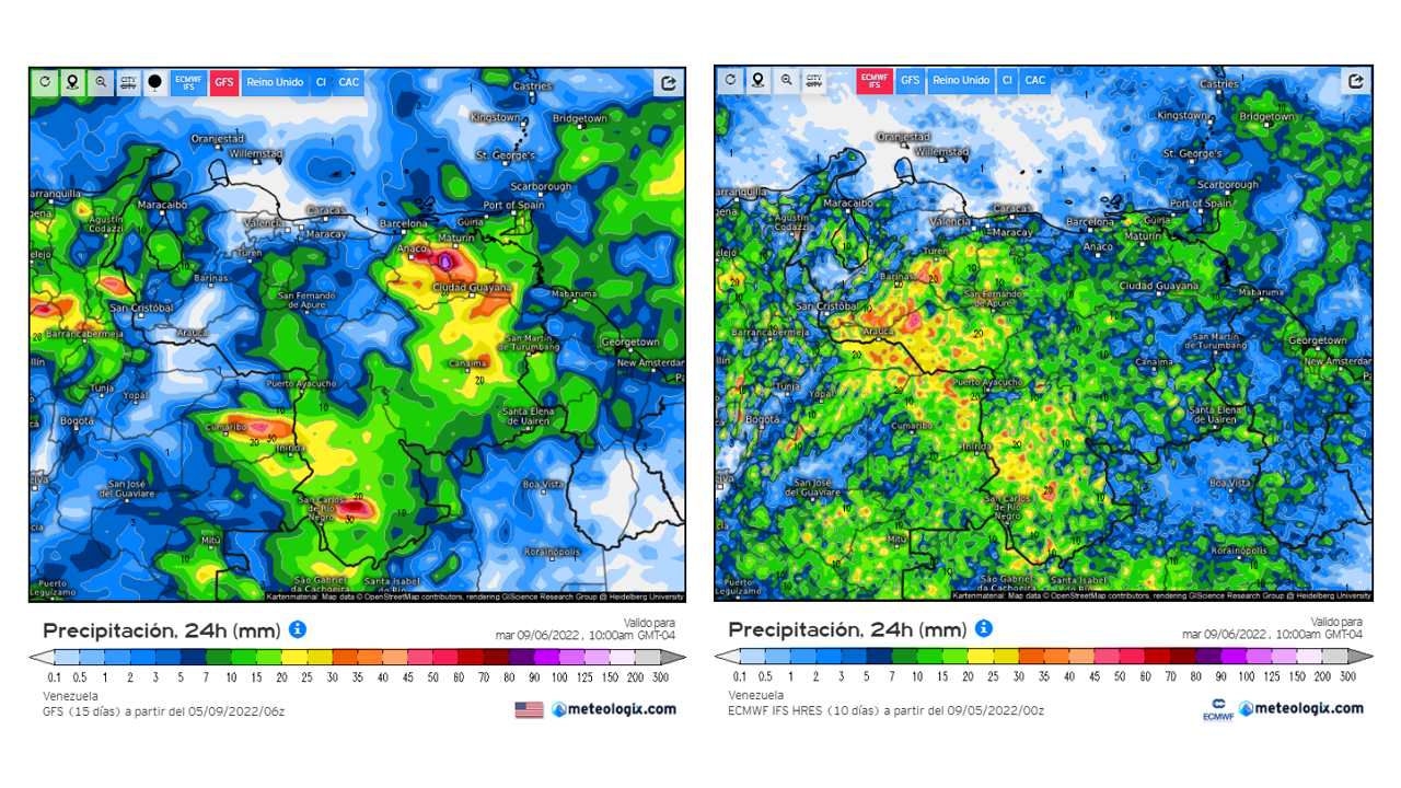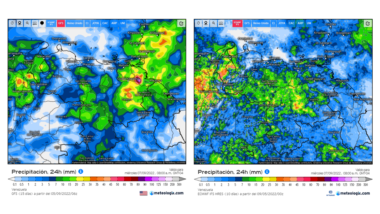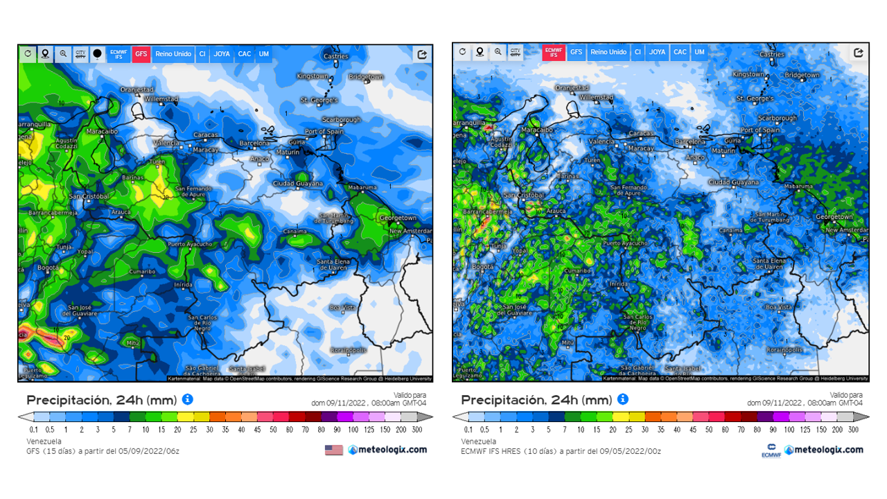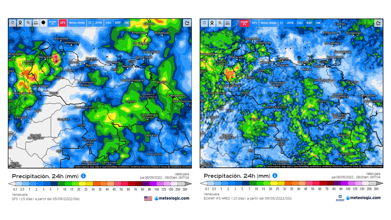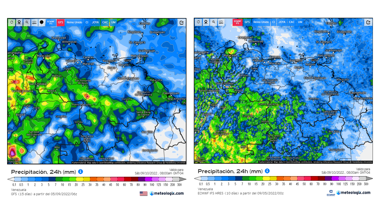 El modelo GFSv2 prevé en general eventos de precipitaciones dentro del promedio histórico en casi todo el territorio nacional. Las anomalías positivas mas importantes en la costa oriental Zulia.