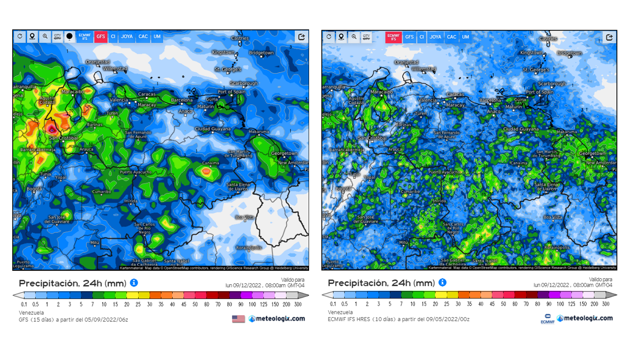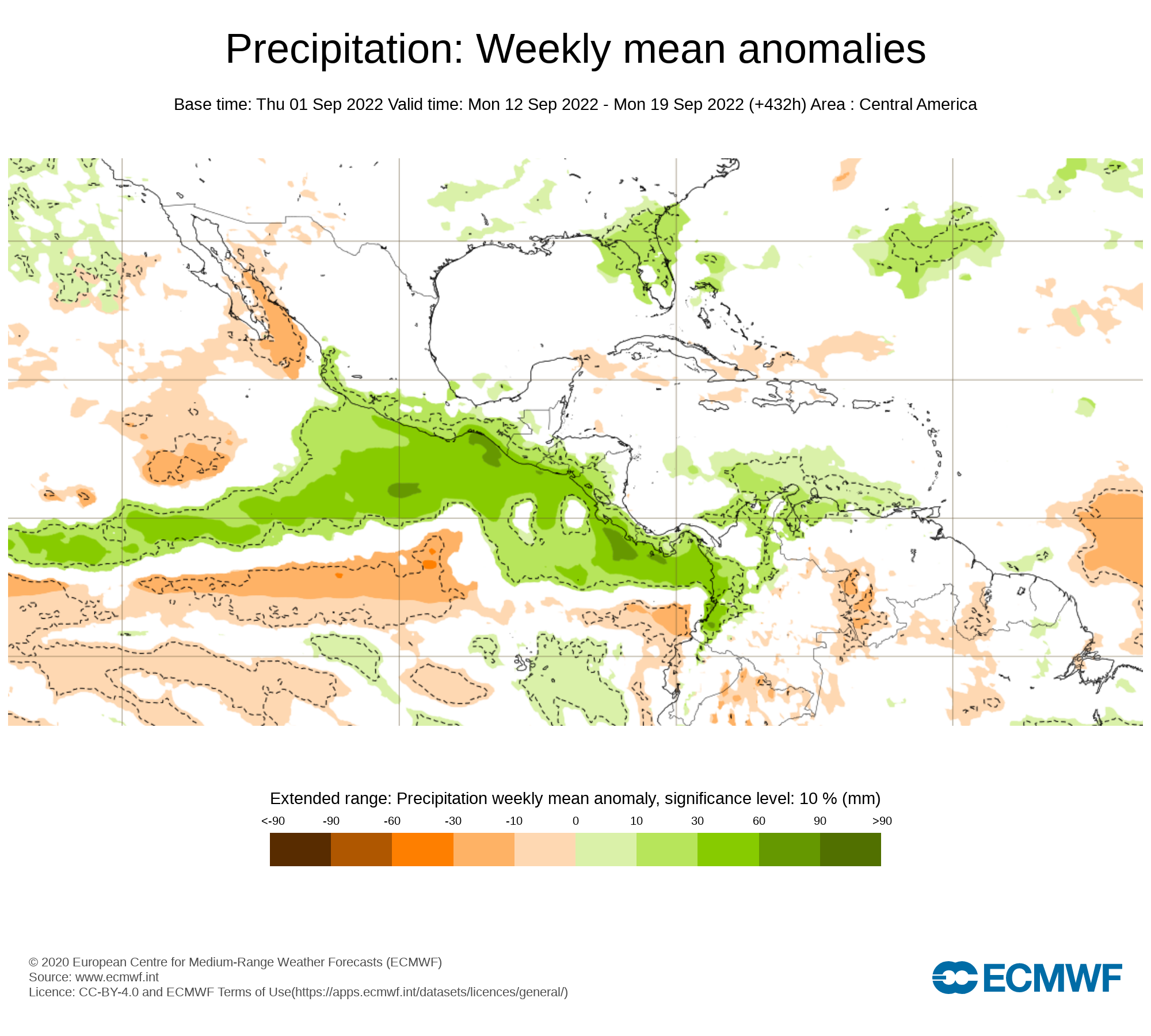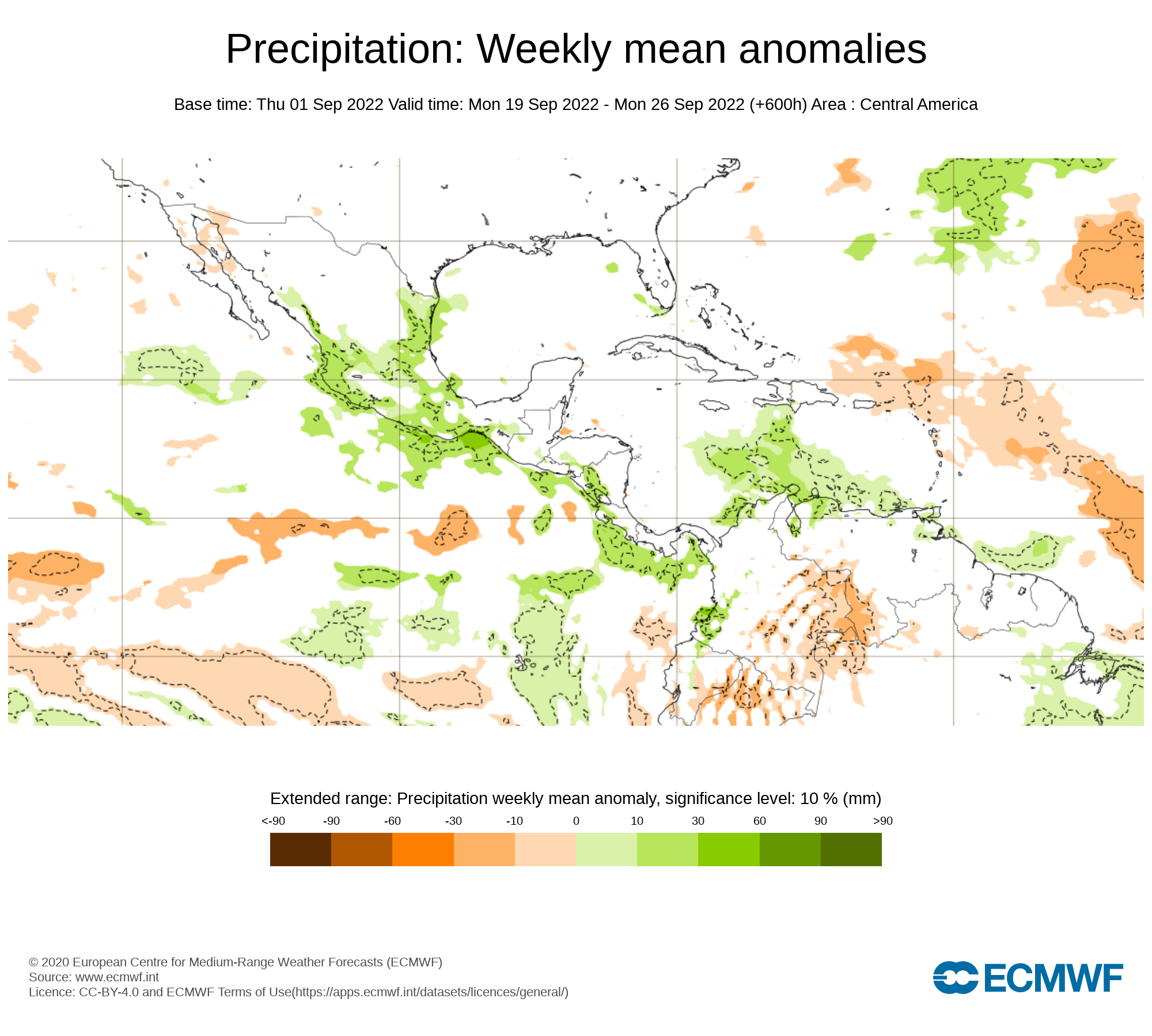 El pronostico semanal emitido por European Centre for Medium-Range Weather Forecast (ECMWF), se esperan eventos de precipitaciones promedio sobre el territorio nacional, las anomalías positivas mas importantes se esperan en Zulia, Falcón y los andes.