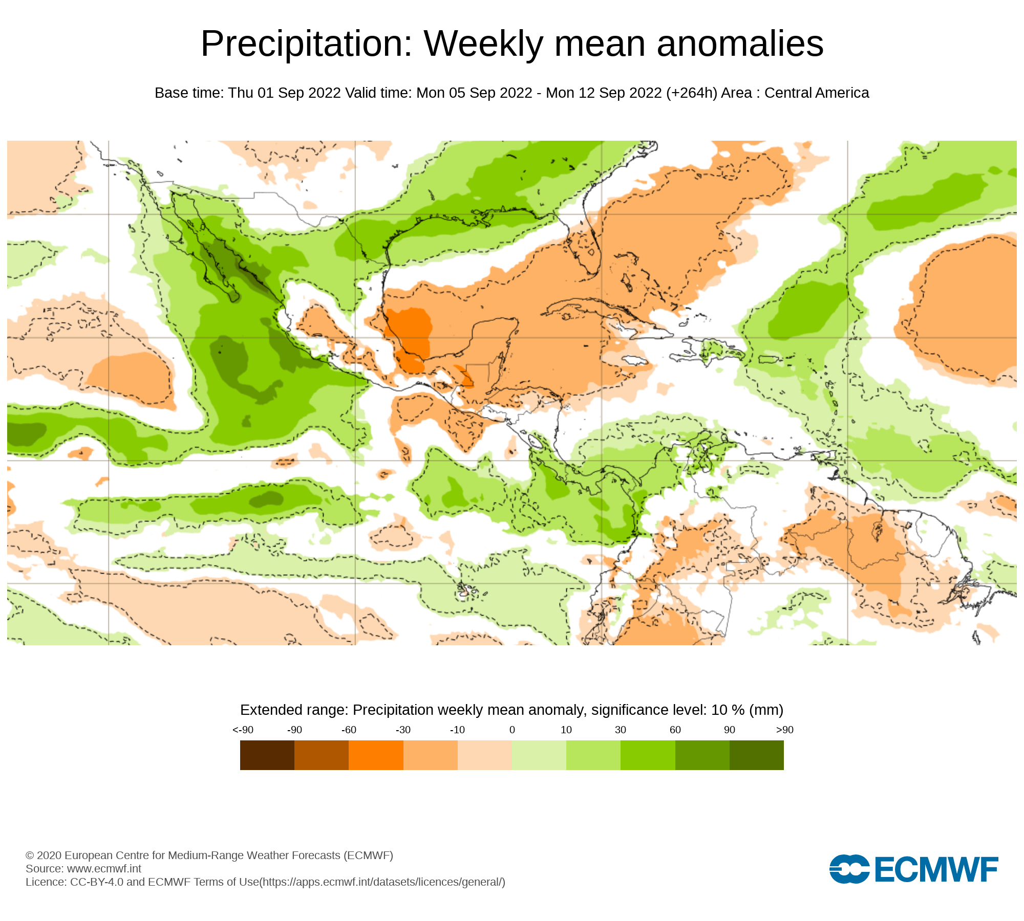 El pronostico semanal emitido por European Centre for Medium-Range Weather Forecast (ECMWF), se esperan eventos de precipitaciones promedio sobre el territorio nacional.