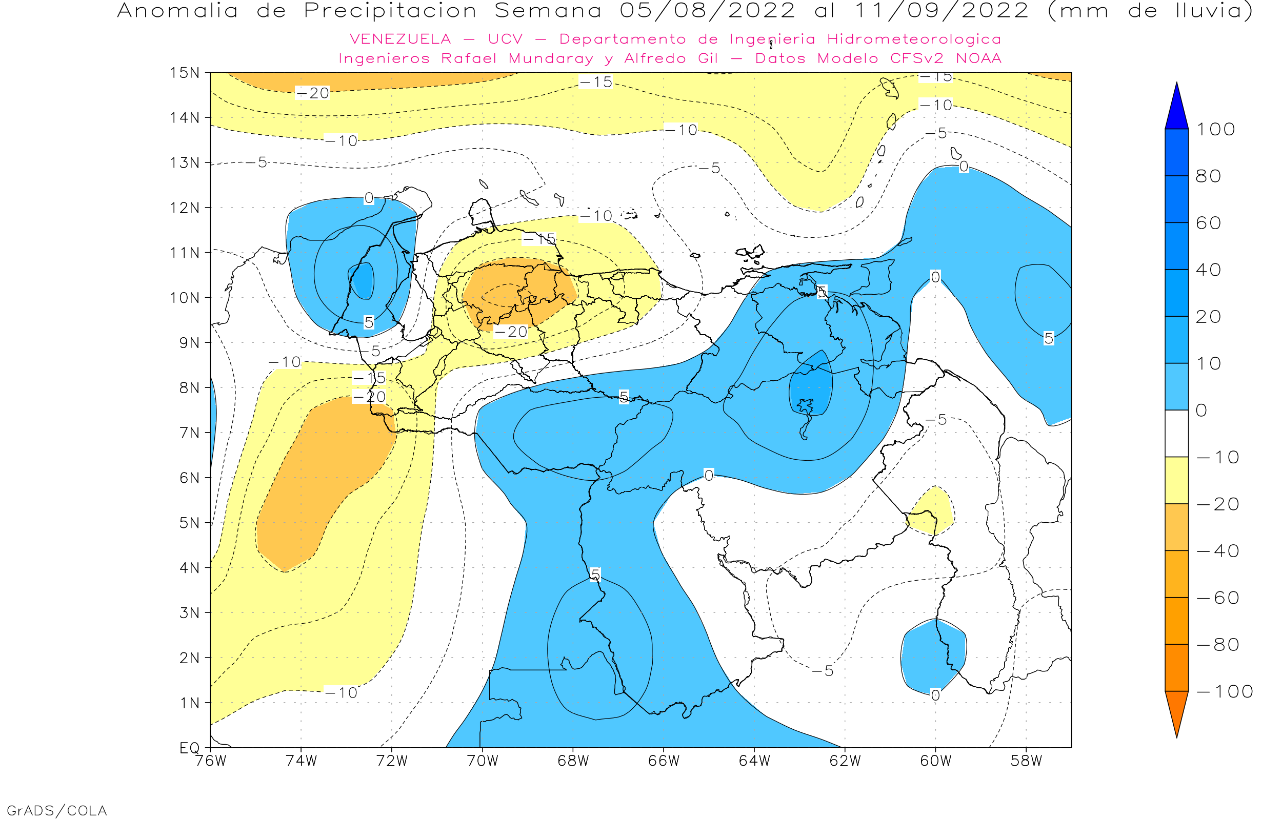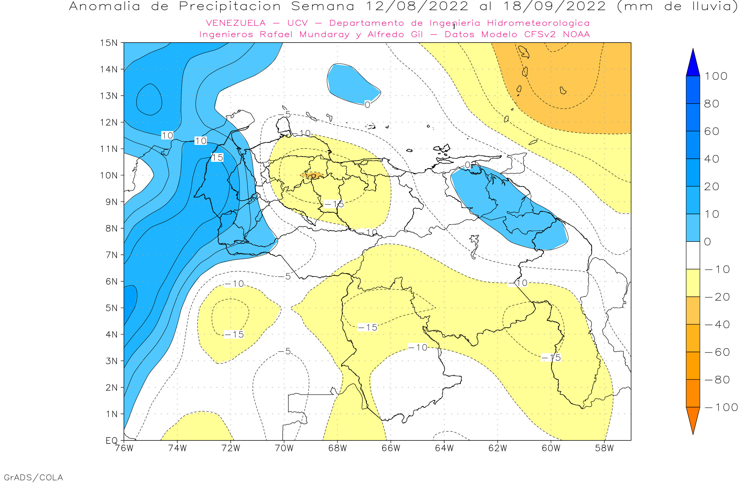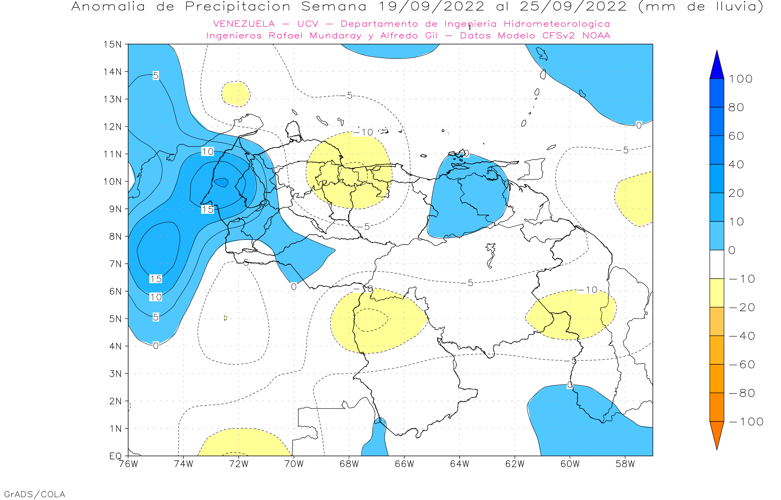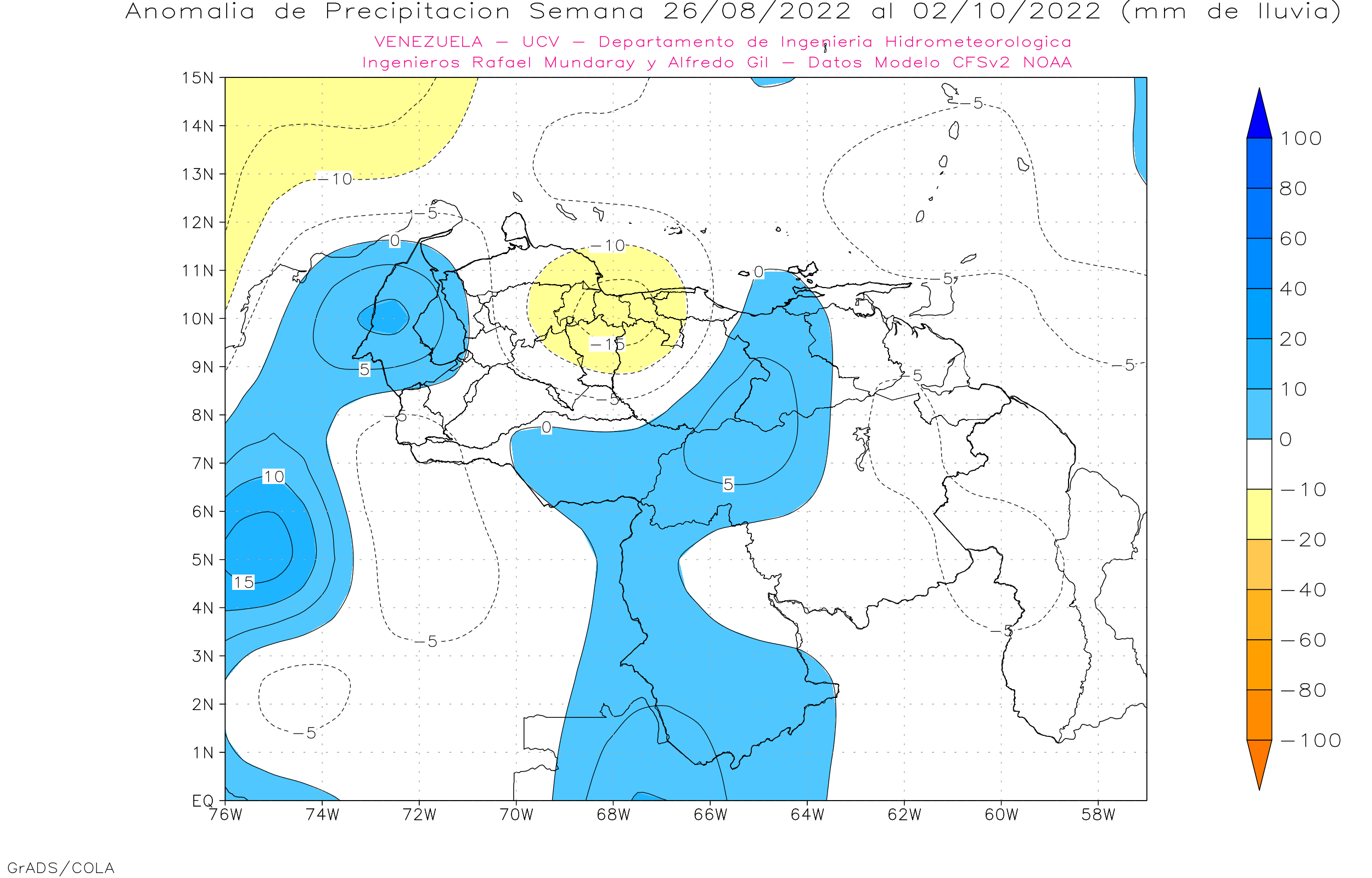 Pronostico de Anomalías Semanales para Venezuela, del 05/09 al 02/10/22, usando datos del Modelo CFSv2 de NOAA y ECMWF.