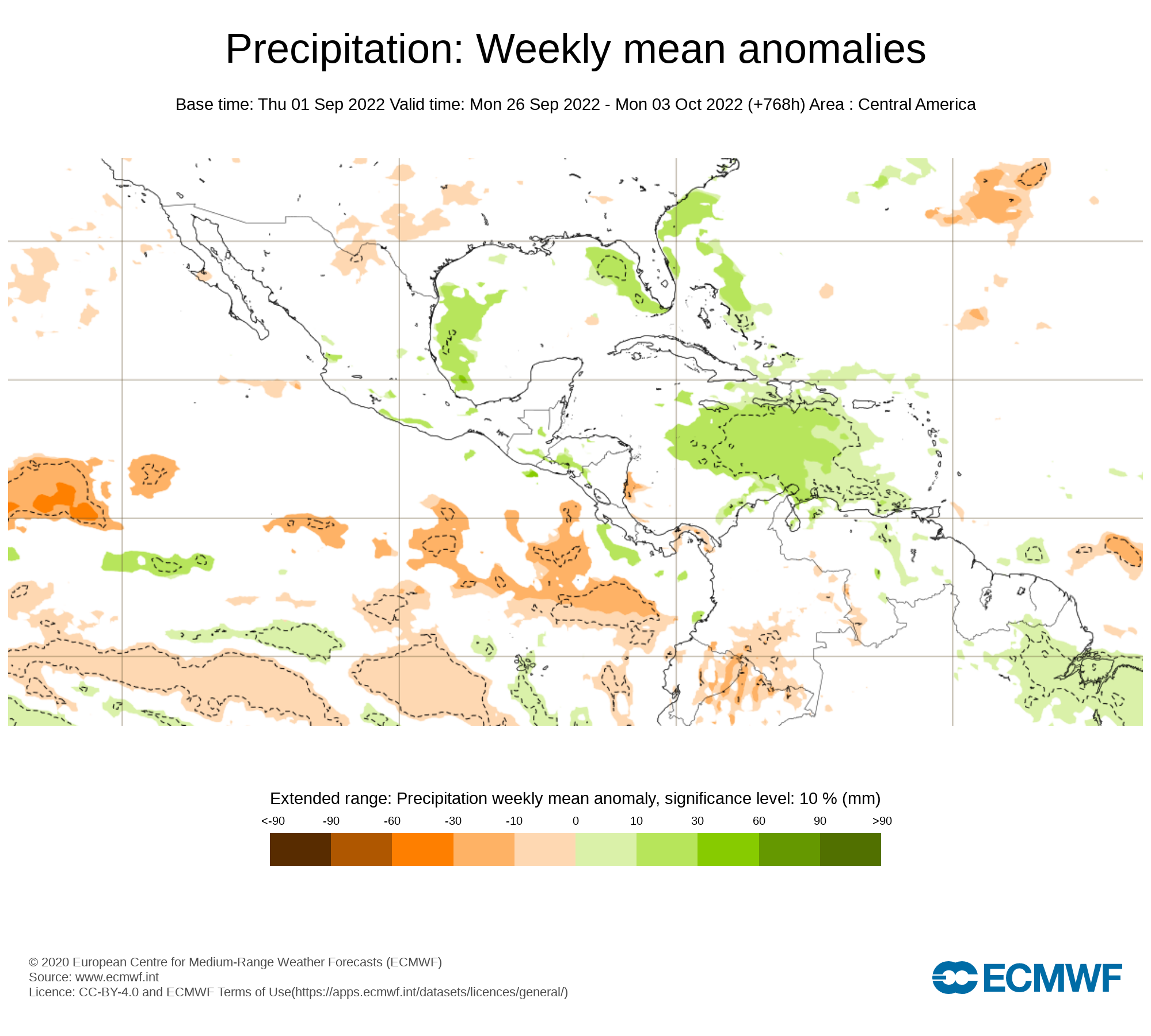 El pronostico semanal emitido por European Centre for Medium-Range Weather Forecast (ECMWF), se esperan eventos de precipitaciones promedio sobre el territorio nacional, las anomalías positivas mas importantes se esperan en Falcón y Zulia.