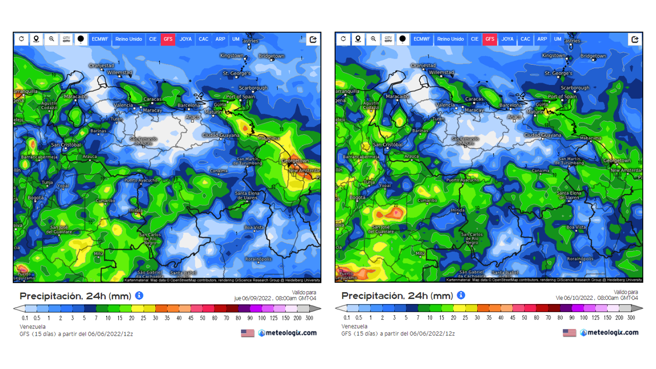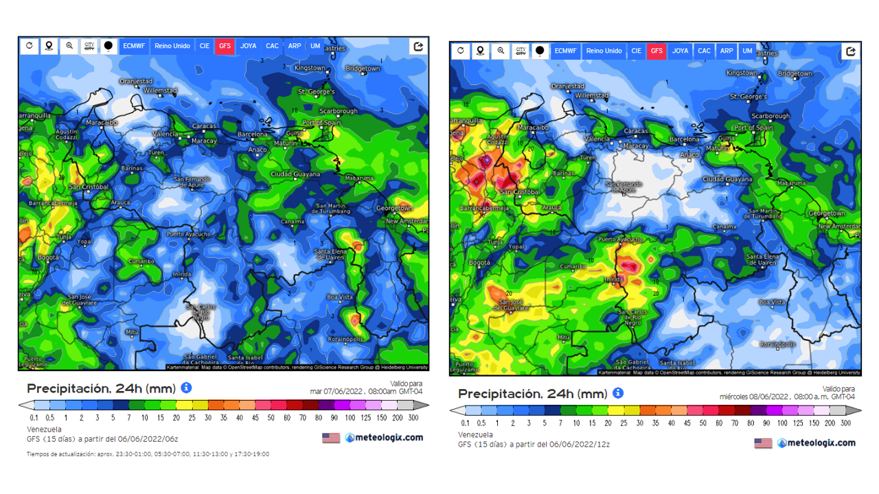 En el pronóstico diario del modelo GFS del 06 de junio al 02 de julio, se espera al sur (Bolívar y Amazonas), comience la semana con  eventos dispersos de precipitaciones en Amazonas  Bolívar, incrementándose hacia la mitad de la semana se van incrementando los eventos de precipitaciones y  esperándose hacia el fin de semana un incremento importante de las precipitaciones en Amazonas y hacia el sur de Bolívar.