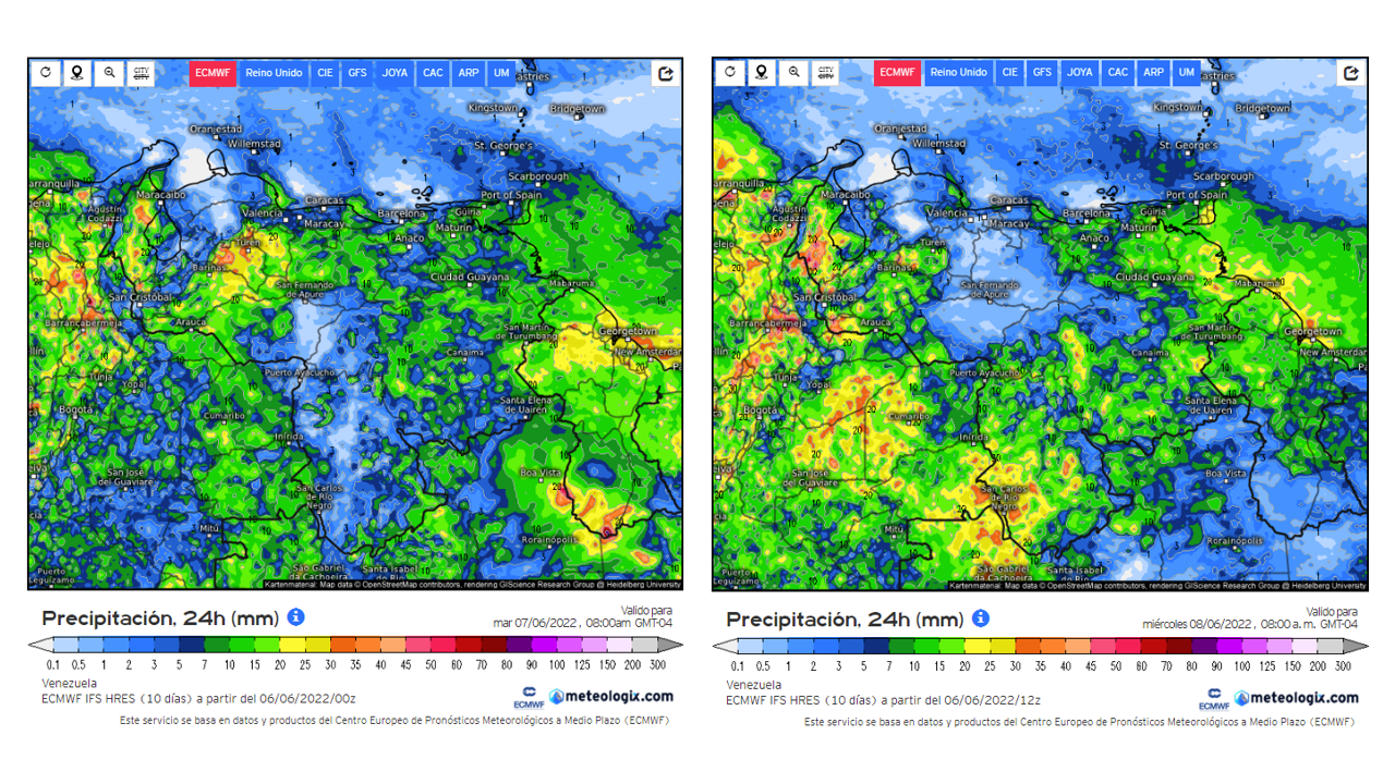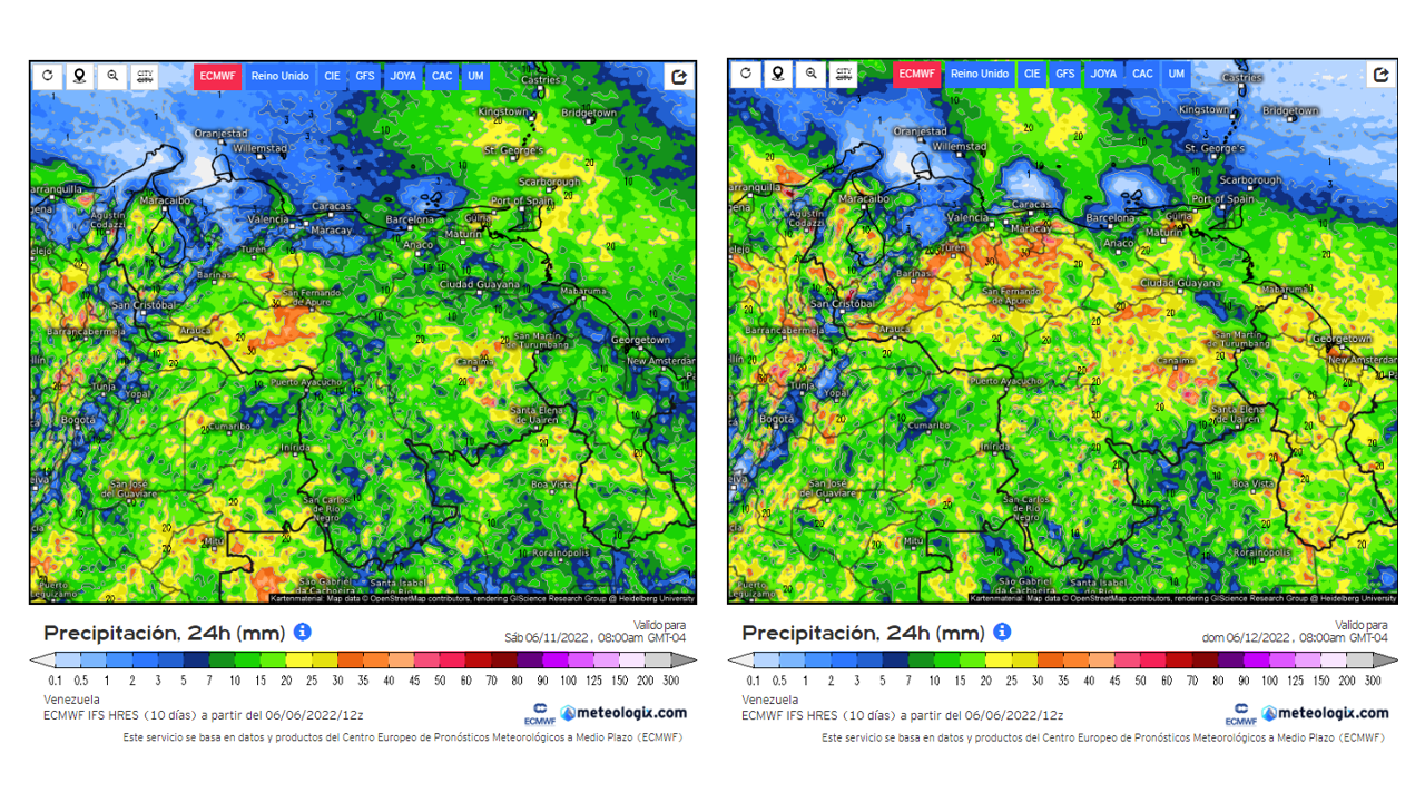 En el pronóstico diario del modelo ECMWF del 06 de junio al 02 de julio se espera al sur (Bolívar y Amazonas), a principio de semana se esperan eventos dispersos y de débil a moderada intensidad, esto eventos de van incrementadose en el transcursos de la semana, esperándose los eventos mas importantes hacia el fin de la semana.