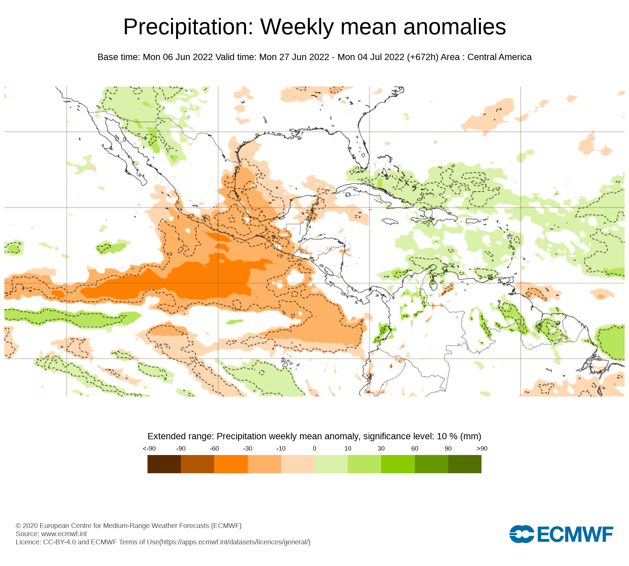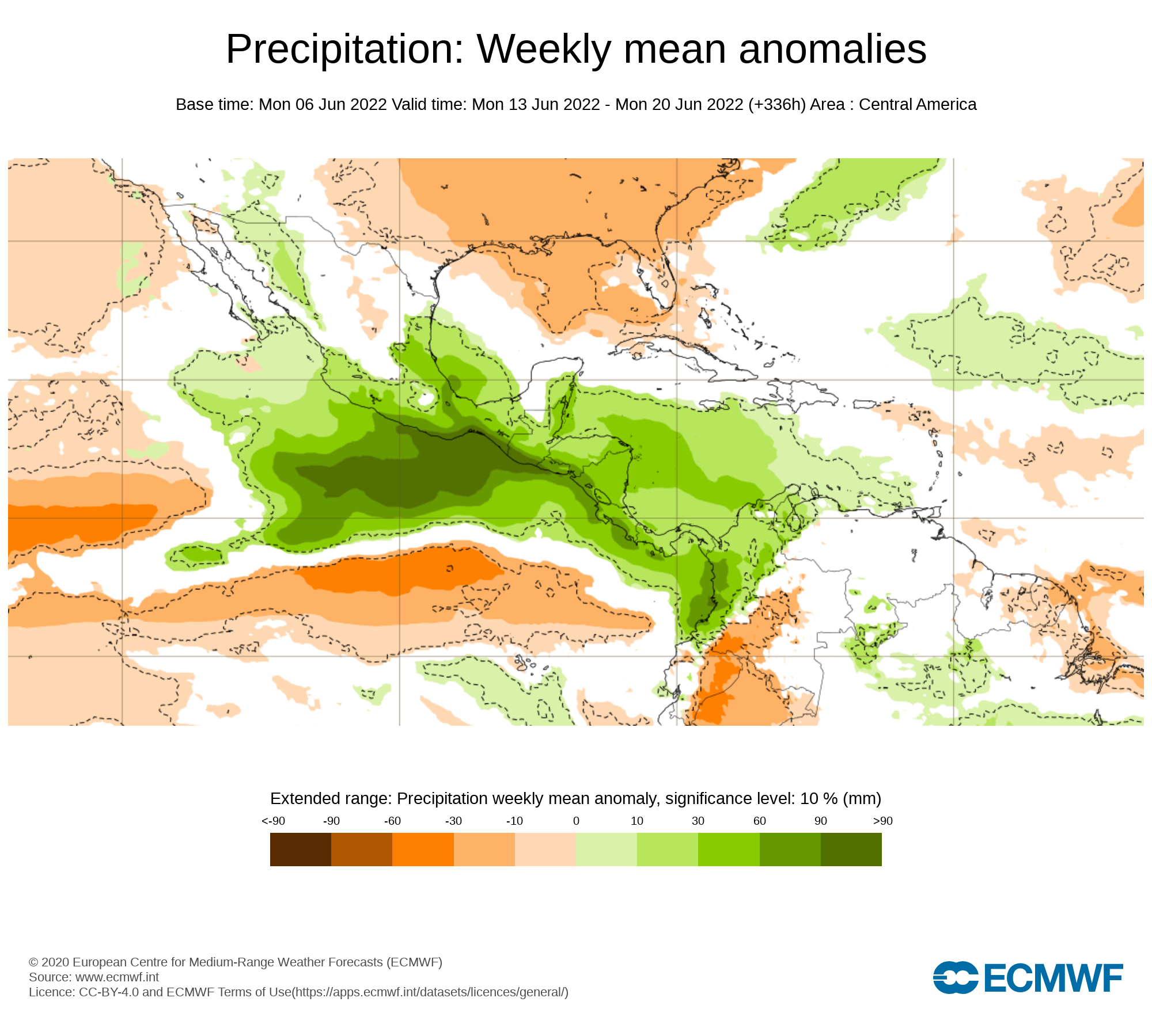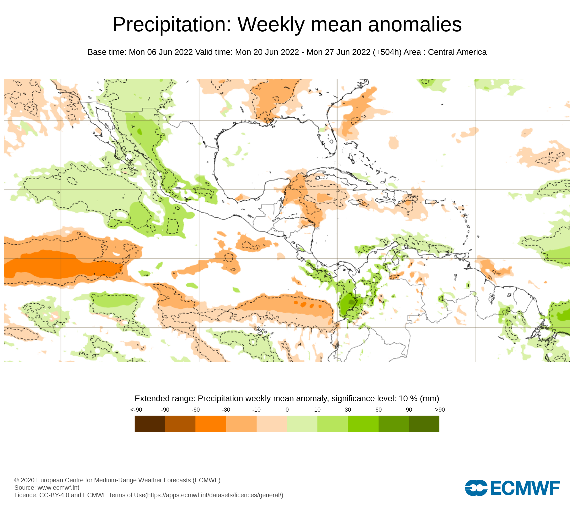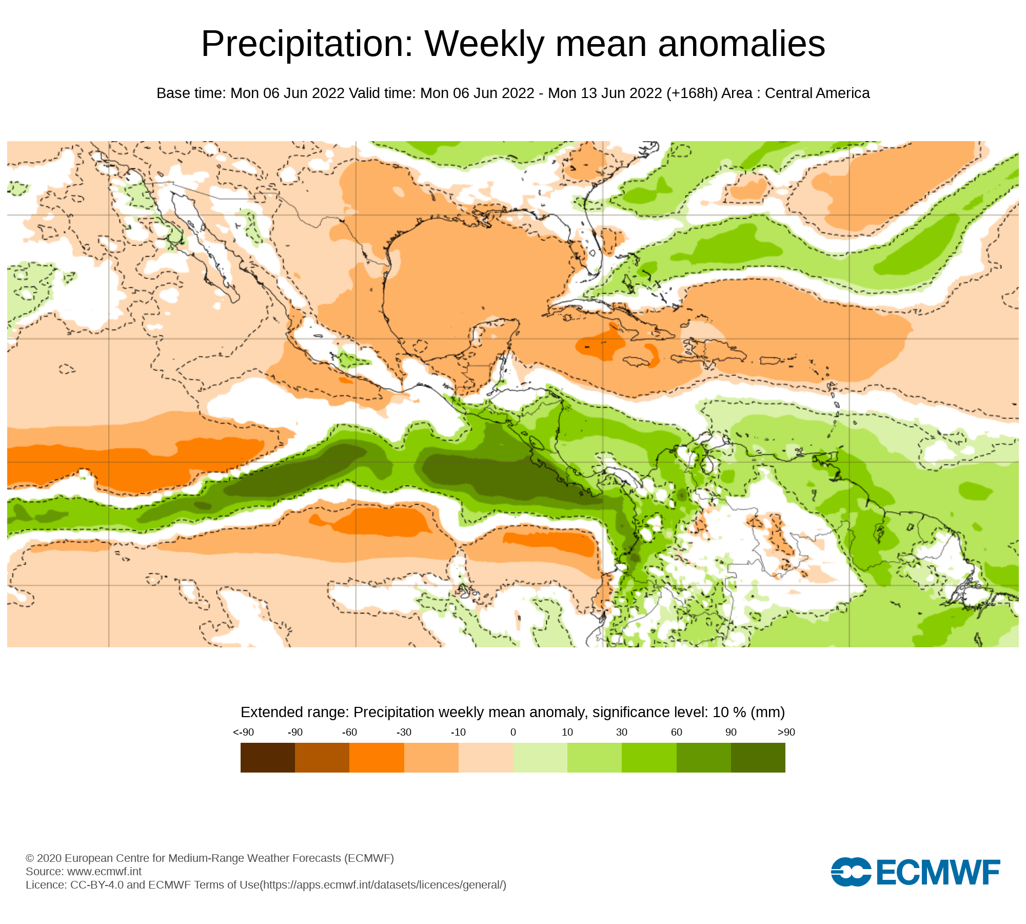 El pronostico semanal emitido por European Centre for Medium-Range Weather Forecast (ECMWF), se esperan eventos de precipitaciones  promedio y anomalías positivas en el oriente del país, Bolívar, llanos occidentales, los nades y estados occidentales.