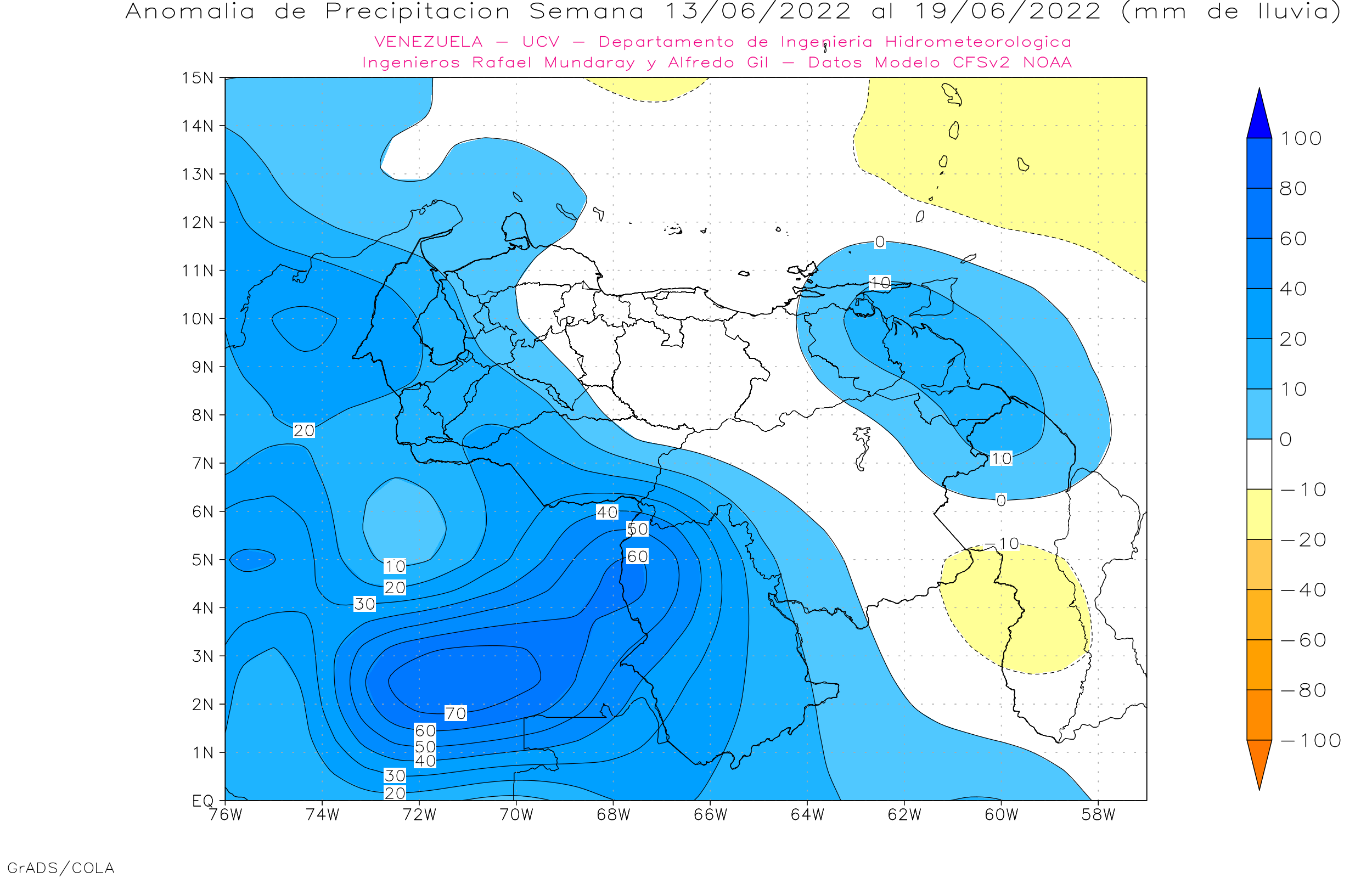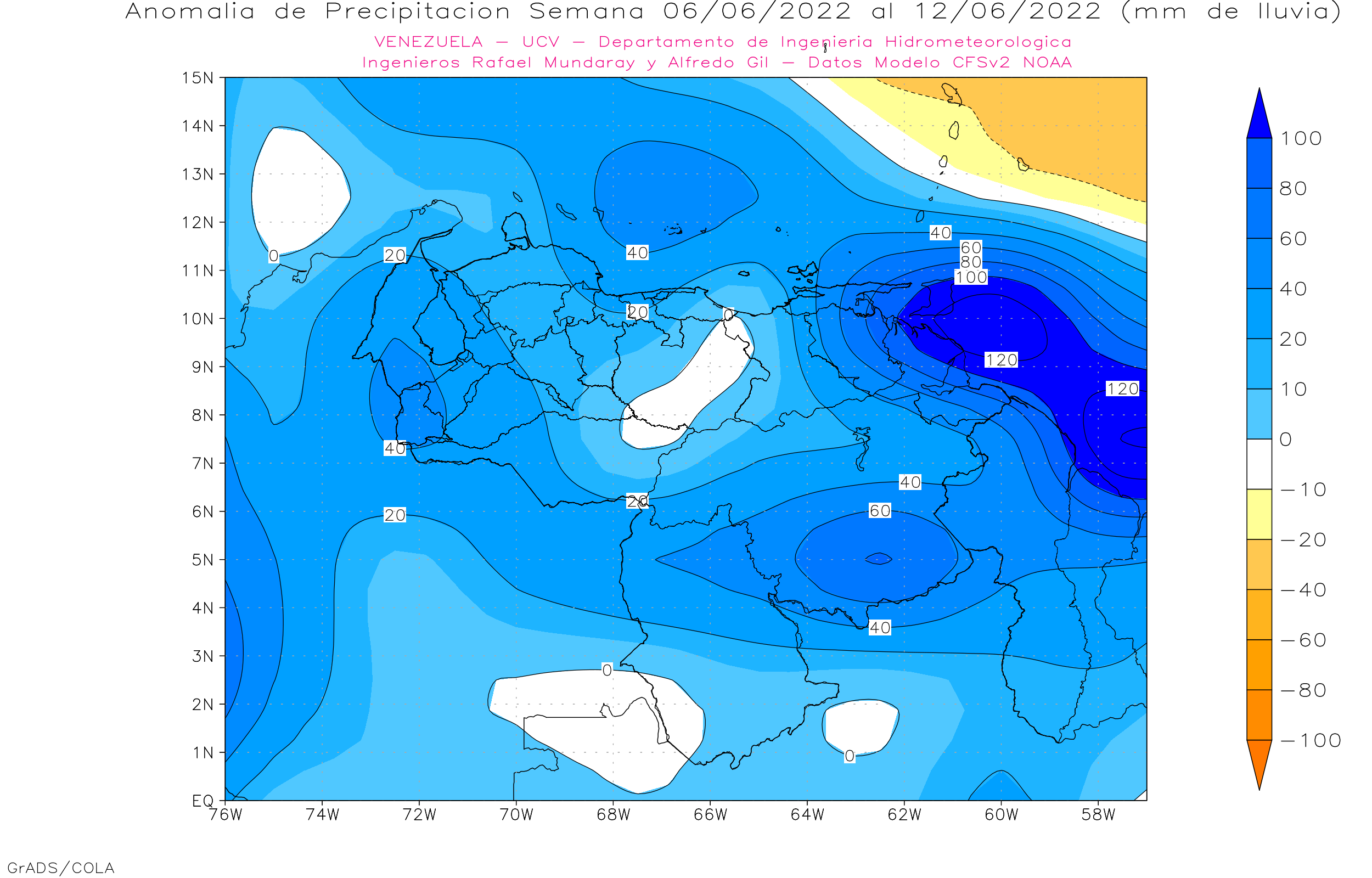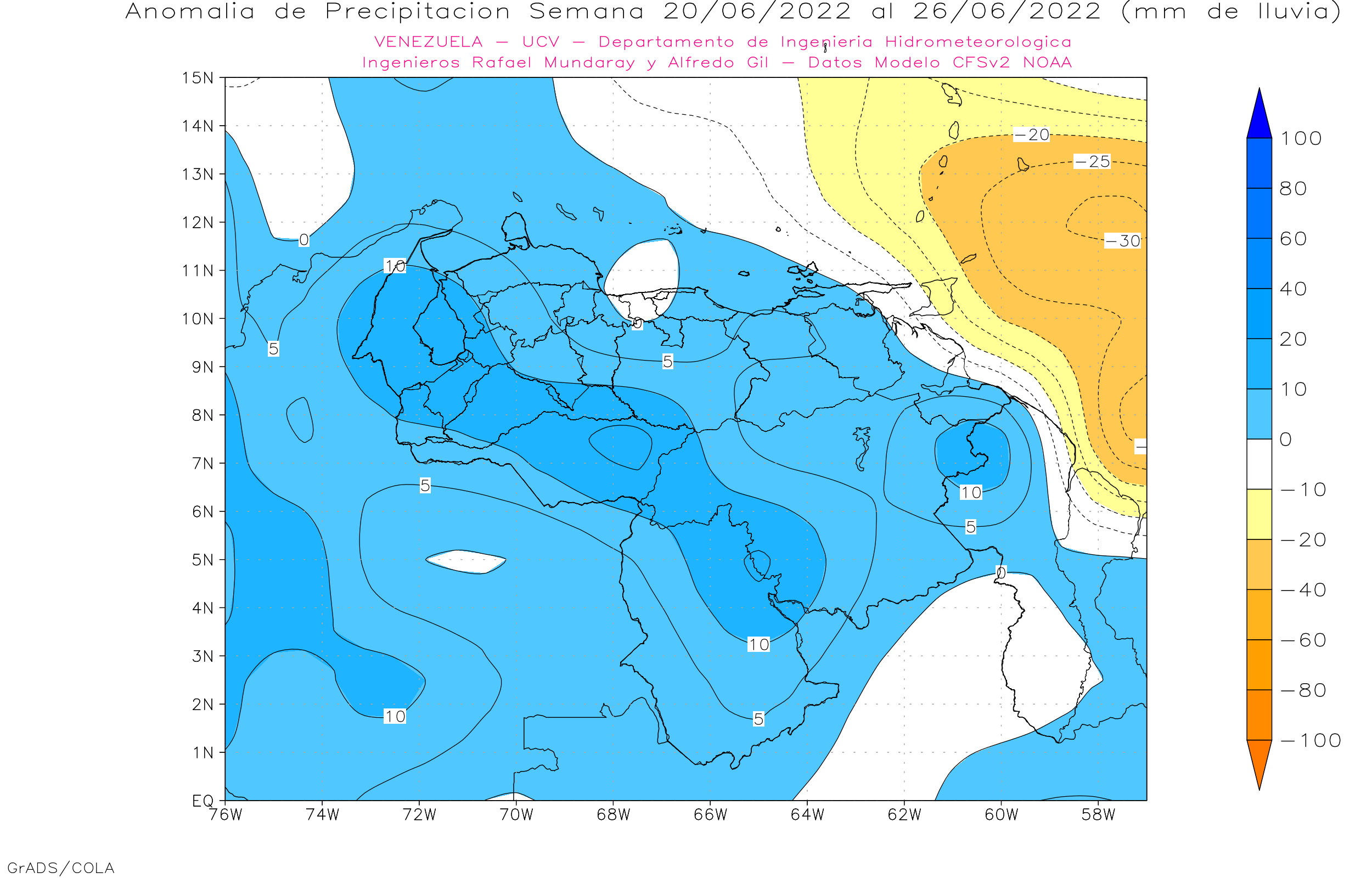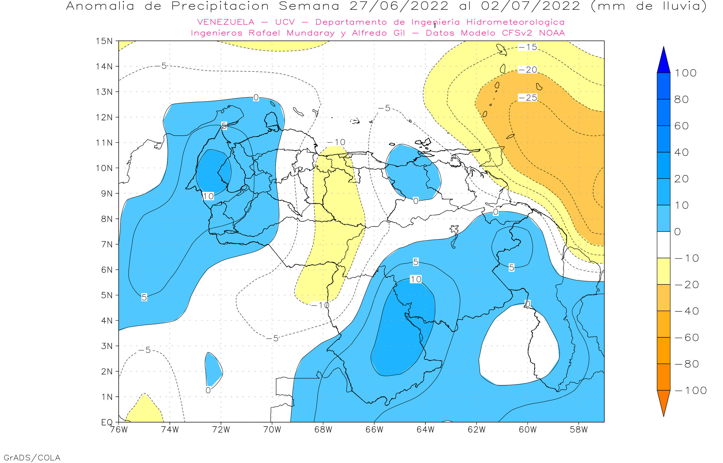 Pronostico de Anomalías Semanales para Venezuela, del 06/06 al 02/07/22, usando datos del Modelo CFSv2 de NOAA y ECMWF.