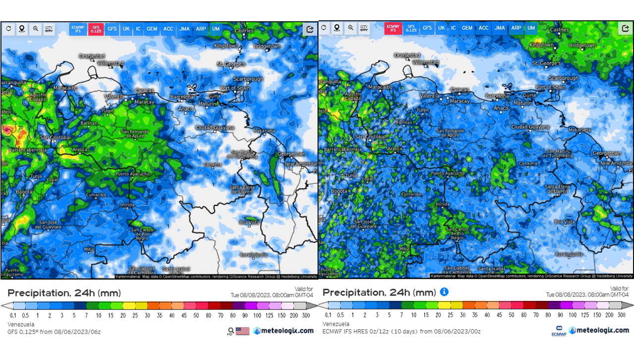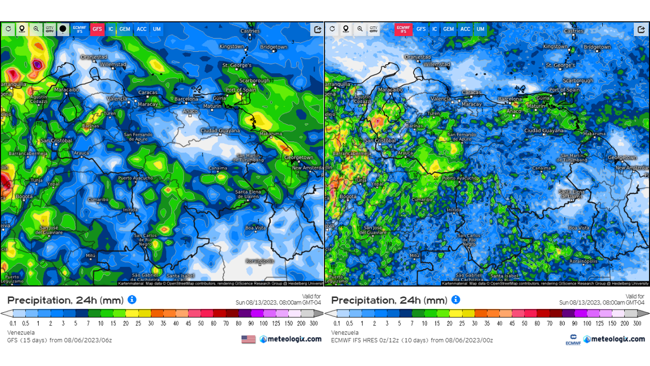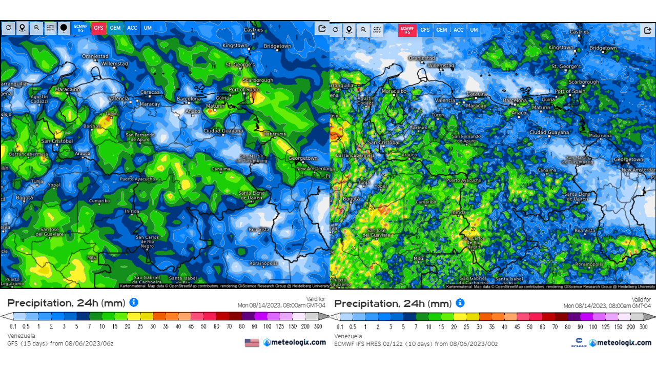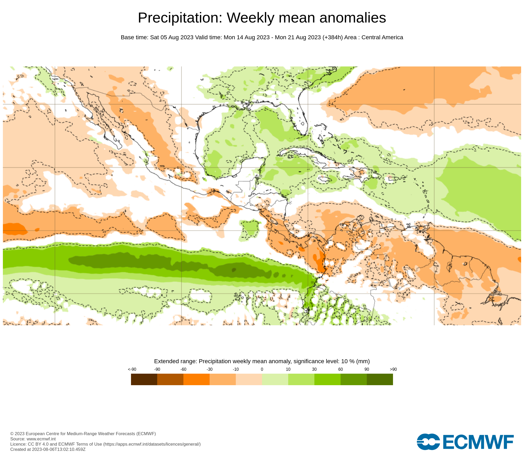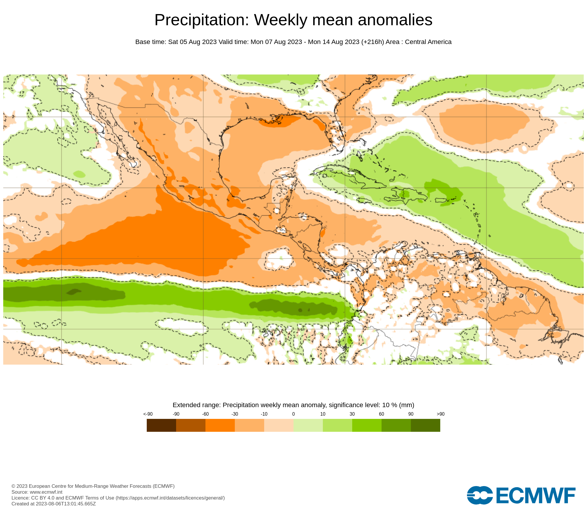 El pronostico semanal emitido por European Centre for Medium-Range Weather Forecast (ECMWF), se esperan eventos de precipitaciones entre promedio a por debajo sobre casi todo el territorio nacional, con anomalís negativas en llanos occidentales, Bolívar y Amazonas.