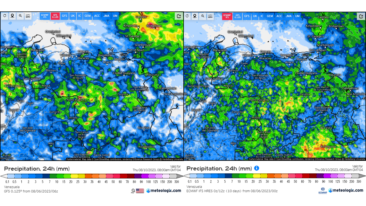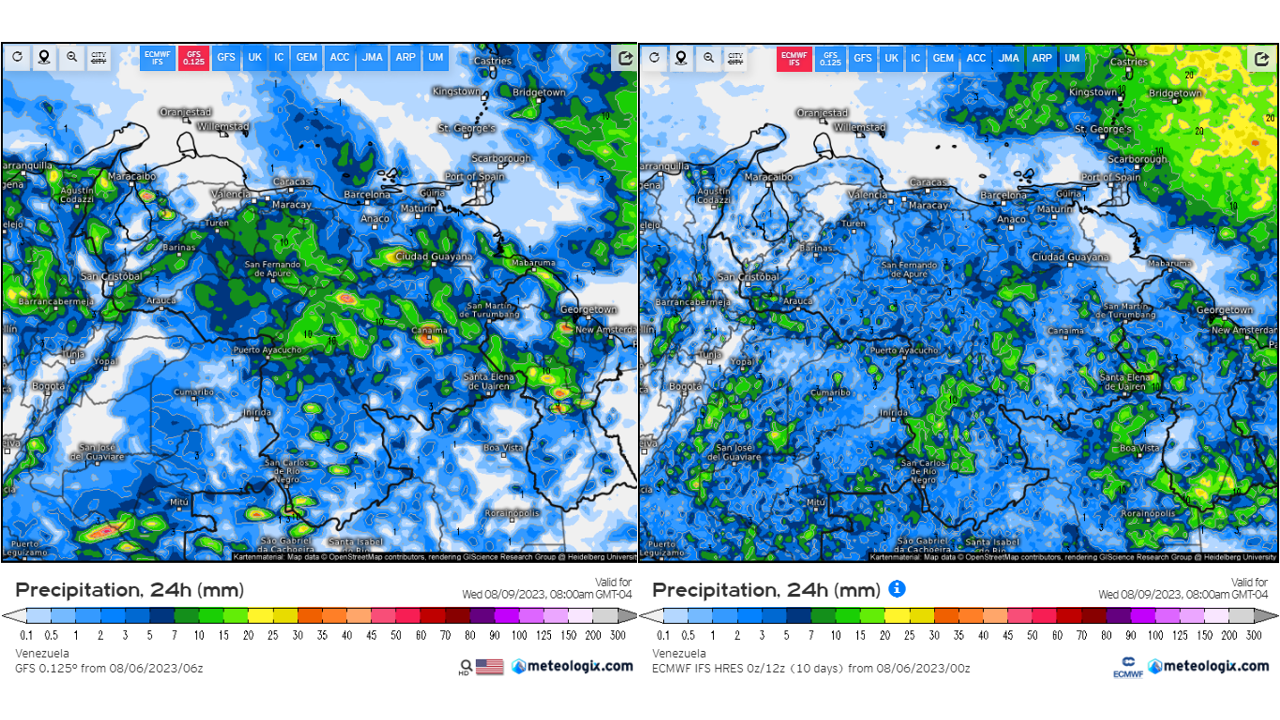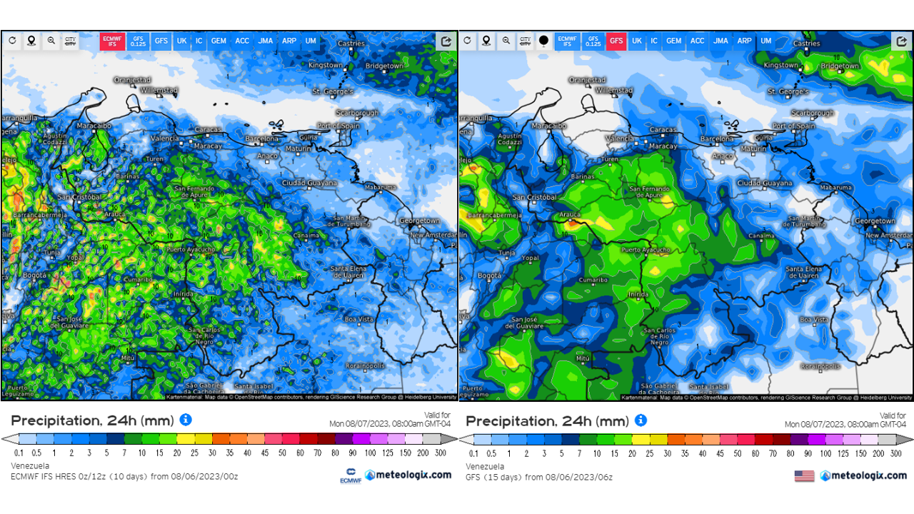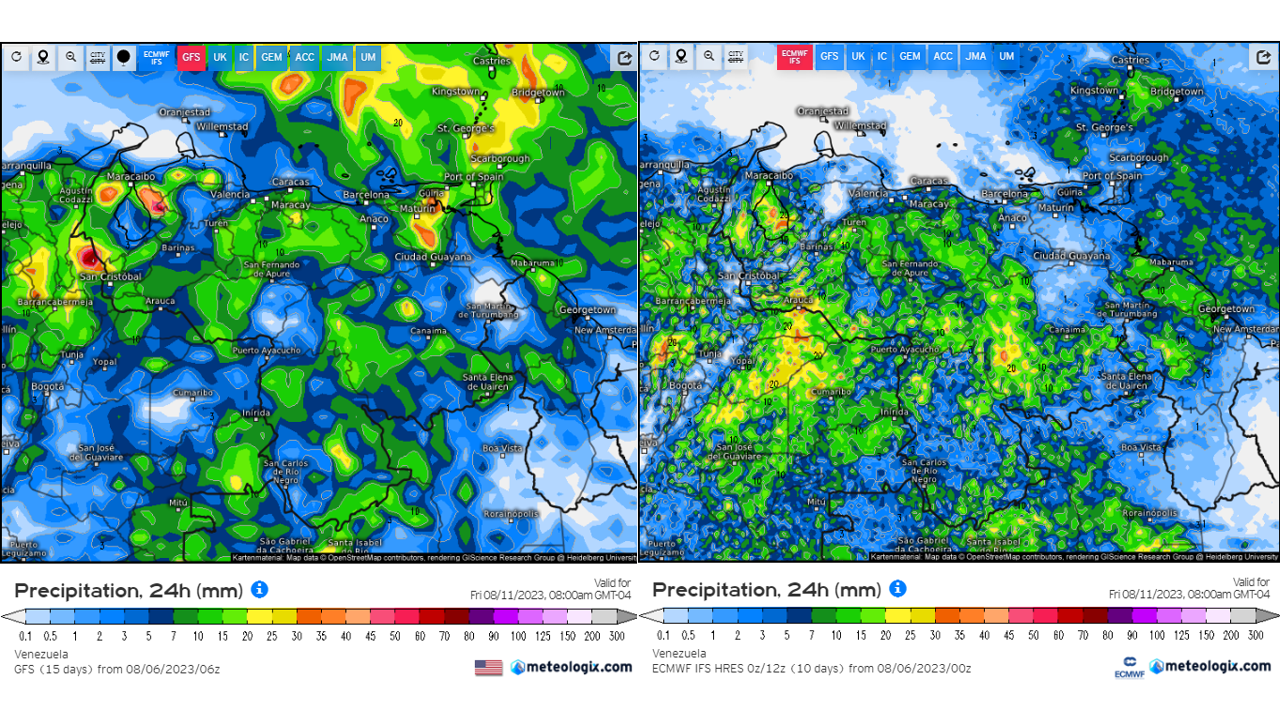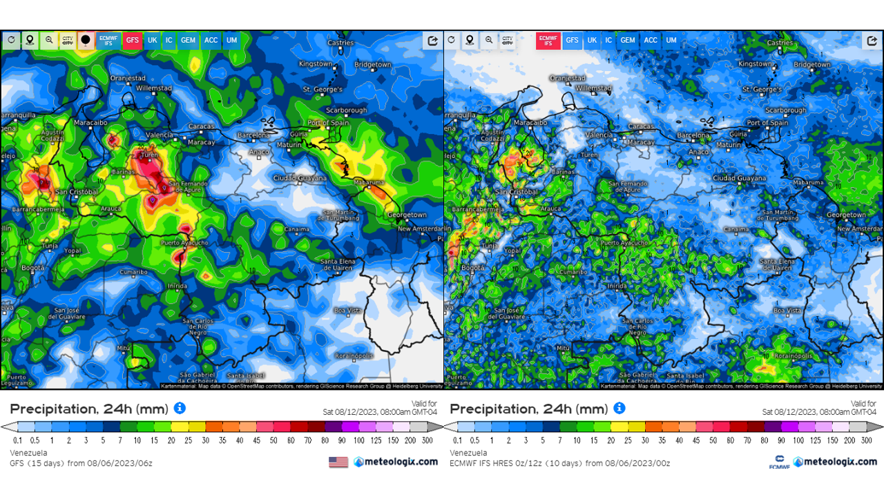 El pronostico semanal emitido por European Centre for Medium-Range Weather Forecast (ECMWF), se esperan eventos de precipitaciones entre promedio a por debajo sobre casi todo el territorio nacional, con anomalís negativas en llanos occidentales, Bolívar y Amazonas.