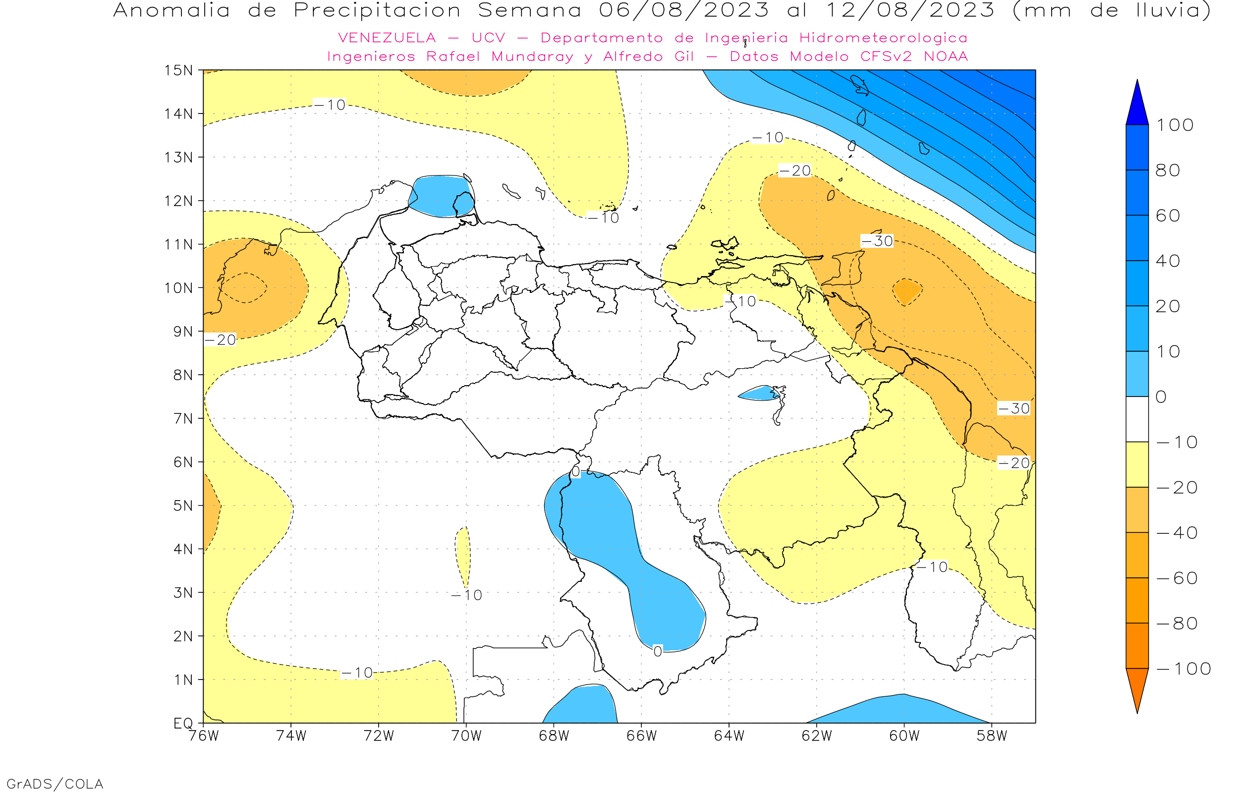 Pronostico de Anomalías Semanales para Venezuela, del 06/08 al 02/09/2023, usando datos del Modelo CFSv2 de NOAA y ECMWF.