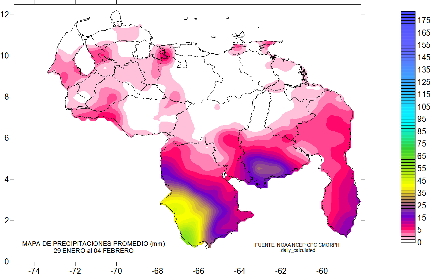 De acuerdo a la estadística de la precipitación estimada ( NOAA NCEP CPC CMORPH, daily_calculated) durante el periodo del 08/01 al 04/02/2023, se observa que los principales eventos de precipitaciones ocurren al sur del país (Amazonas y Bolívar). Los eventos por encima de los 40 mm se ubican al sur de los 2° norte, vienes bajando los valores con respecto. a las semanas anteriores y los llanos centrales y occidentales para la IV semana presenta precipitaciones promedio por debajo de los 2 mm.