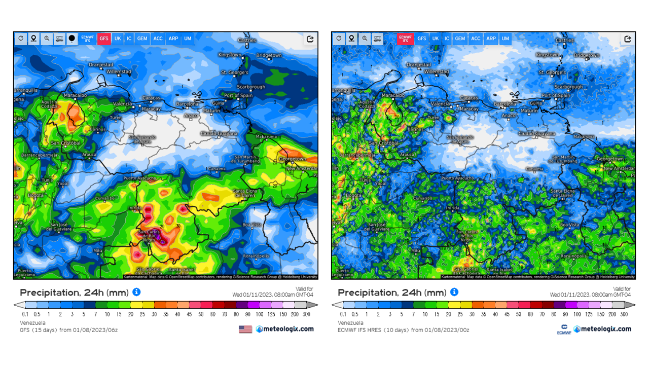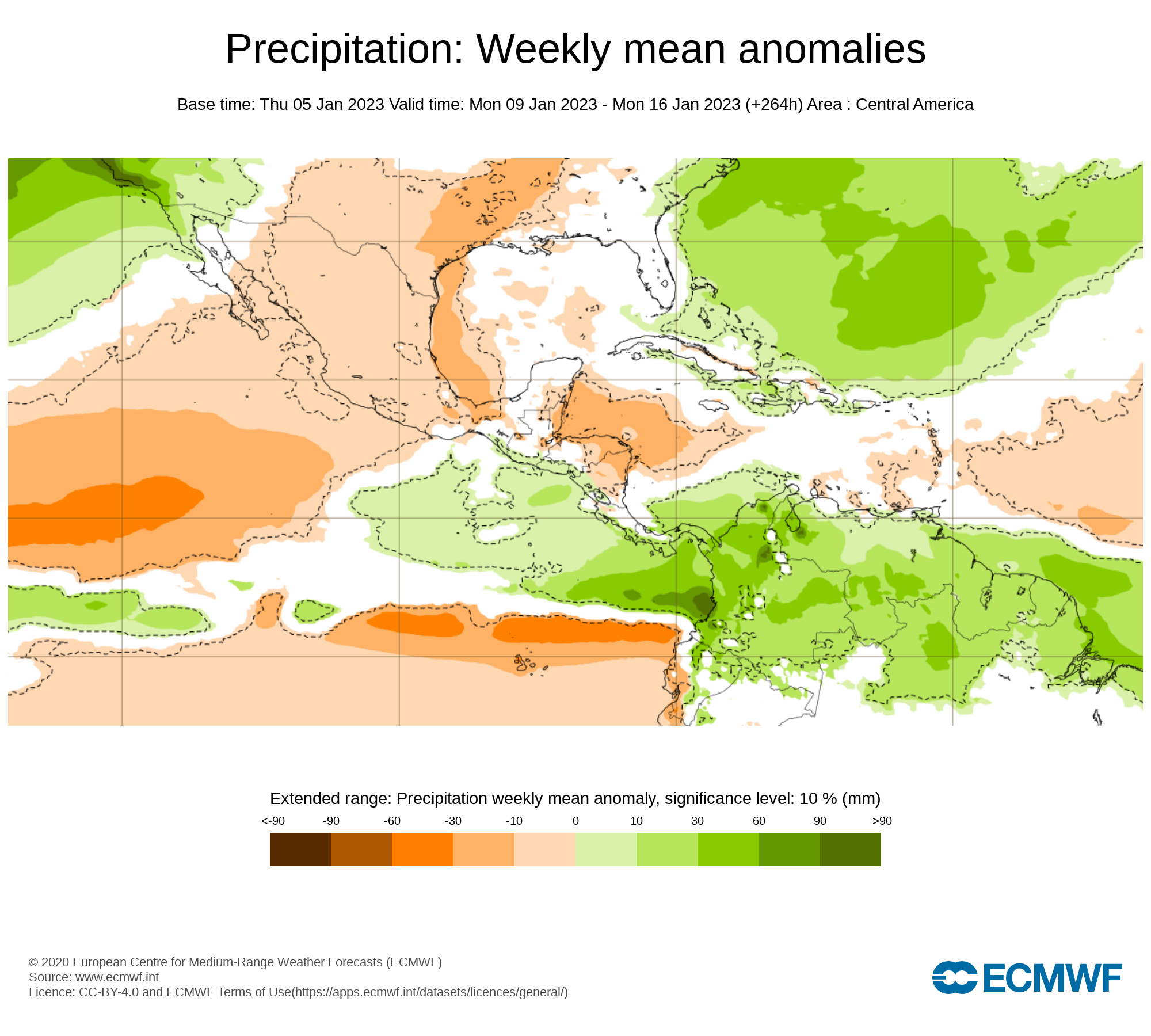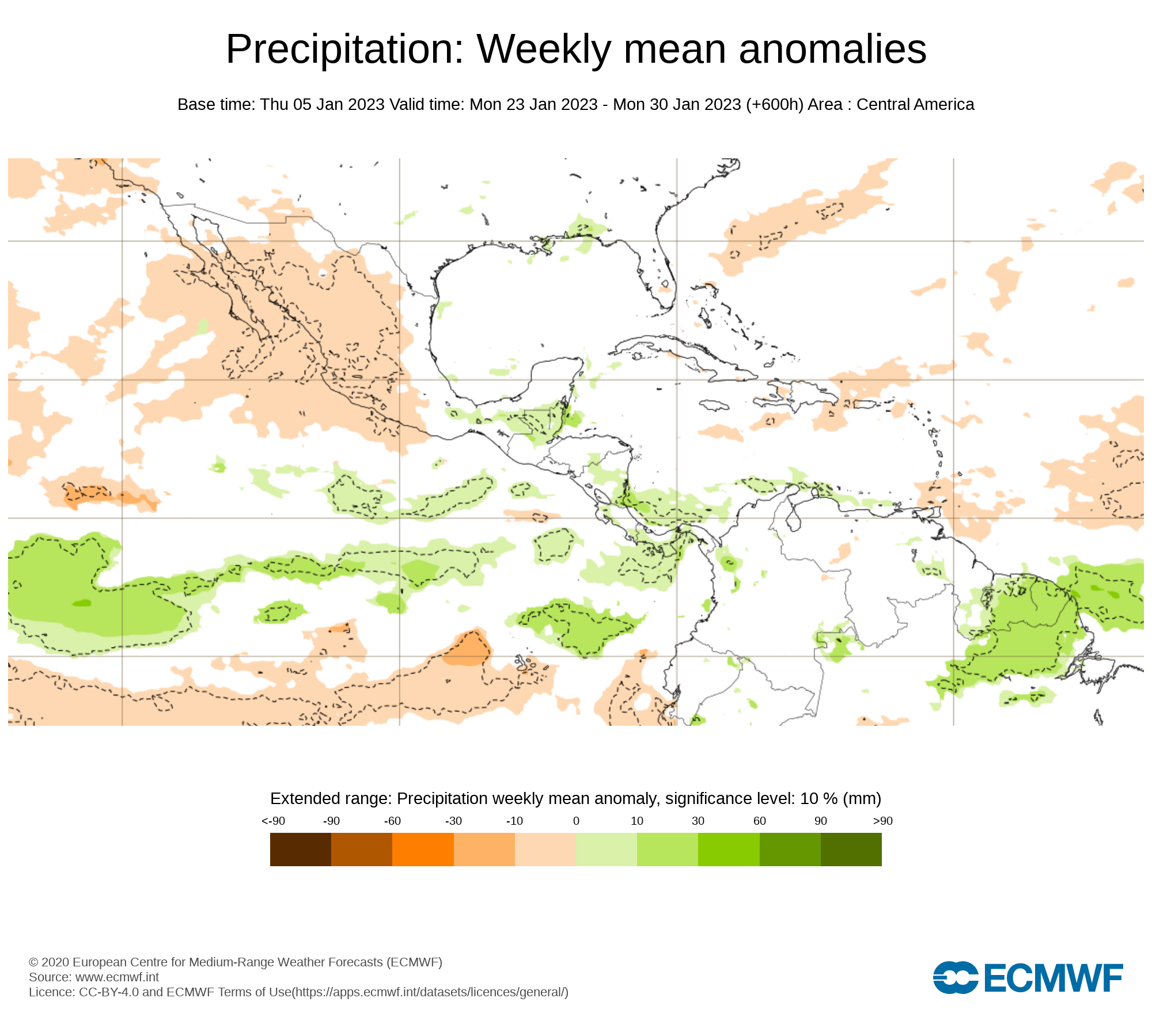 El pronostico semanal emitido por European Centre for Medium-Range Weather Forecast (ECMWF), se esperan eventos de precipitaciones promedio sobre el territorio nacional. Las anomalías positivas mas importantes en los andes, Zulia, Amazonas y Bolívar.