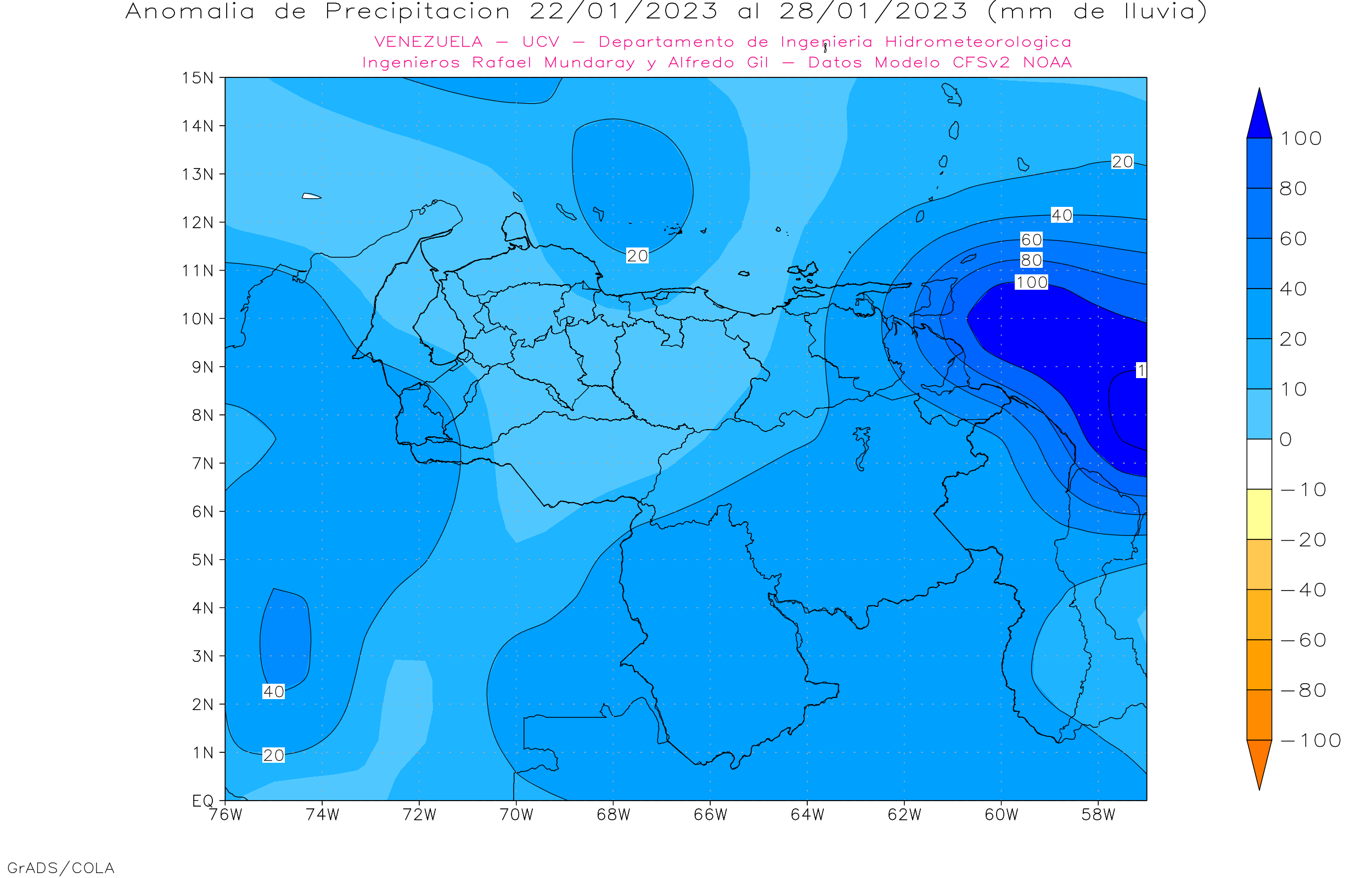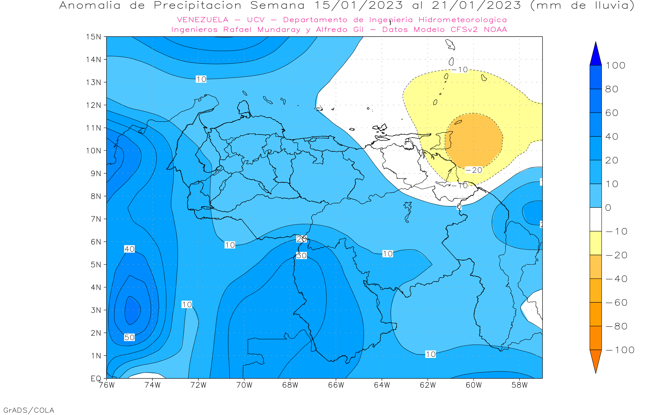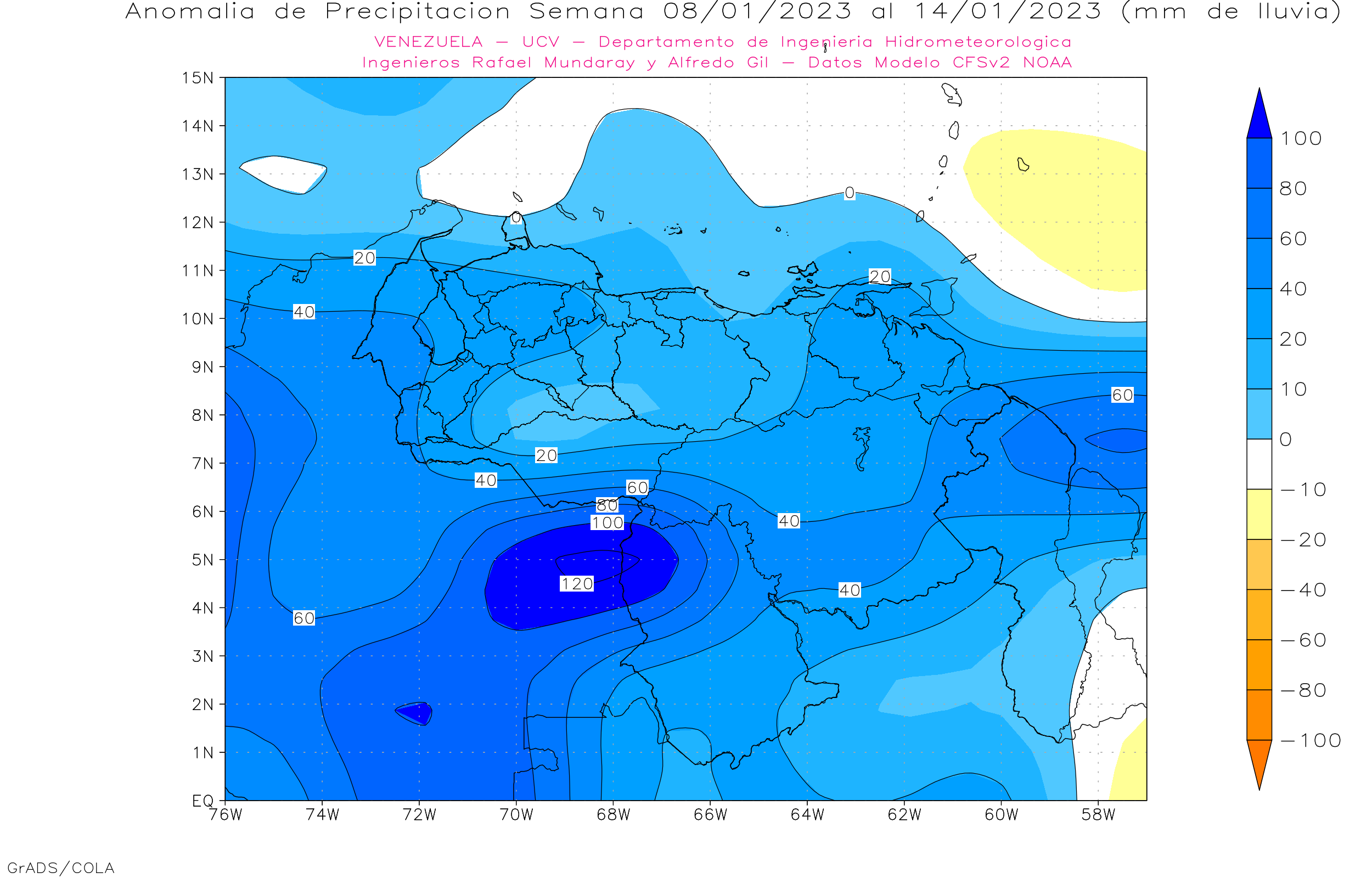Pronostico de Anomalías Semanales para Venezuela, del 08/01 al 04/02/2023, usando datos del Modelo CFSv2 de NOAA y ECMWF.