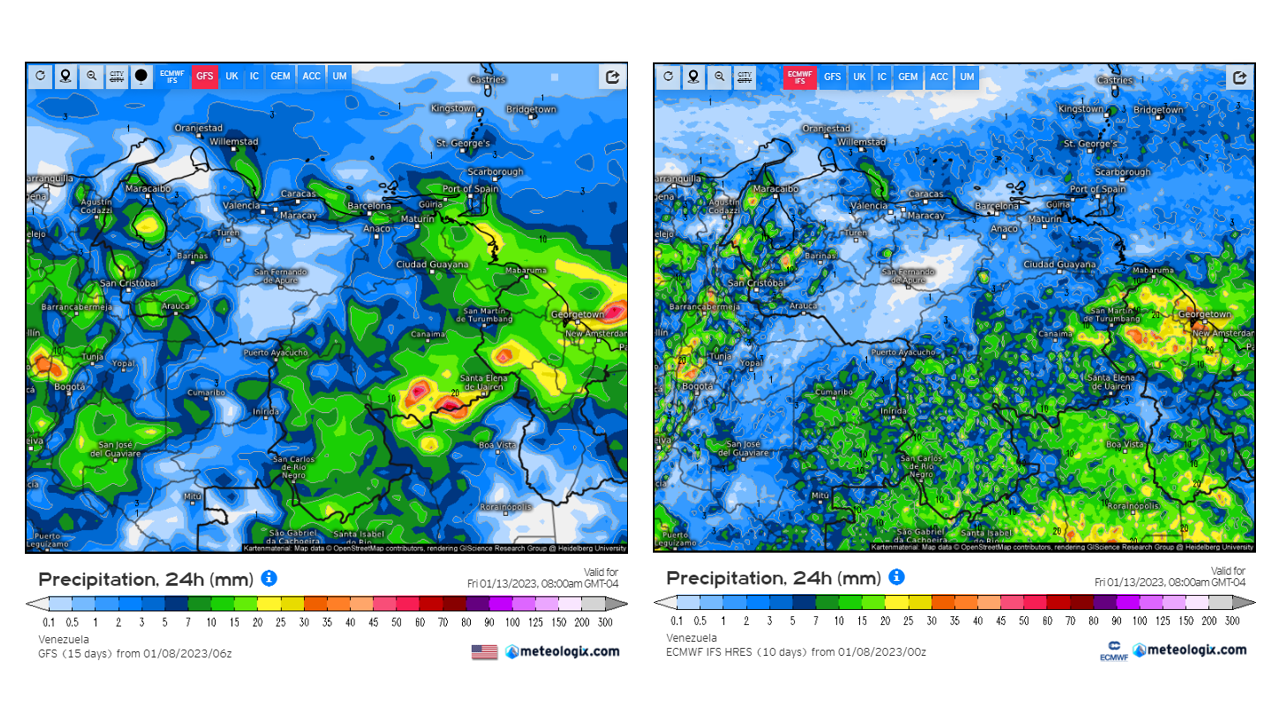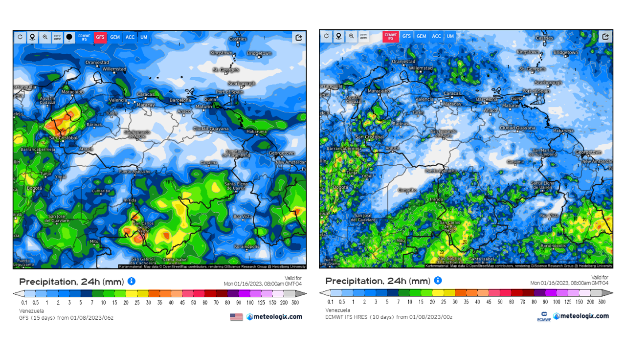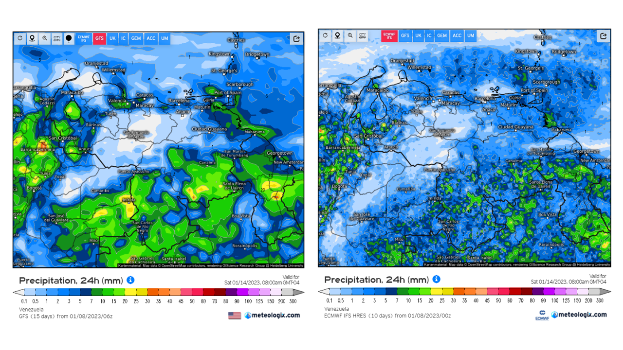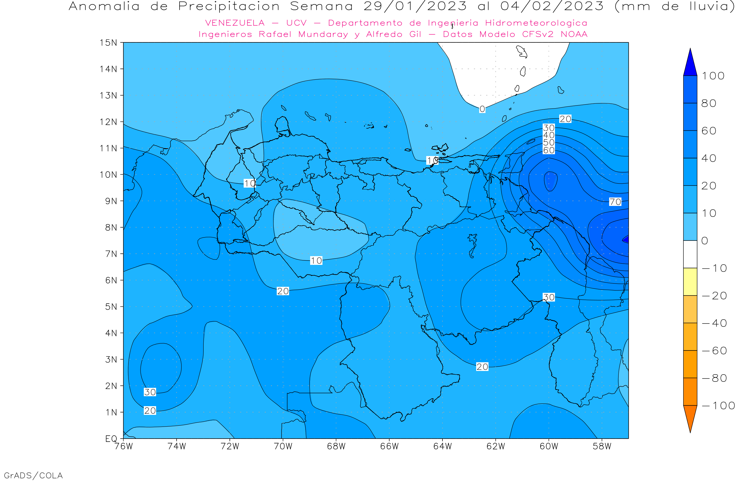 Pronostico de Anomalías Semanales para Venezuela, del 08/01 al 04/02/2023, usando datos del Modelo CFSv2 de NOAA y ECMWF.