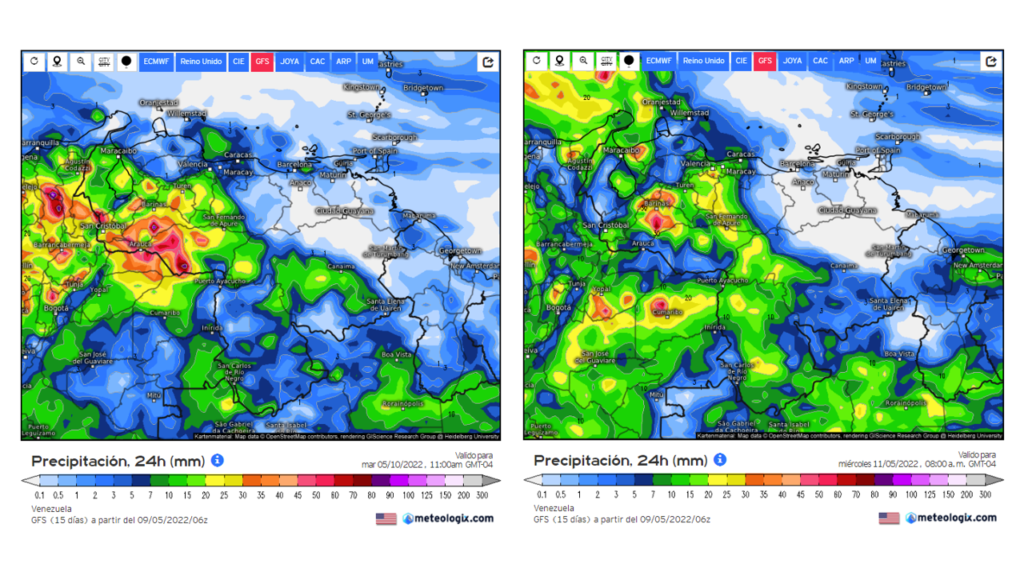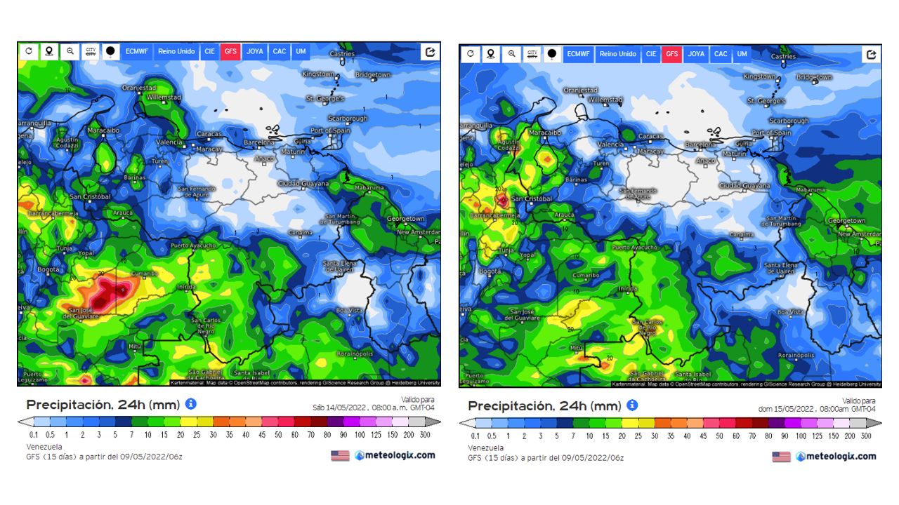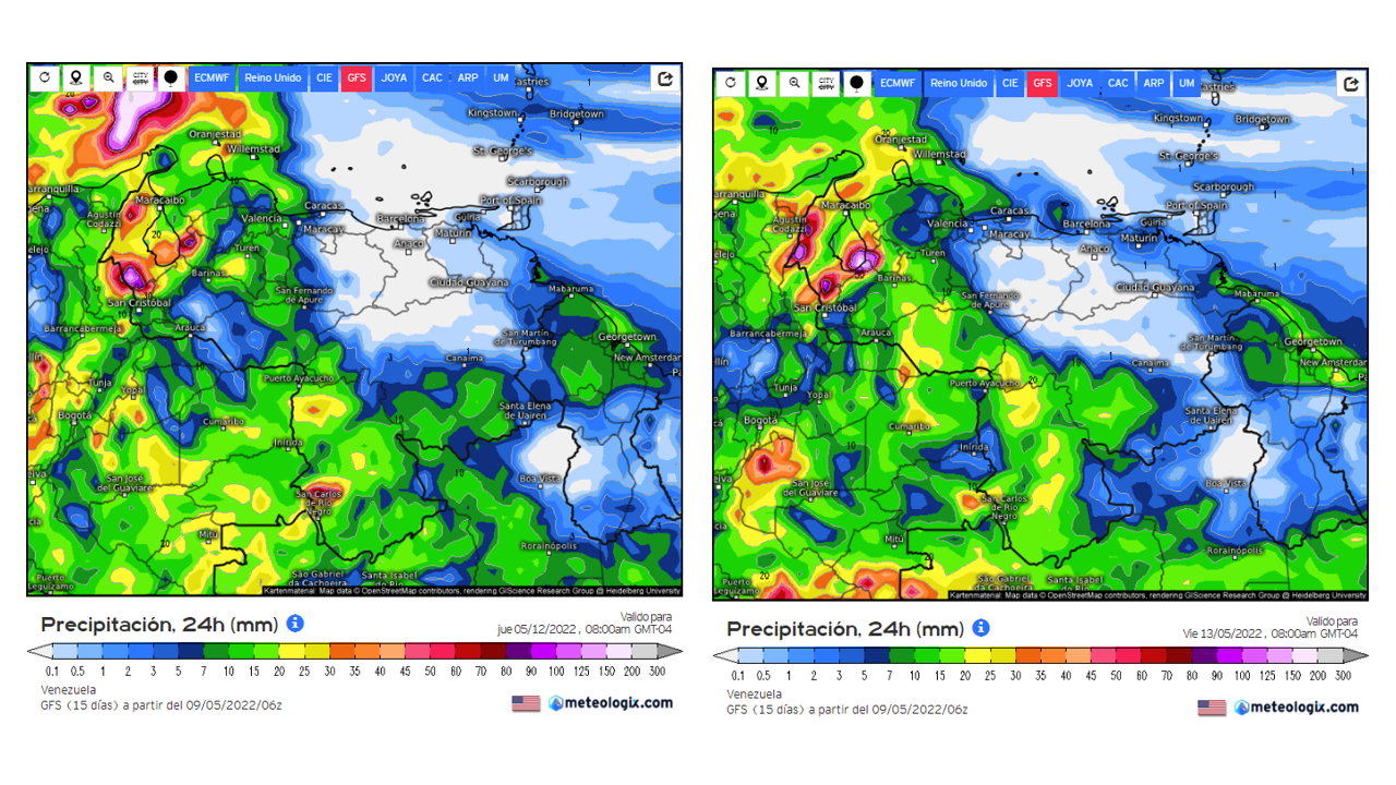 En el pronóstico diario del modelo GFS del 02 al 09 de mayo se espera al sur (Bolívar y Amazonas), comience la semana con escasos eventos importantes de precipitaciones, incrementándose en el transcurso de la semana y se esperan eventos hacia Amazonas y oeste de bolívar. Los estados centrales (Aragua, Carabobo, Miranda, Vargas, Yaracuy y Guárico) escasos eventos de precipitaciones durante principio de la semana, algunos eventos importantes se espera a media semana, manteniéndose eventos dispersos para el fin de semana. Los estados occidentales (Zulia, Lara, Falcón) se espera al principio de la semana eventos dispersos en Zulia y se espera un incremento importante de los eventos de precipitaciones a media semana y el fin semana. La región andina (Táchira, Mérida y Trujillo) se esperan eventos moderados al principio de la semana, y incrementándose en el transcurso de la semana y mejorando al final de la semana. Los llanos occidentales (Portuguesa, Apure, Barinas y Cojedes) se esperan moderados y numerosos de precipitaciones en la región, se deben ir mejorando hacia el fin de semana. La región oriental (Anzoátegui, Sucre, Monagas y Delta Amacuro) se espera eventos de precipitaciones débiles y dispersos al principio de la semana, a media semana se esperan incrementos, con eventos importantes el fin de semana.