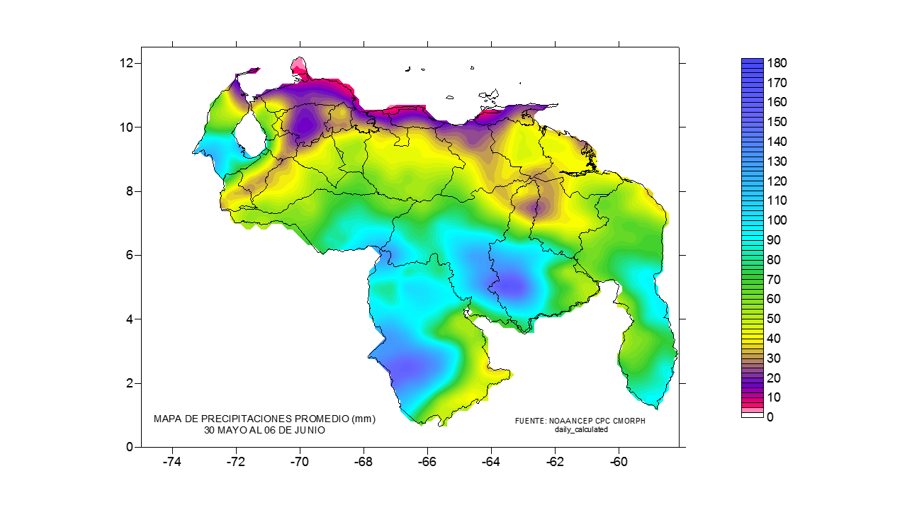 De acuerdo a la estadística de la precipitación estimada ( NOAA NCEP CPC CMORPH, daily_calculated) durante el periodo del 09/05 AL 06/06/22, se observa que los principales eventos de precipitaciones ocurren al sur del país (Amazonas y Bolívar), suroeste de Zulia, Sur de apure, Para la semana IV los eventos de precipitaciones alcanza los llanos occidentales y centrales, con lluvias en el oriente y a lo largo de la región norte costera es la presenta escasos eventos de precipitaciones. Los eventos de precipitaciones por encima de 50 mm se ubican al sur de 9 norte y oeste de Zulia.