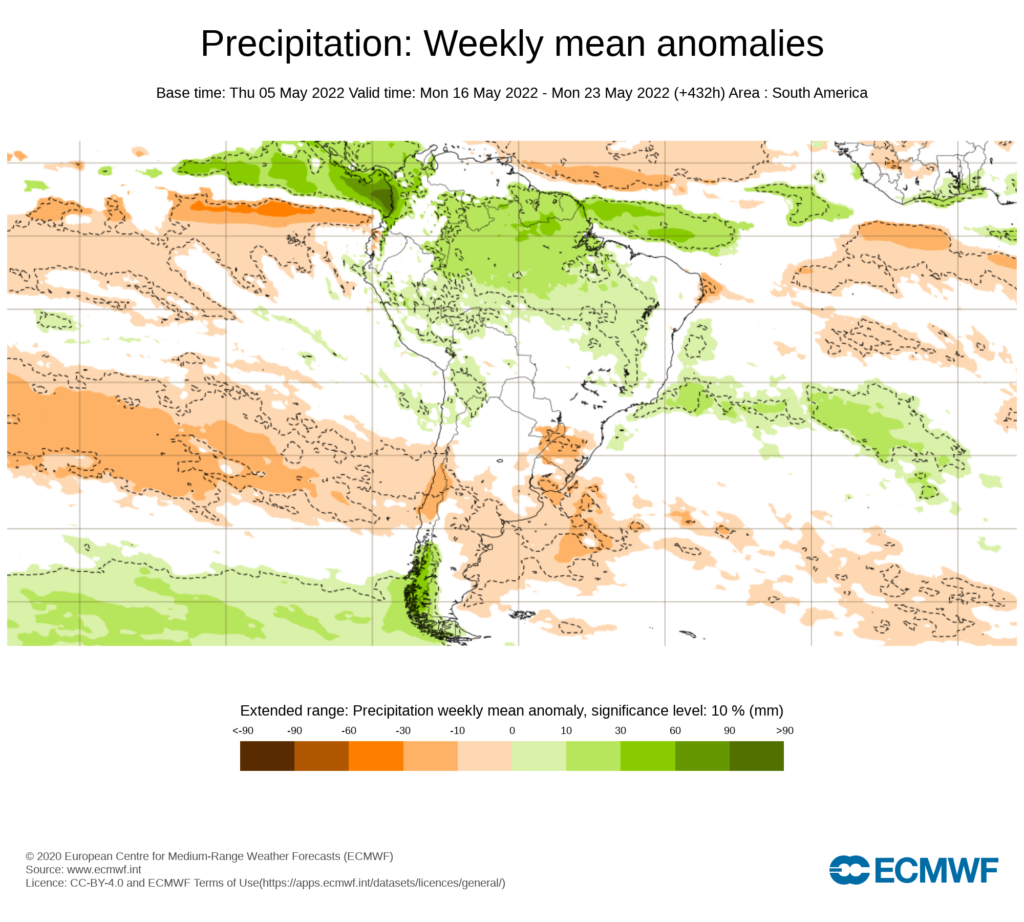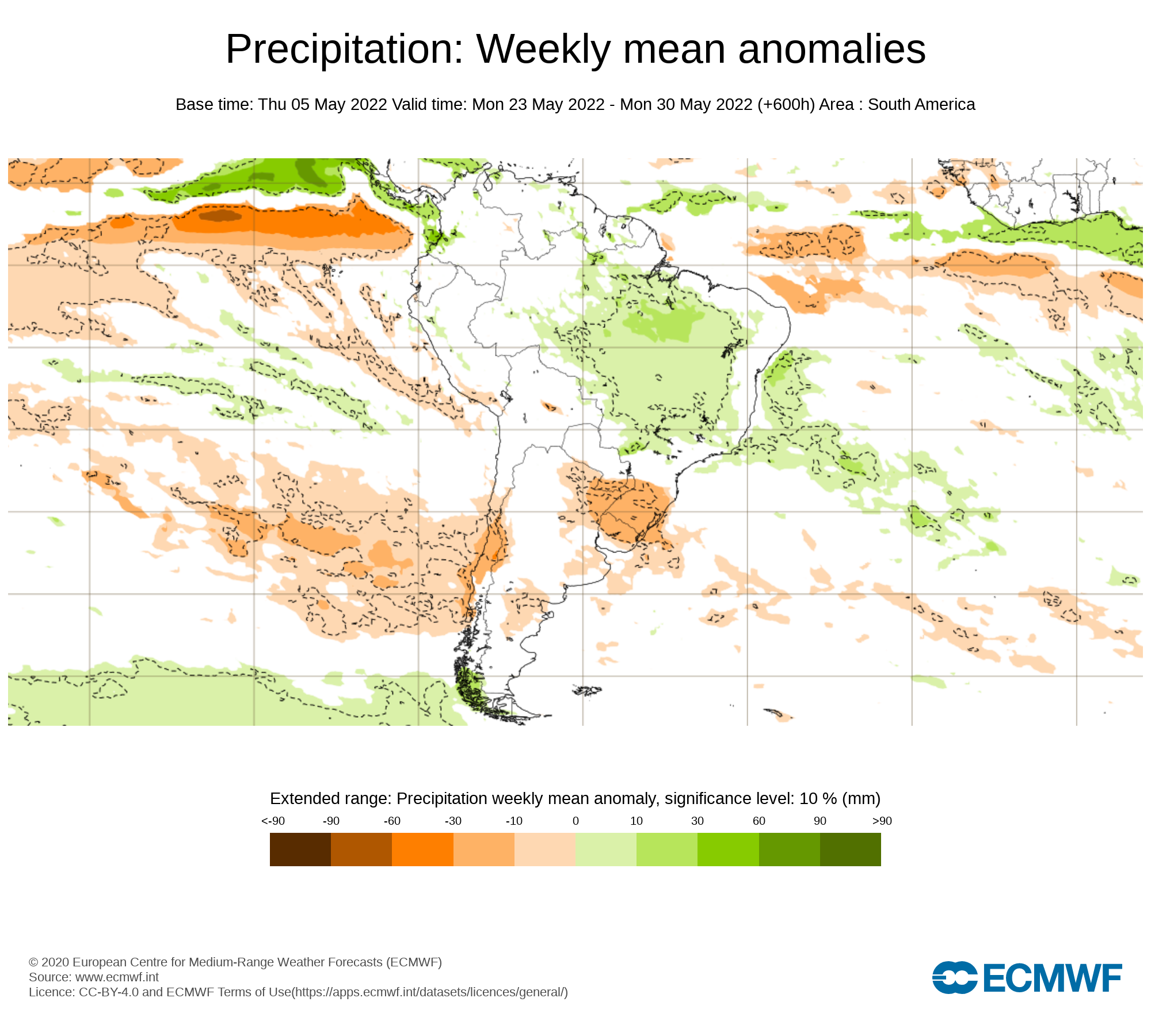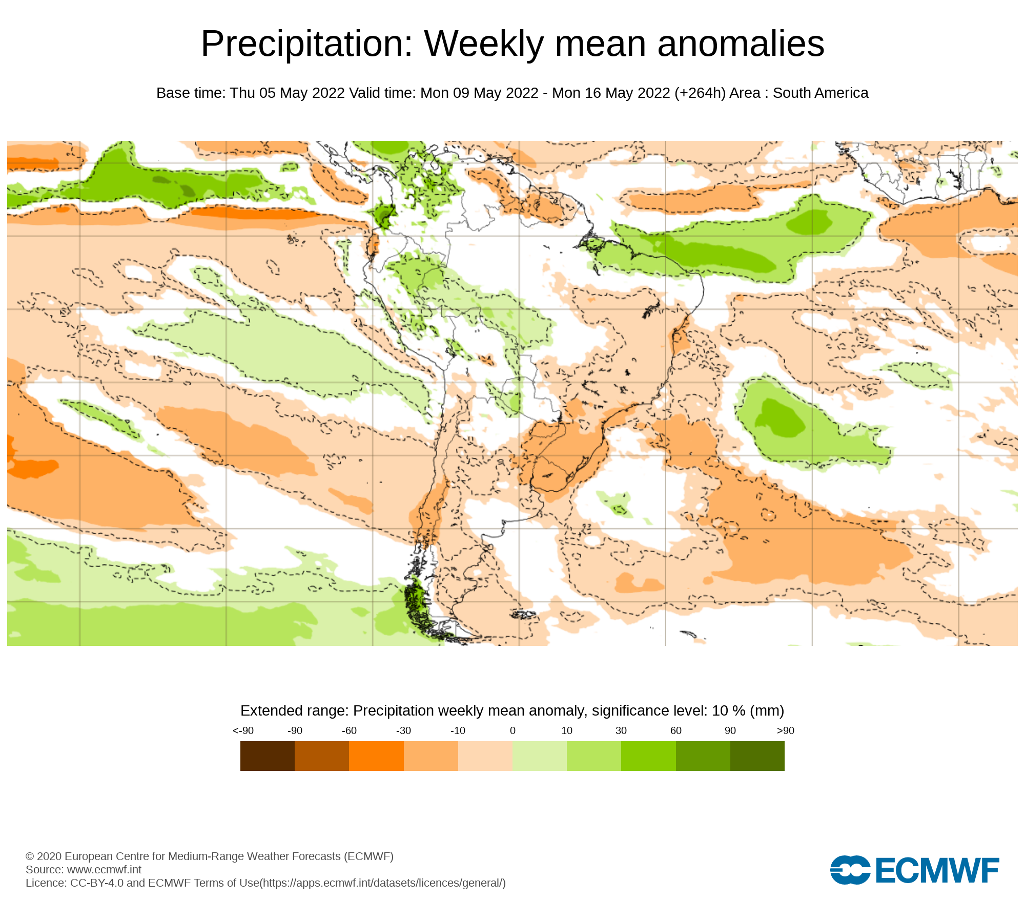 PRONOSTICO DE ANOMALÍAS SEMANALES DE PRECIPITACIÓN DEL 09/05 AL 06/06/22