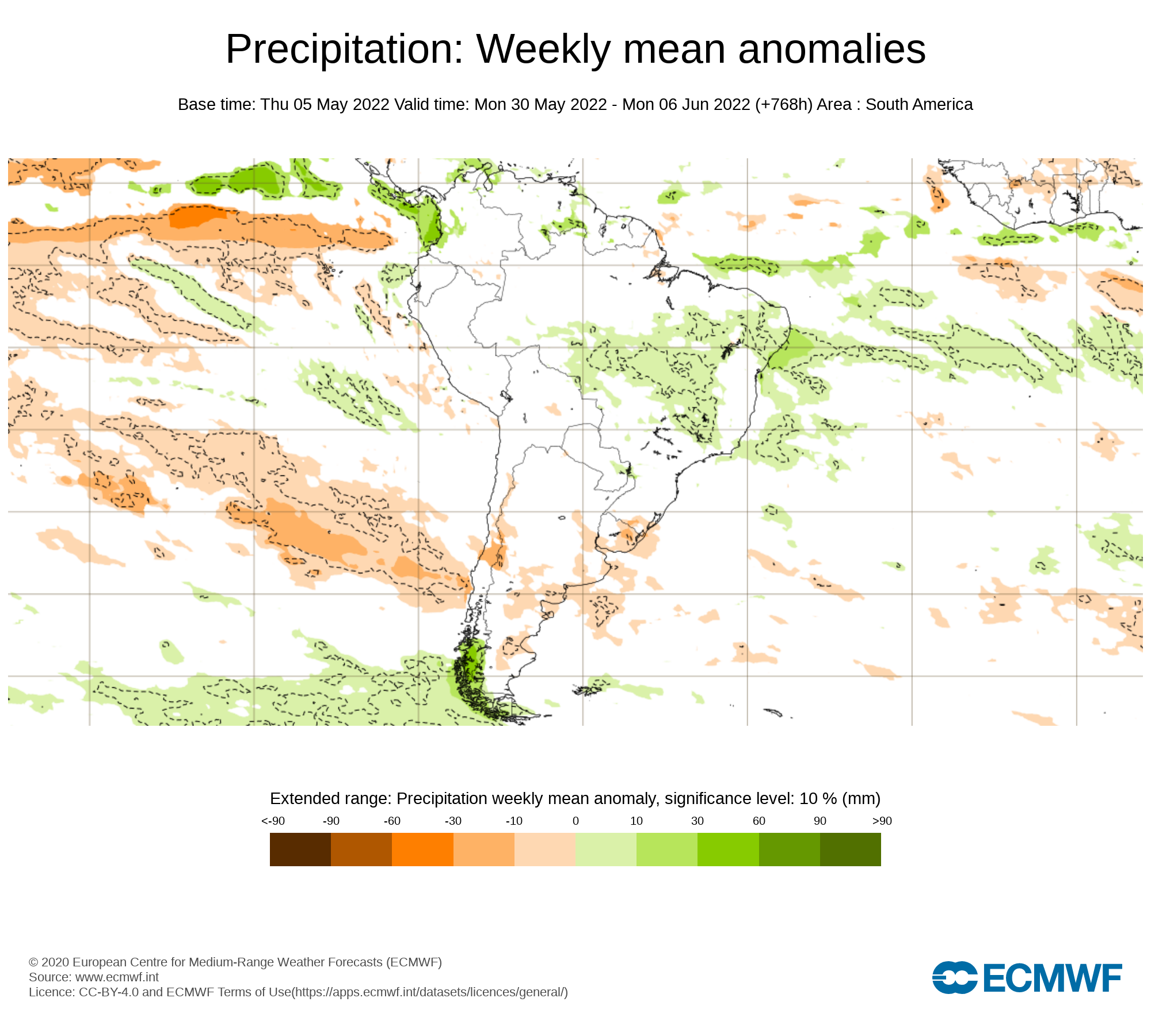 El pronostico semanal emitido por European Centre for Medium-Range Weather Forecast (ECMWF), se esperan eventos de precipitaciones entre promedio a anomalías positivas en los andes, Zulia y llanos occidentales, y negativas en los llanos orientales.