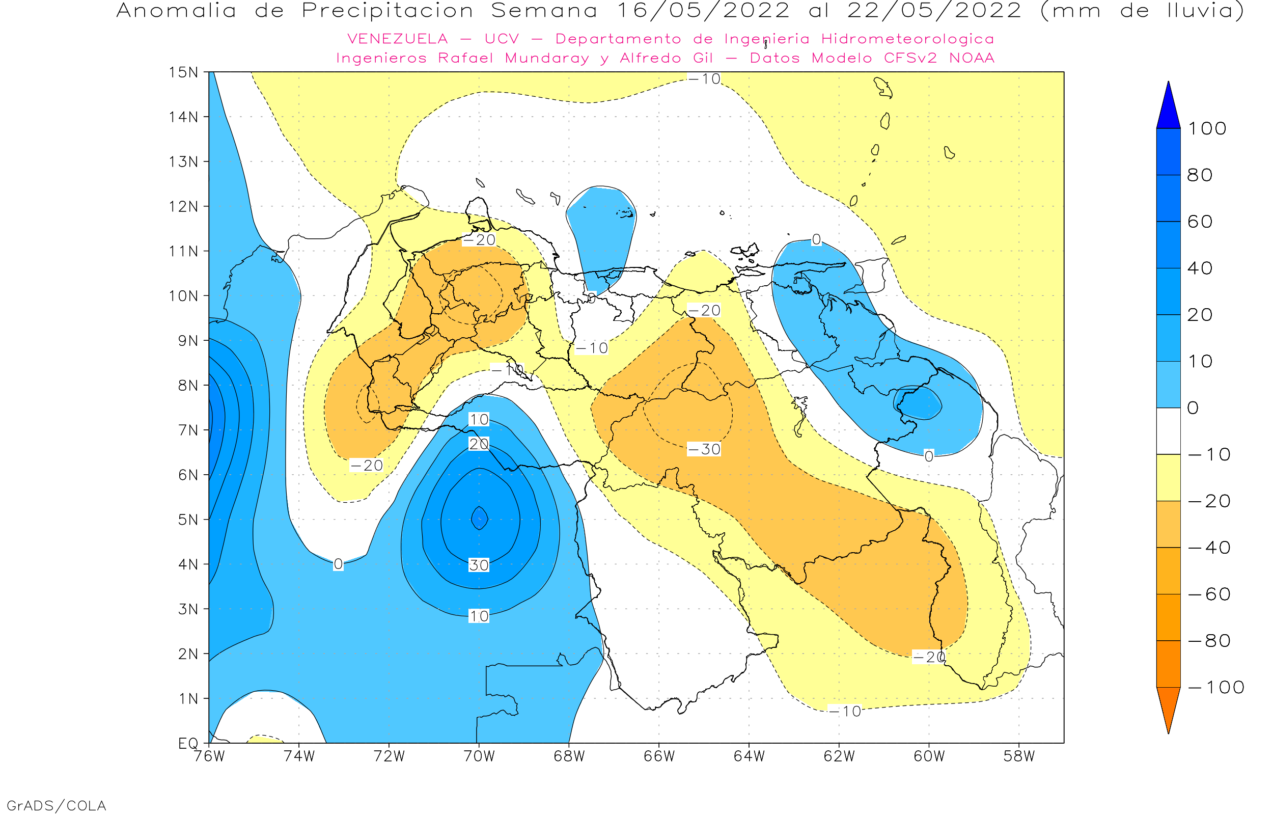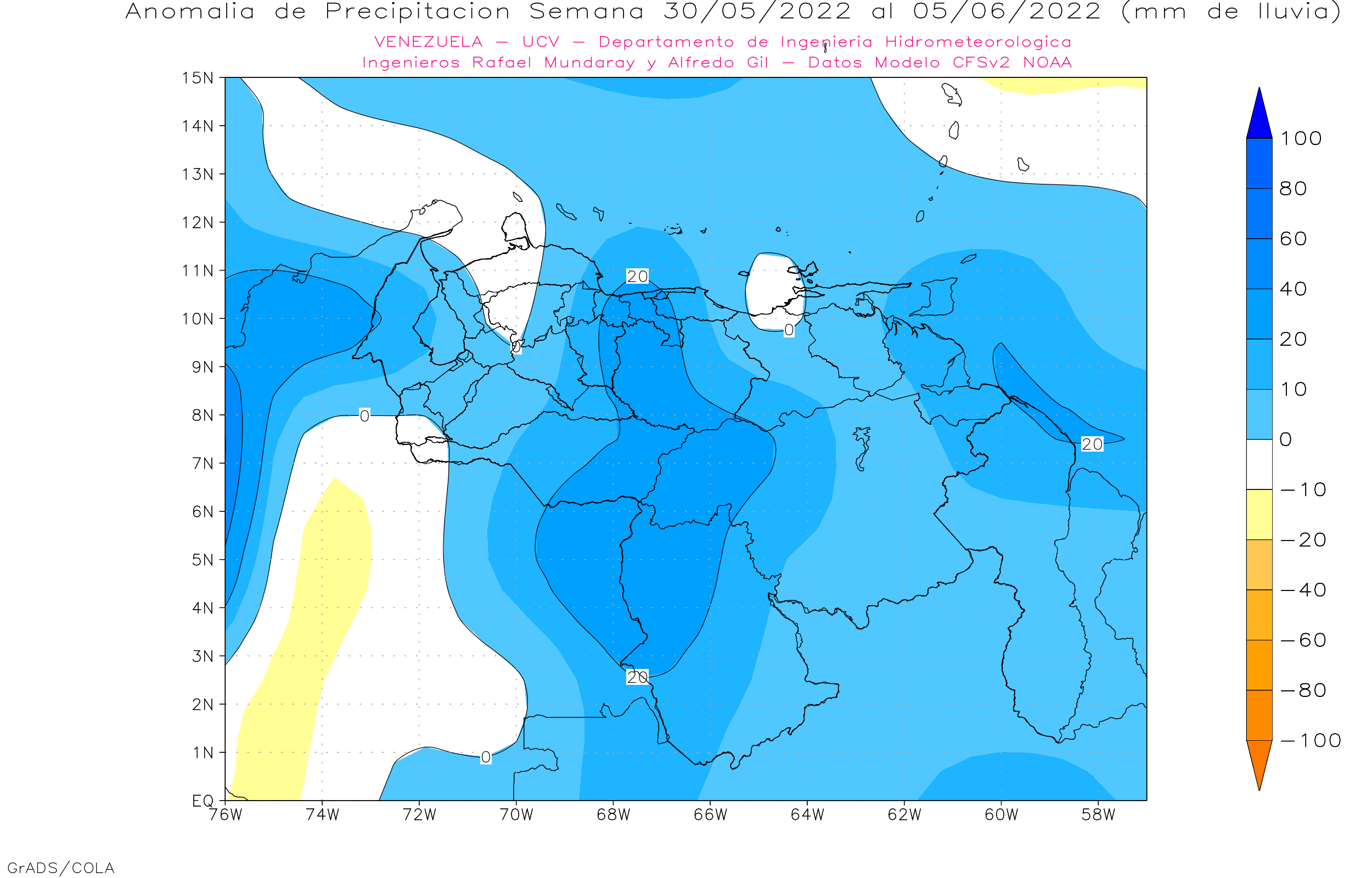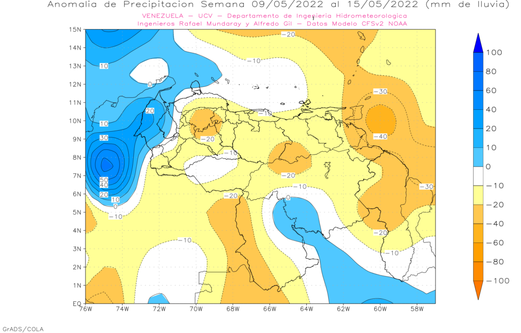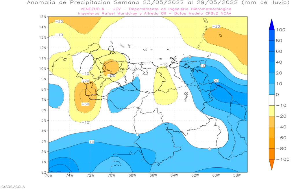 El modelo GFSV2 prevé en general eventos de precipitaciones dentro del promedio histórico en casi todo el territorio nacional, las anomalías negativas en Bolívar, andes, llanos ocidentales, Guárico y Anzoátegui.