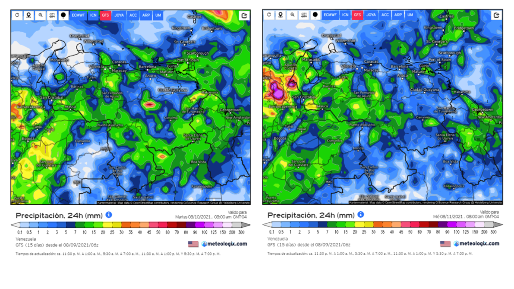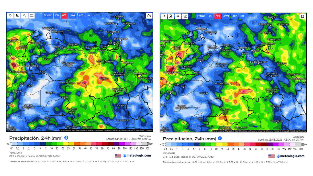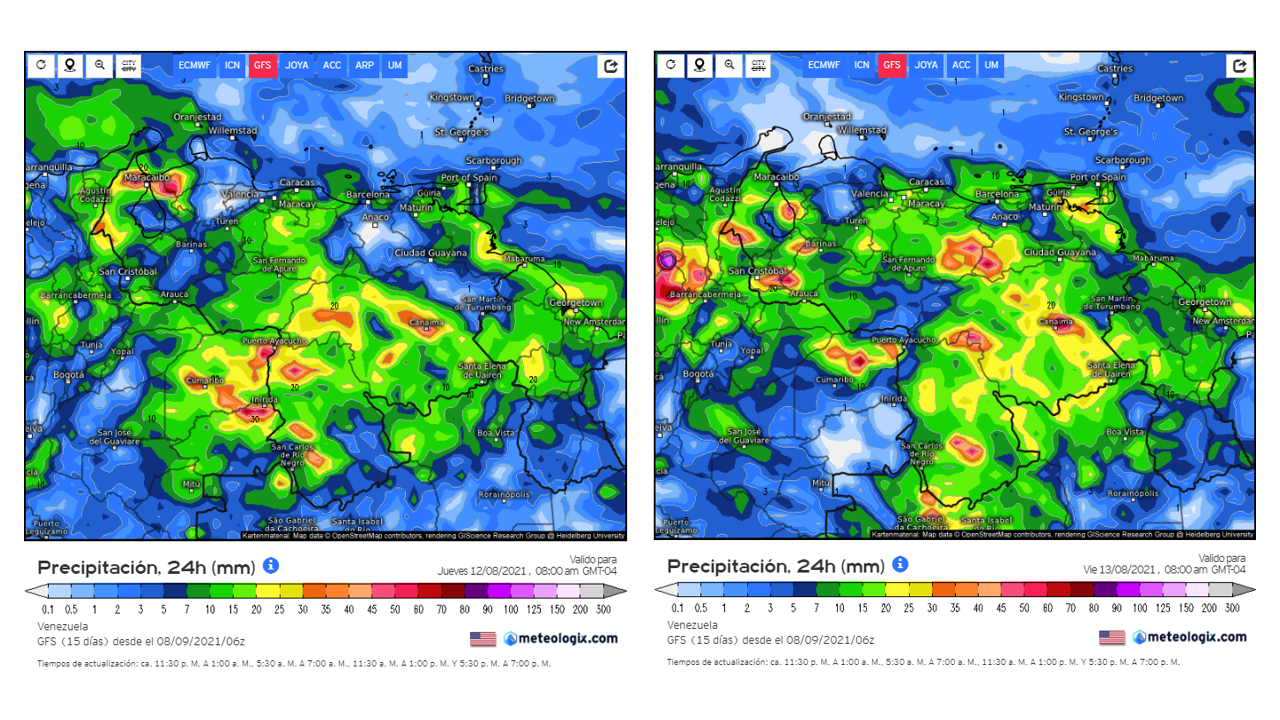 En el pronostico diario del modelo GFS del 09 al 15 de agosto, los principales eventos se prevé para mediados de semana hasta el fin de semana. Lluvias importantes al sur Y oriente del país, y Zulia