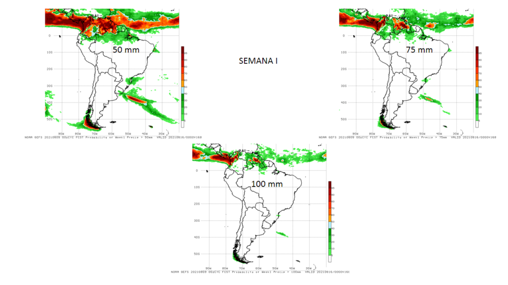 Las Probabilidades de excedencia total de precipitación para semana del 09 al 16 de agosto, superiores a 50, 75 y 100 mm, se prevé las mayores probabilidades se ubican en la región central, sur del país y Zulia