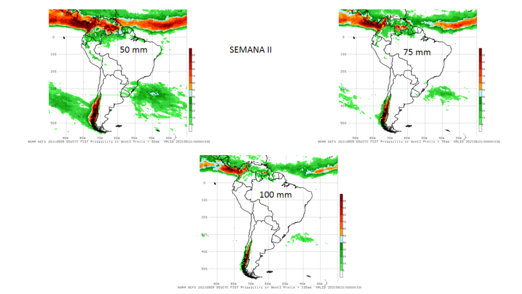 Las Probabilidades de excedencia total de precipitación para semana del 16 al 23 de agosto, superiores a 50, 75 y 100 mm, se prevé las mayores probabilidades se ubican al sur del país.