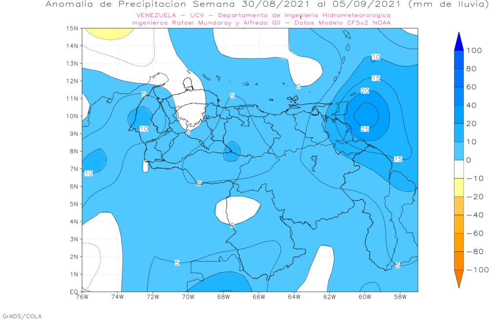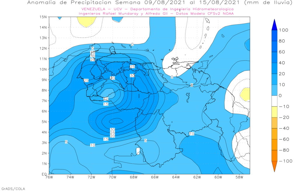 Pronostico de Anomalías Semanales para Venezuela, del 09/08 al 05/09 de 2021, usando datos del Modelo CFSv2 de NOAA y ECMWF.