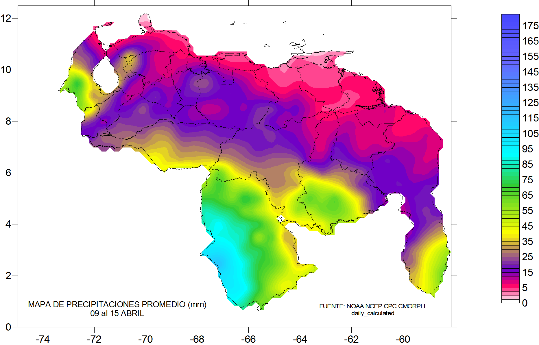 De acuerdo a la estadística de las precipitaciones estimadas para esta semana, se observa que los eventos más importantes se mantiene al sur del país, los centro de lluvias cercanos a 90 en casi toda Amazonas y mayores de 40 mm en el suroeste de Bolívar. Ya se observa que las lluvias por encima de los 40 mm se ubican al sur de 7° norte. Los llanos occidentales comienza a mostrar los primeros eventos de precipitaciones, la región central y oriental con valores entre 5 y 20 mm. Oeste de Zulia con centro de lluvias de 95 mm, Ya se aprecia un incremento de las lluvias en varios sectores del país.