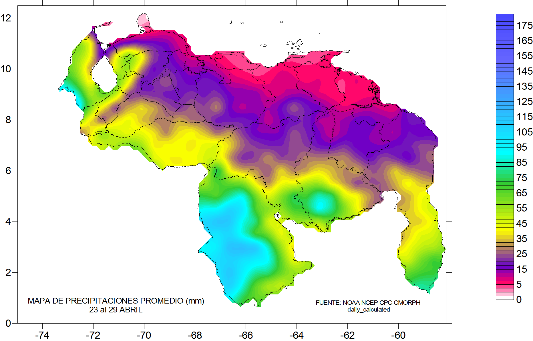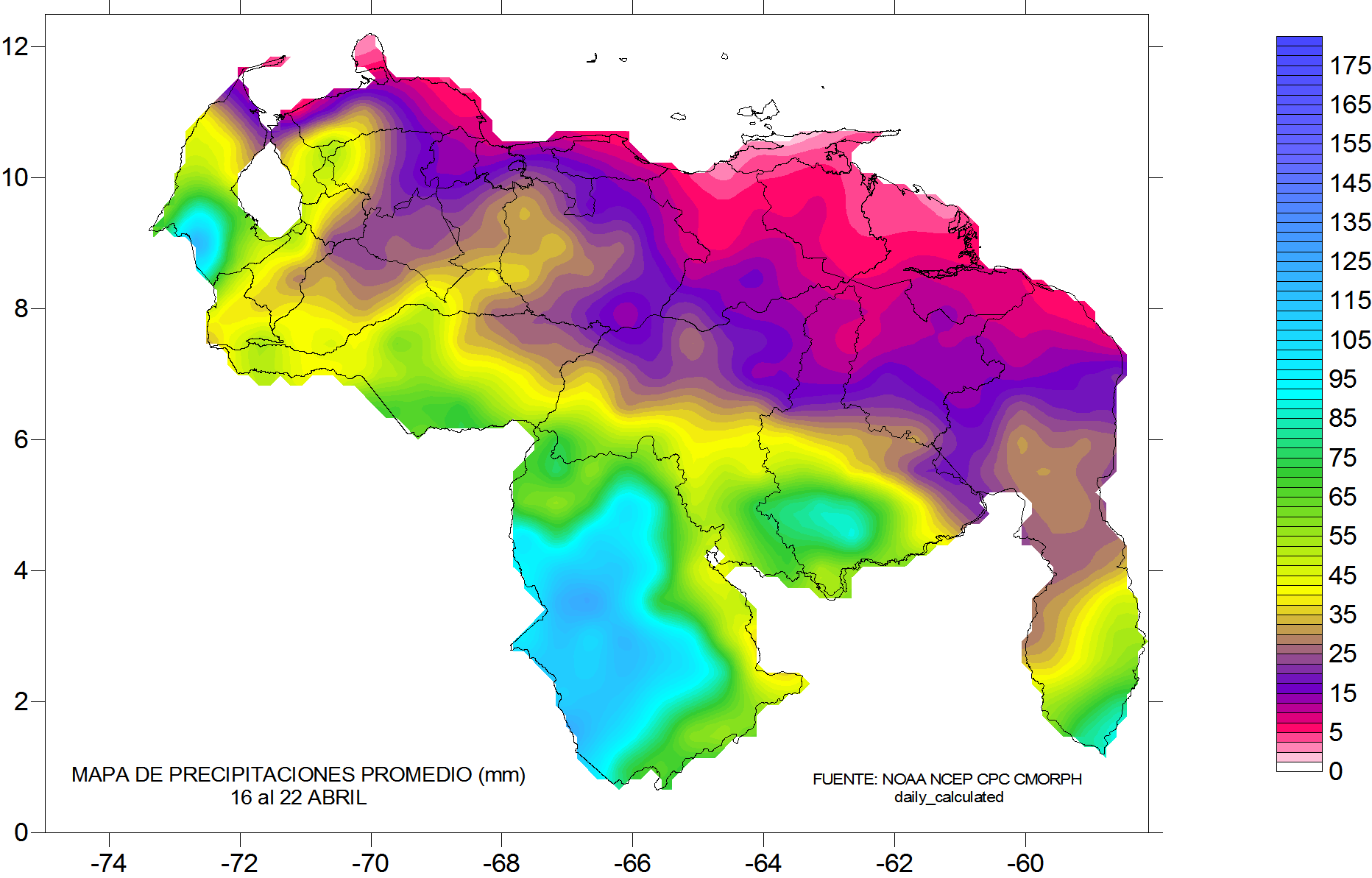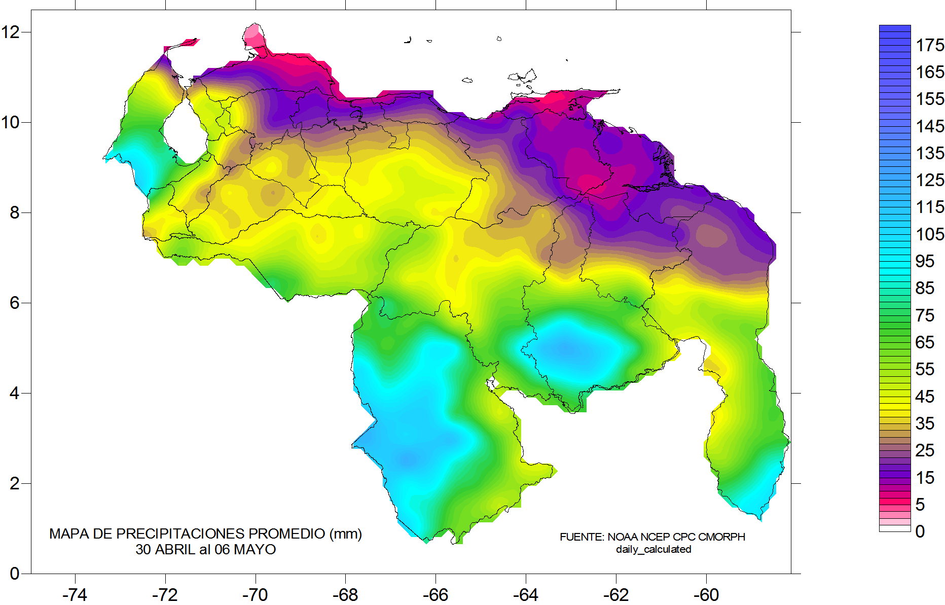 De acuerdo a la estadística de las precipitaciones estimadas para esta semana, se observa que los eventos más importantes se mantiene al sur del país, los centro de lluvias cercanos a 95 en casi toda Amazonas y mayores de 90 mm en el suroeste de Bolívar. Ya se observa que las lluvias por encima de los 40 mm se ubican al sur de 7° norte. Los llanos occidentales mantiene los eventos de precipitaciones, la región central y oriental con valores entre 5 y 20 mm. Oeste de Zulia con centro de lluvias de 95 mm, Ya se aprecia un incremento de las lluvias en varios sectores del país.