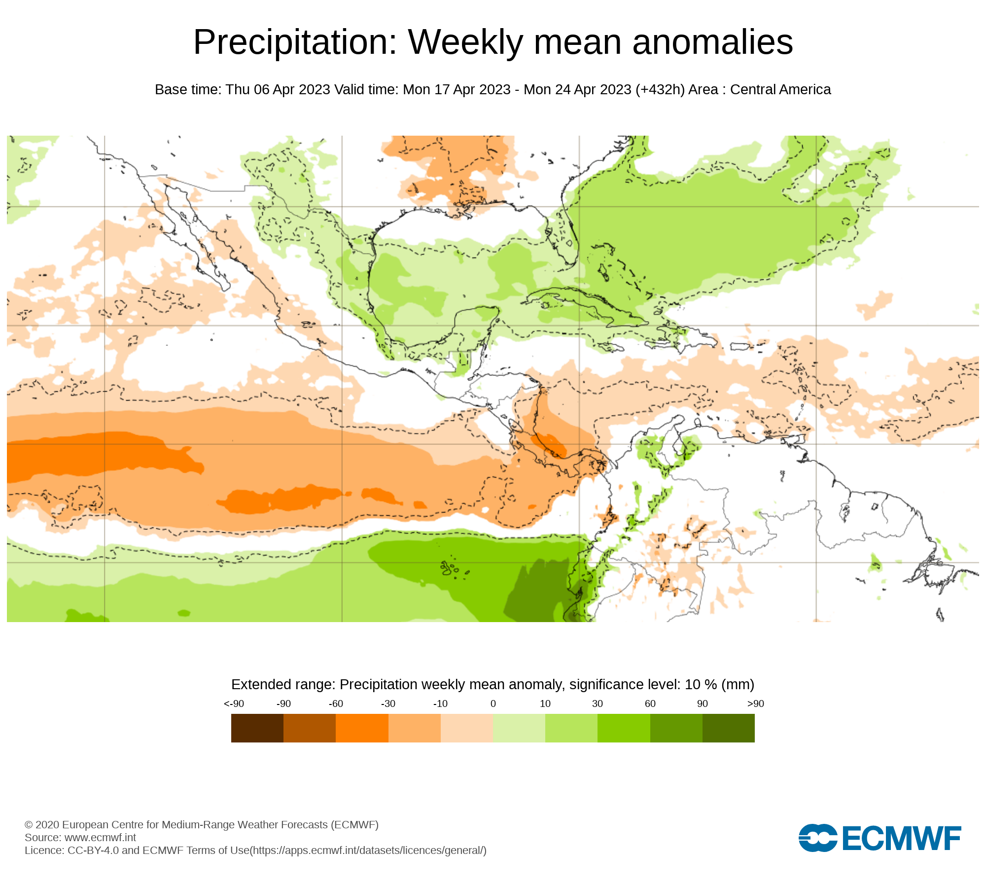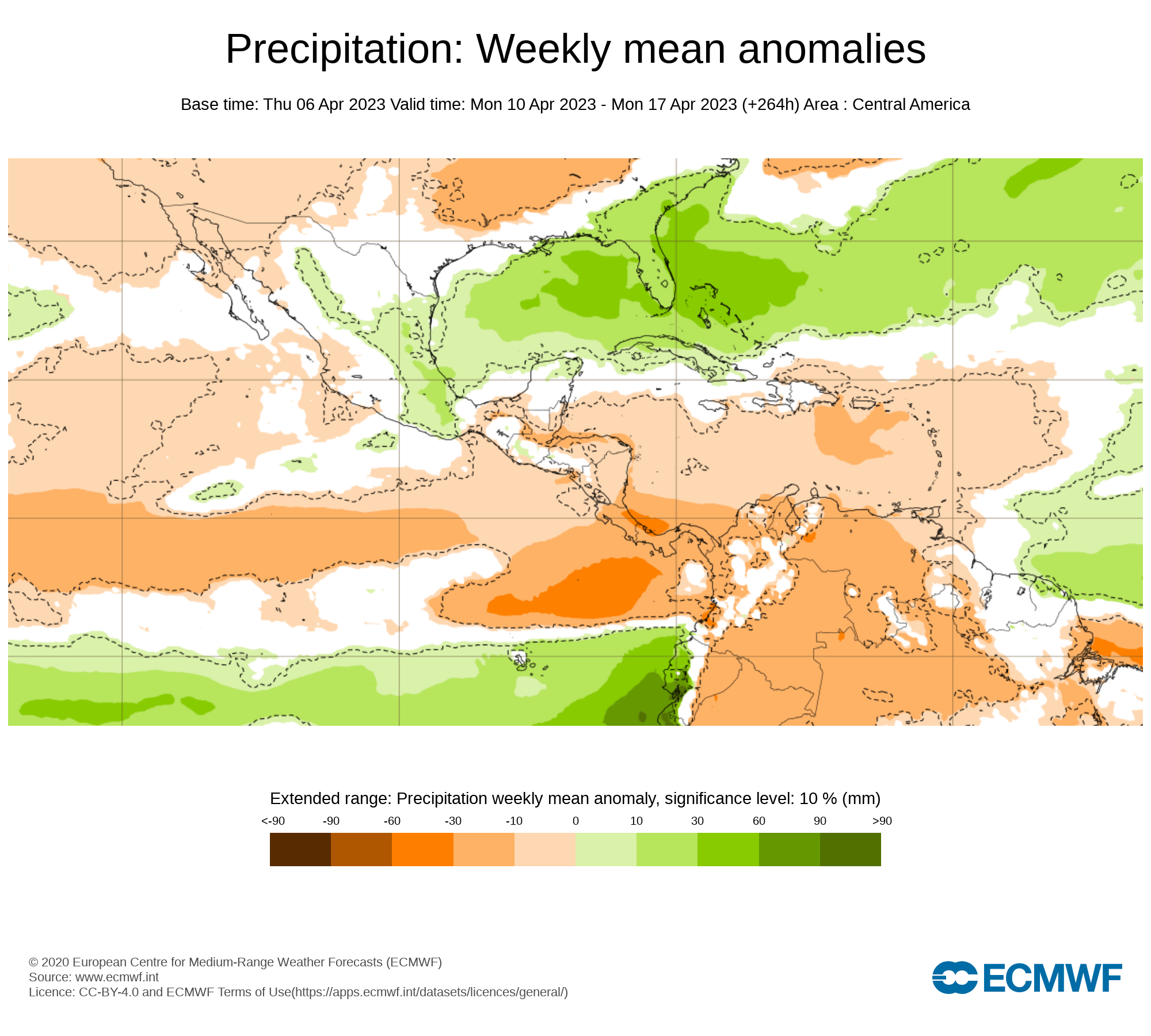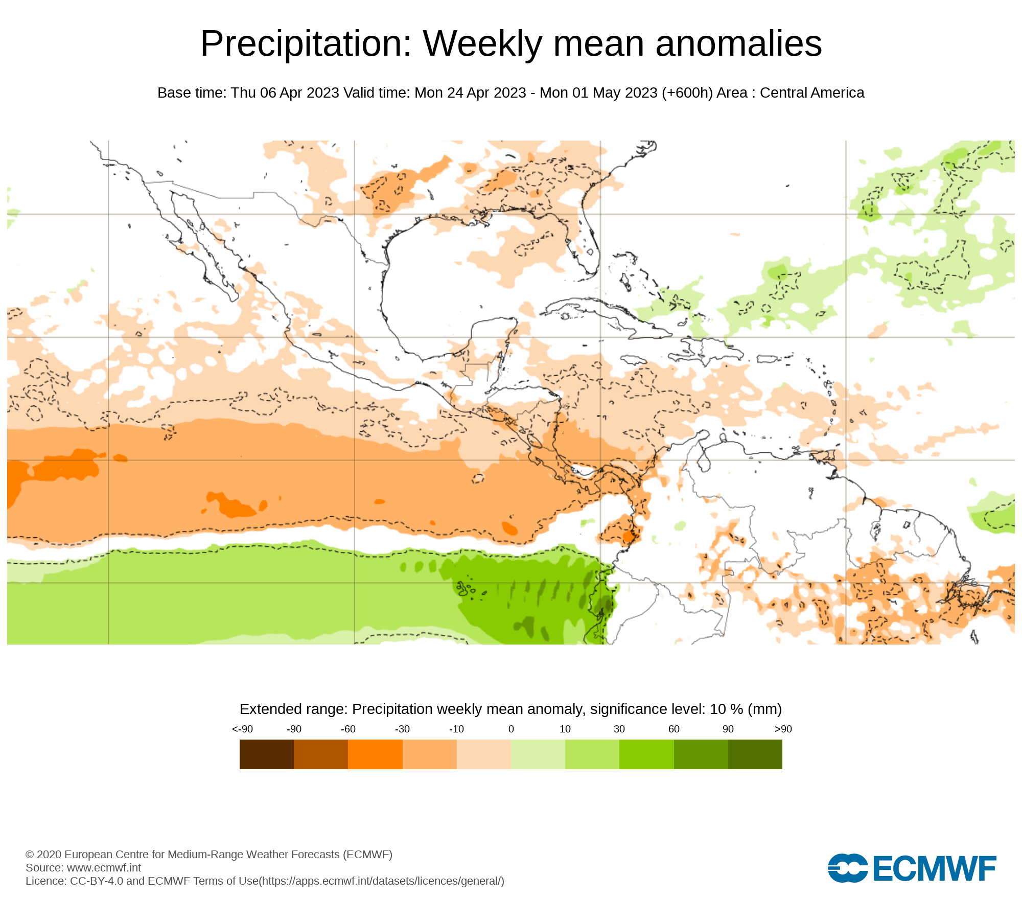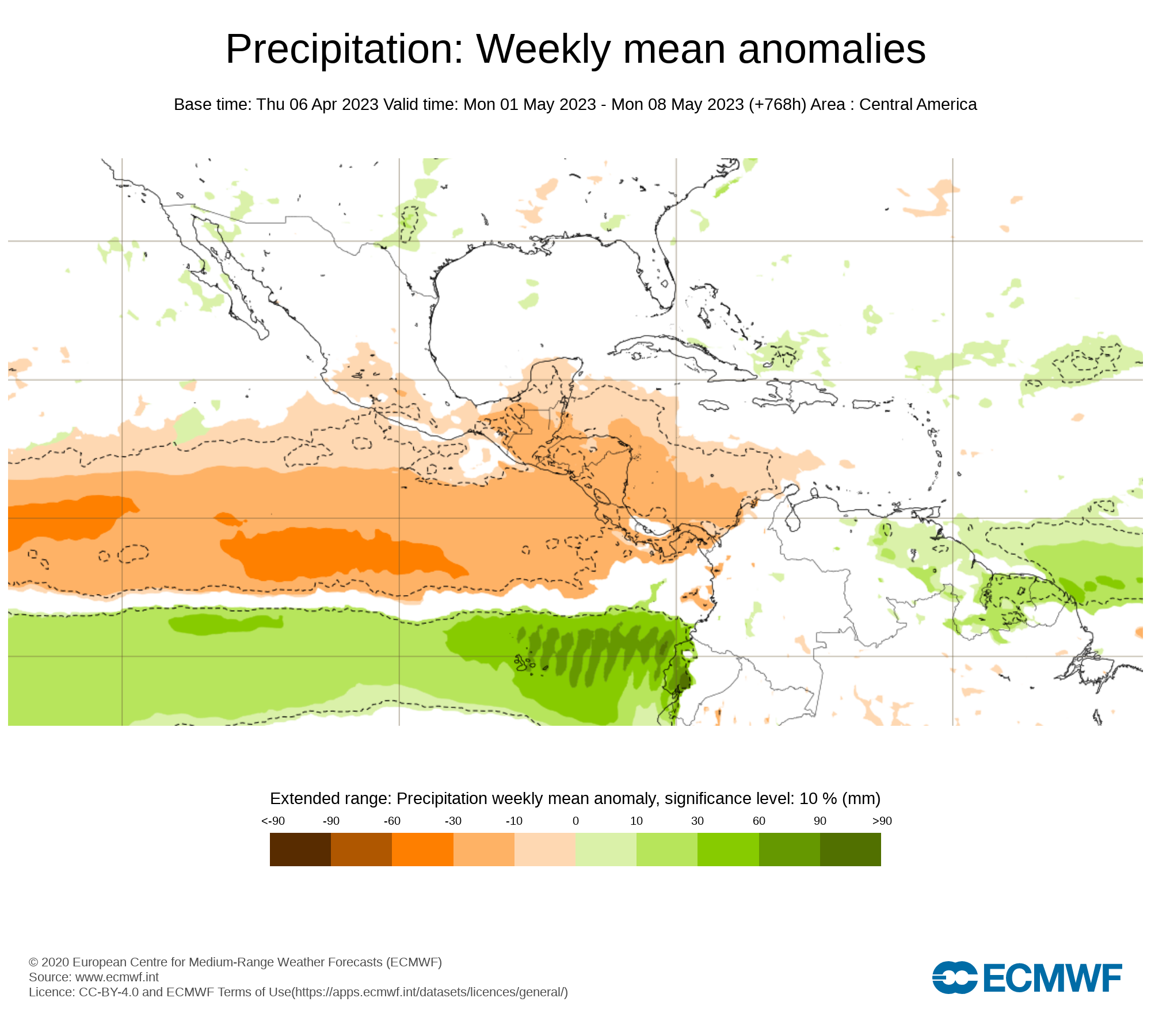 El pronostico semanal emitido por European Centre for Medium-Range Weather Forecast (ECMWF), se esperan eventos de precipitaciones entre promedio a por debajo sobre el territorio nacional, con anomalías negativas llanos occidentales, centrales y sur de país.