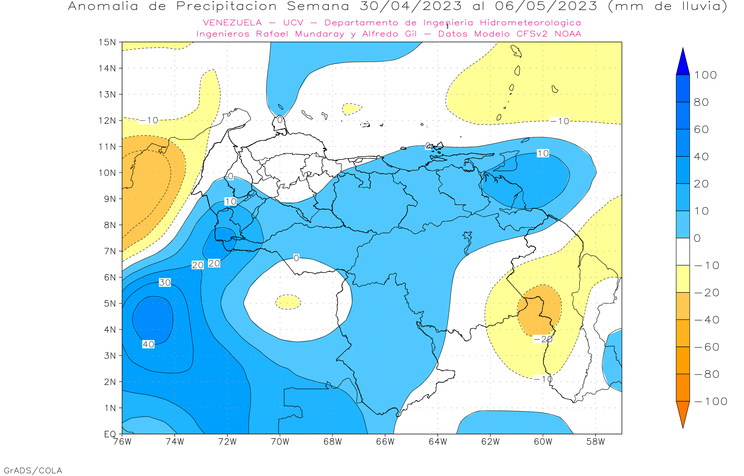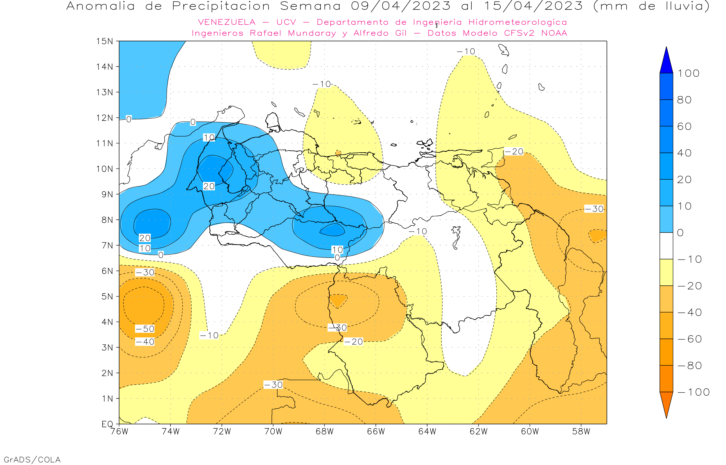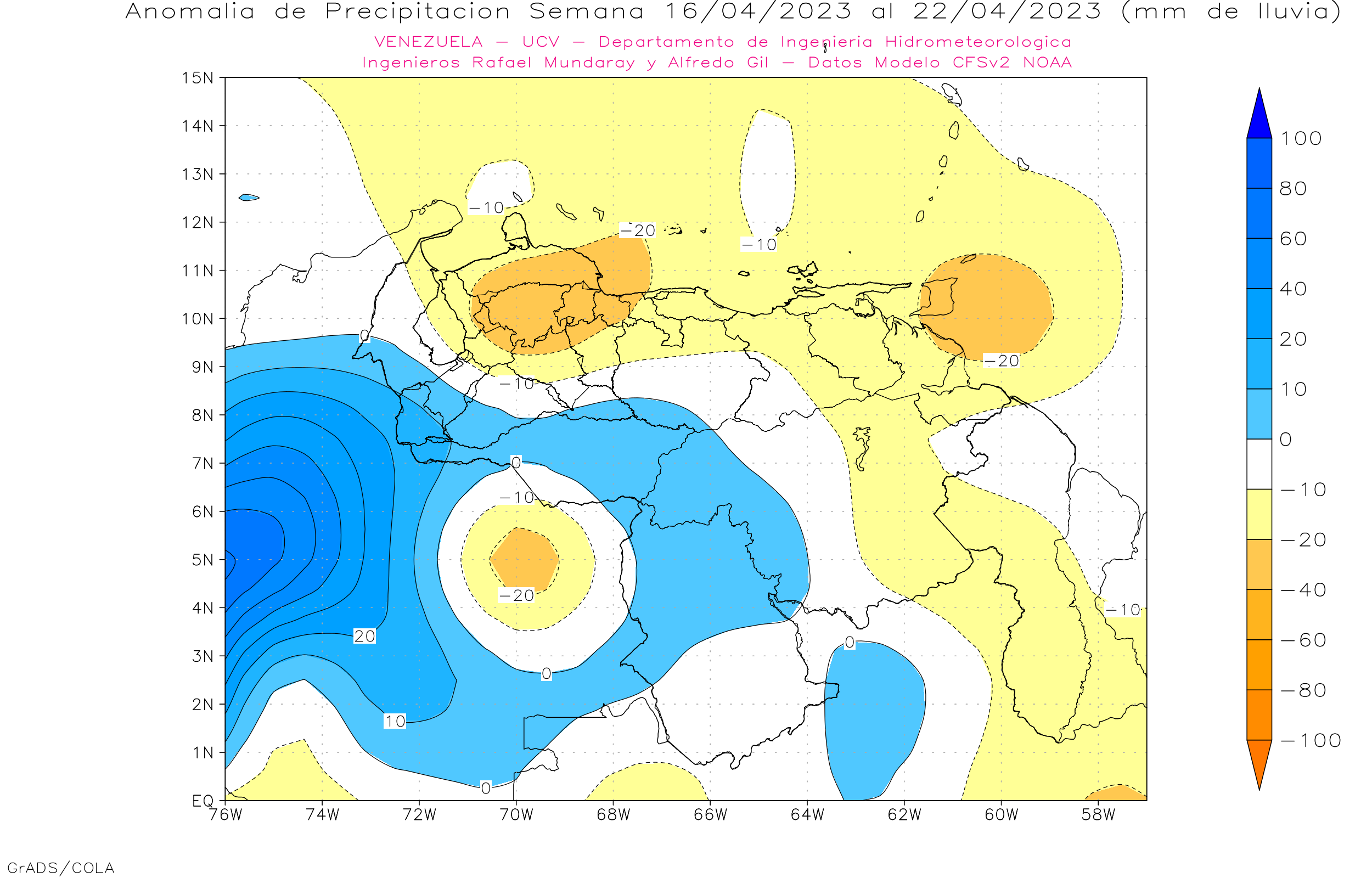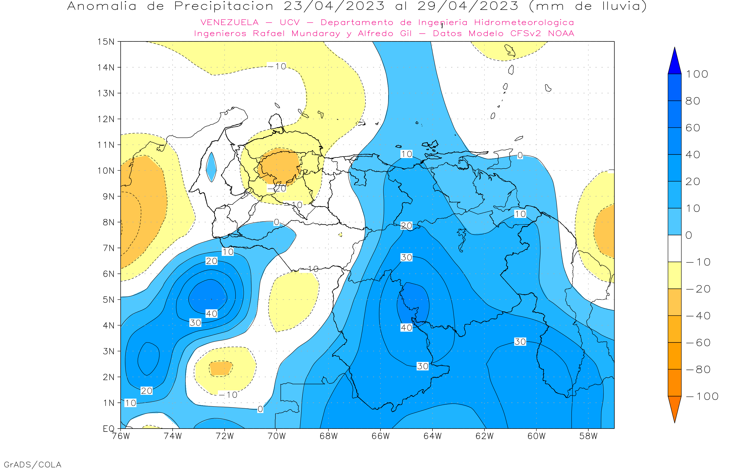 Pronostico de Anomalías Semanales para Venezuela, del 10/04 al 06/05/2023, usando datos del Modelo CFSv2 de NOAA y ECMWF.