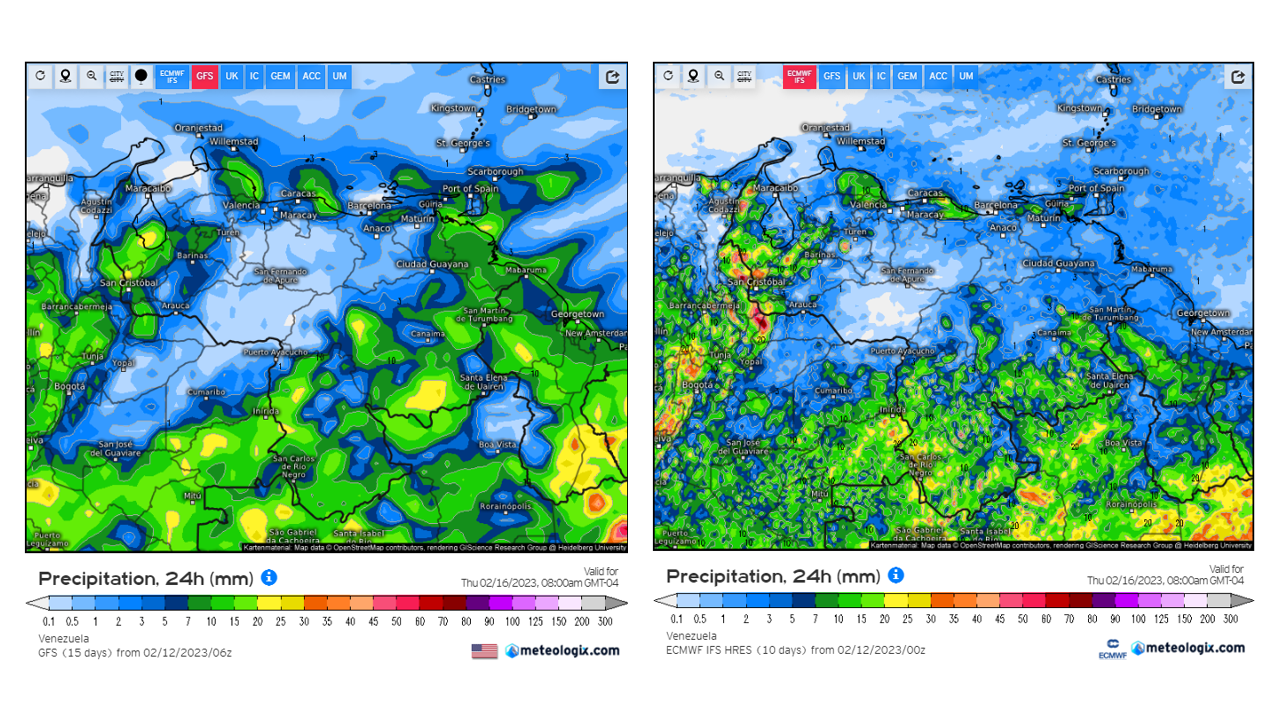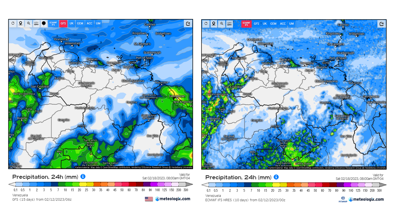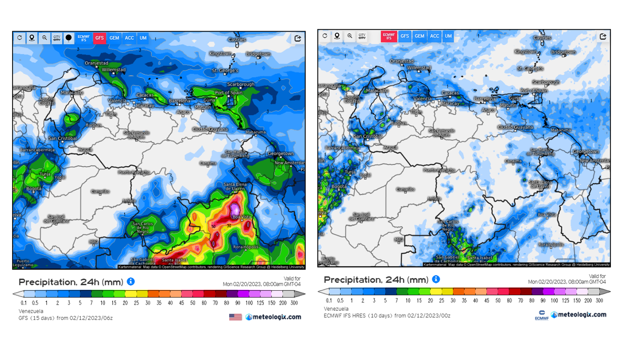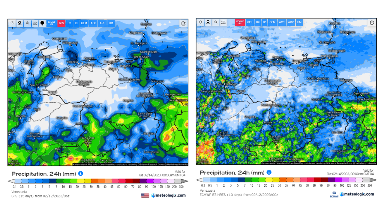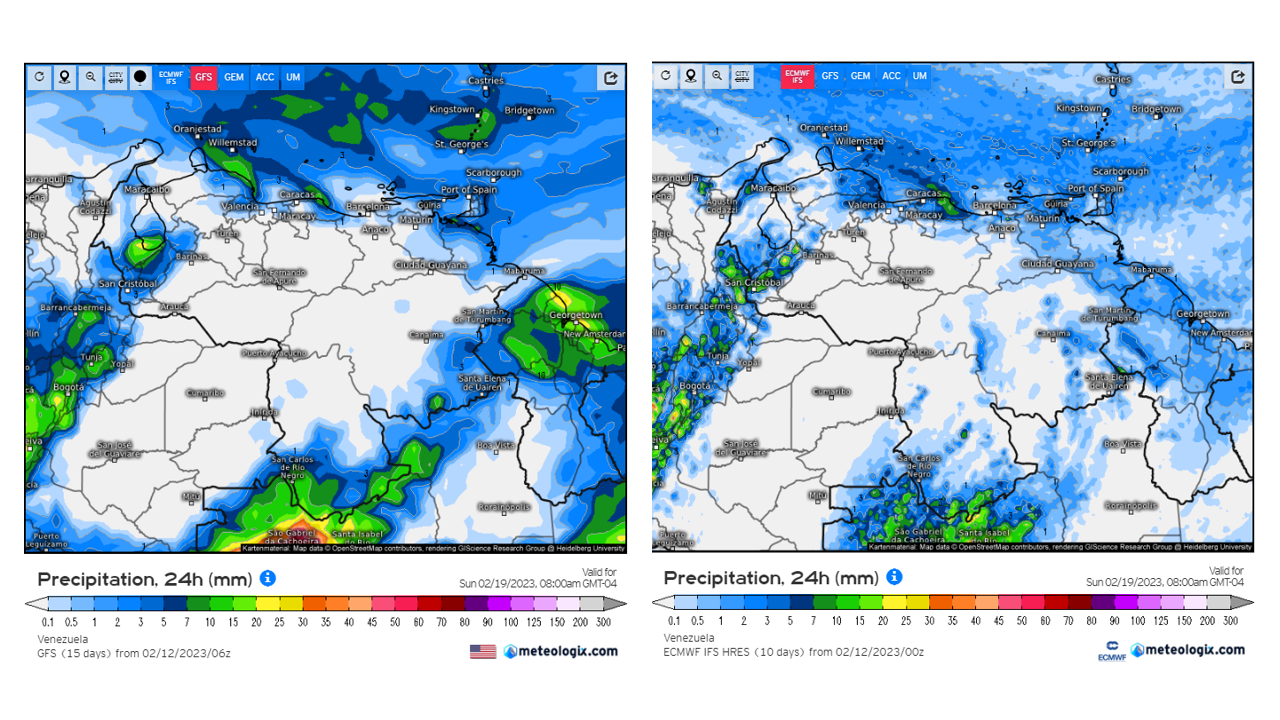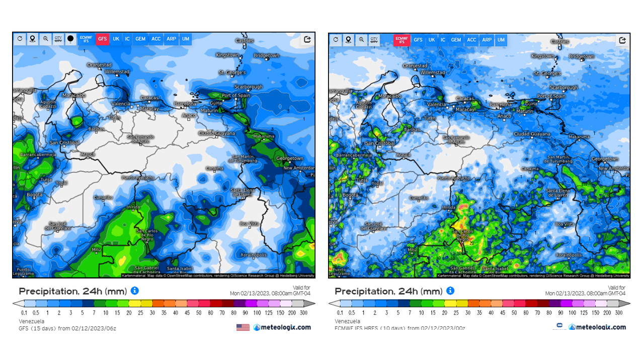 El modelo GFSv2 prevé en general eventos de precipitaciones dentro del promedio histórico en casi todo el territorio nacional. Las principales anomalías positivas al este de Bolívar y oeste de Amazonas
