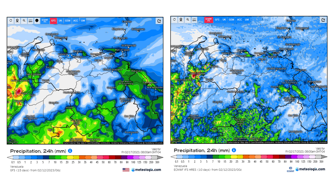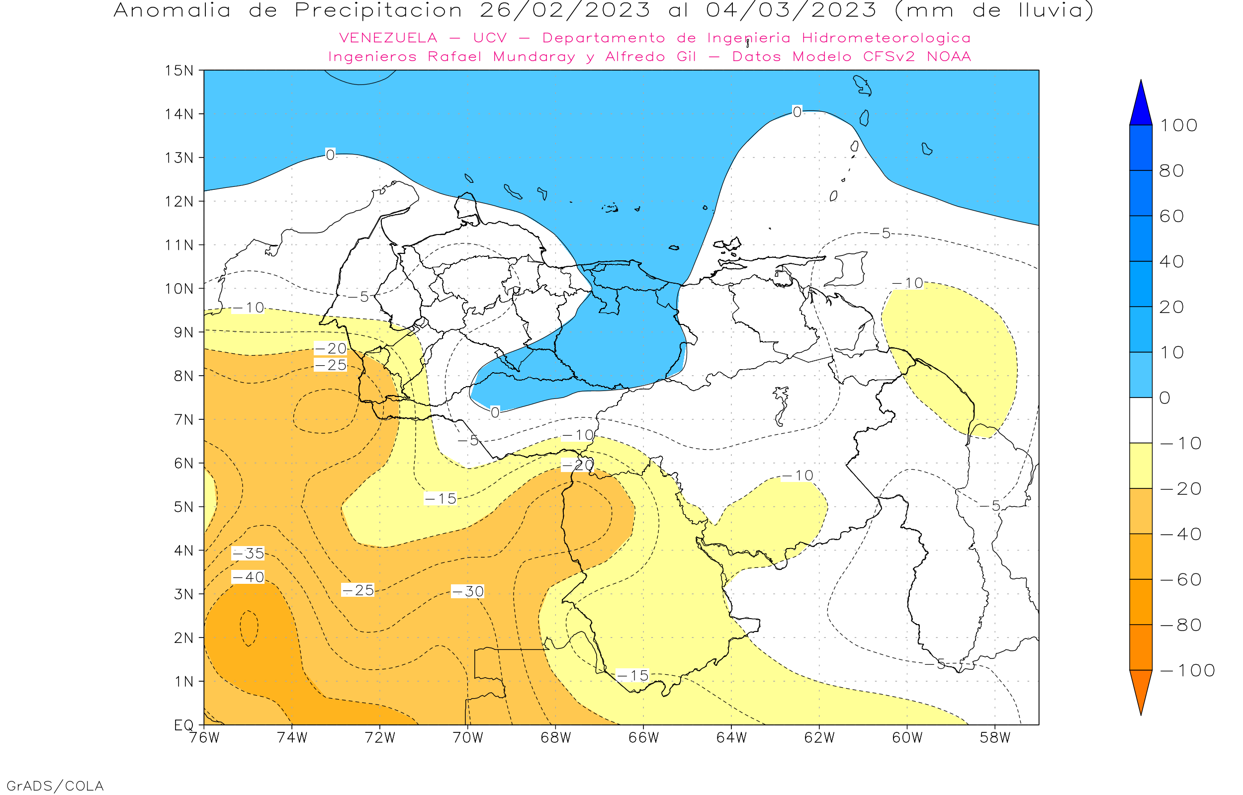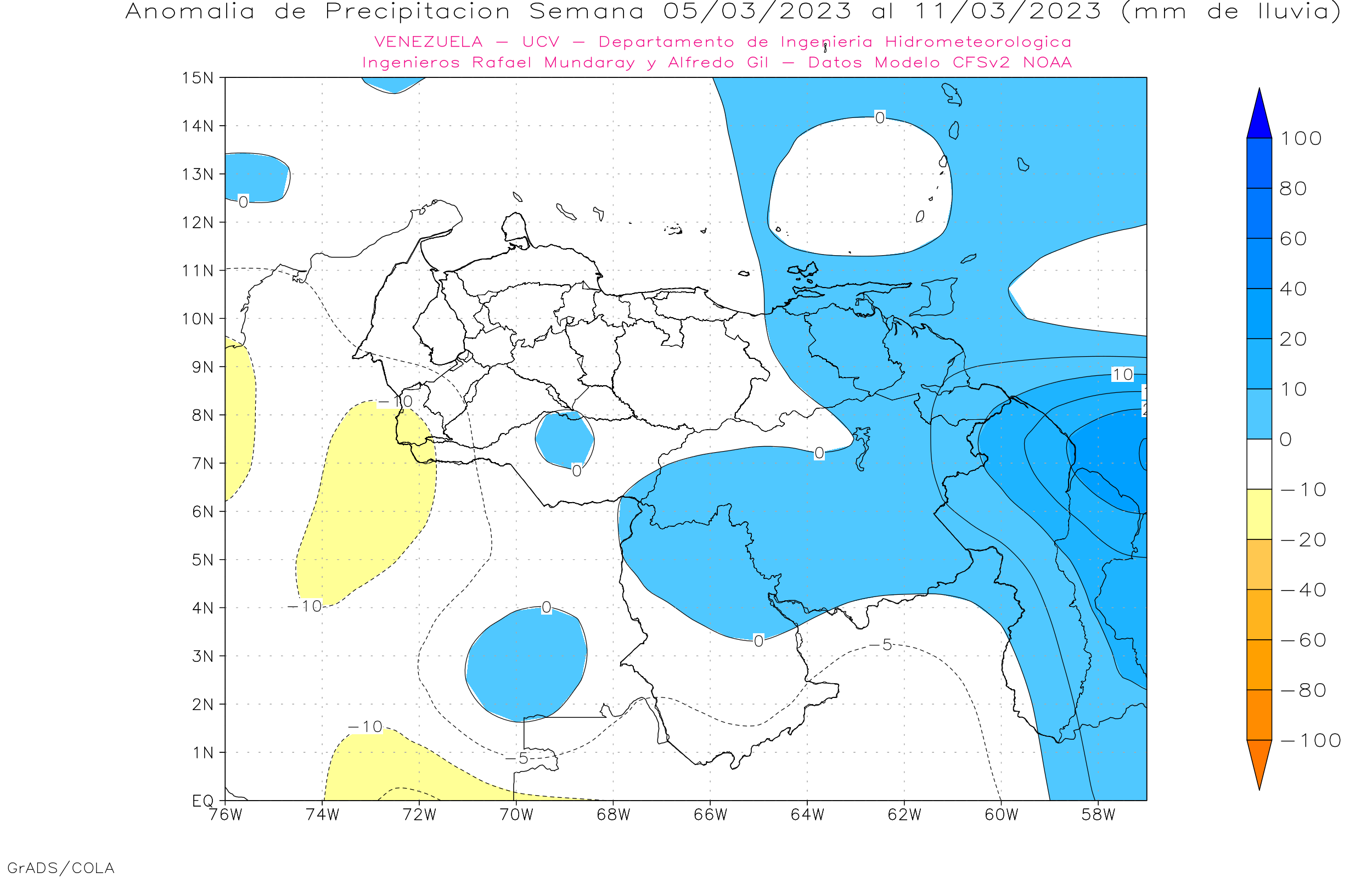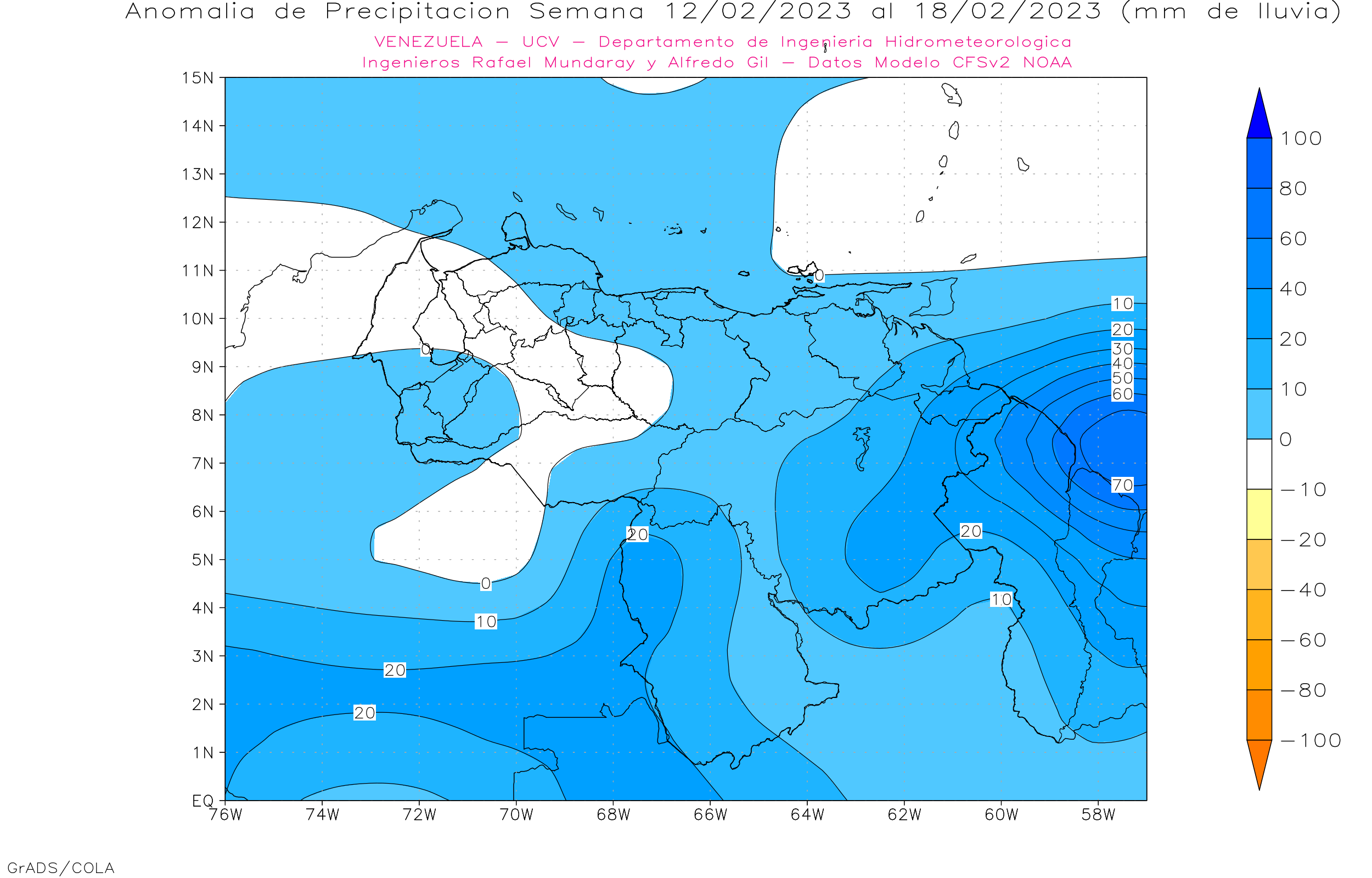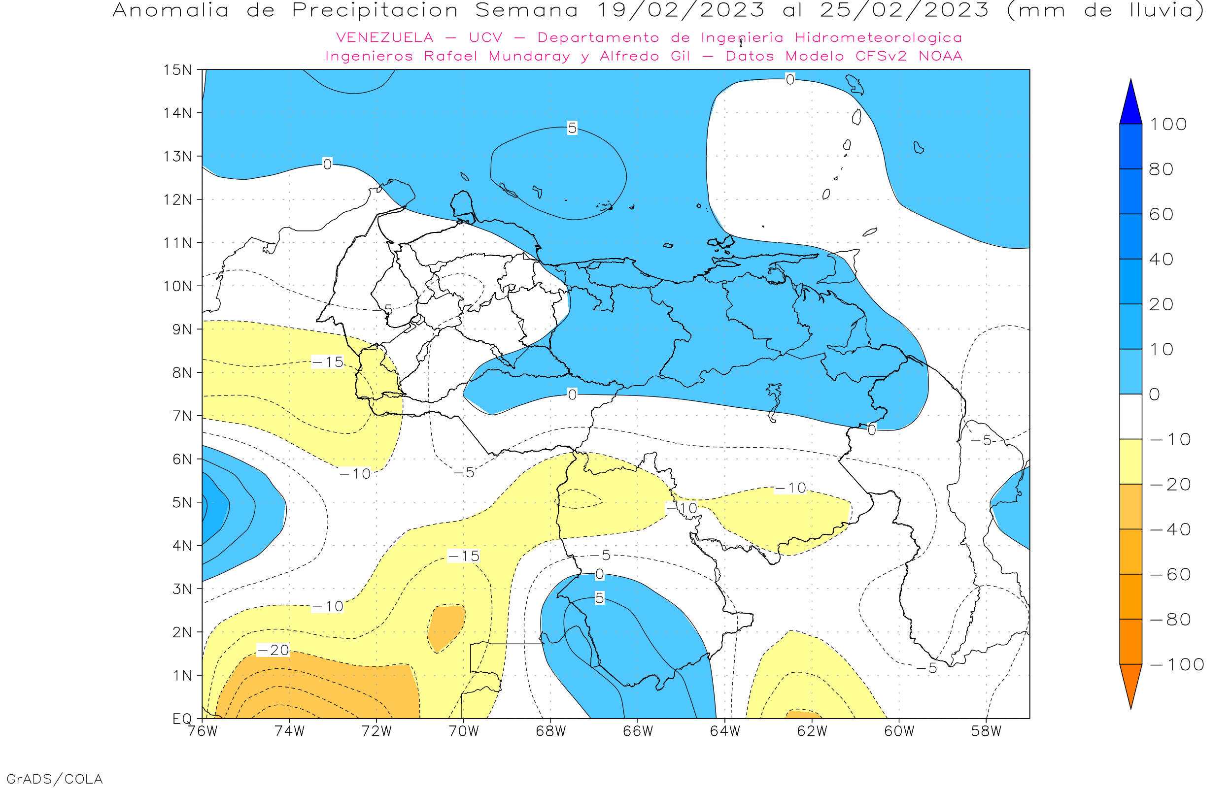 Pronostico de Anomalías Semanales para Venezuela, del 12/02 al 11/03/2023, usando datos del Modelo CFSv2 de NOAA y ECMWF.
