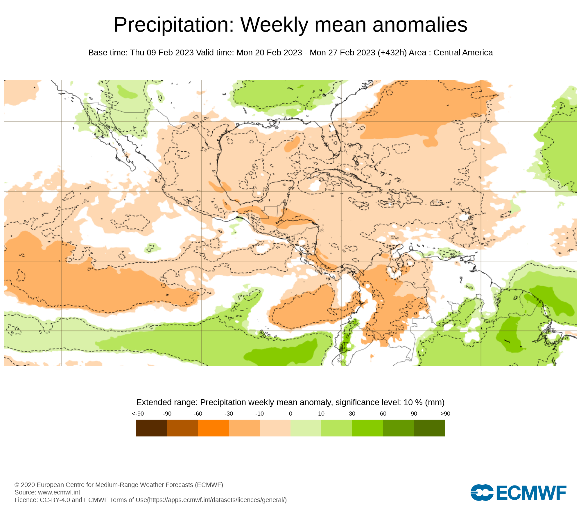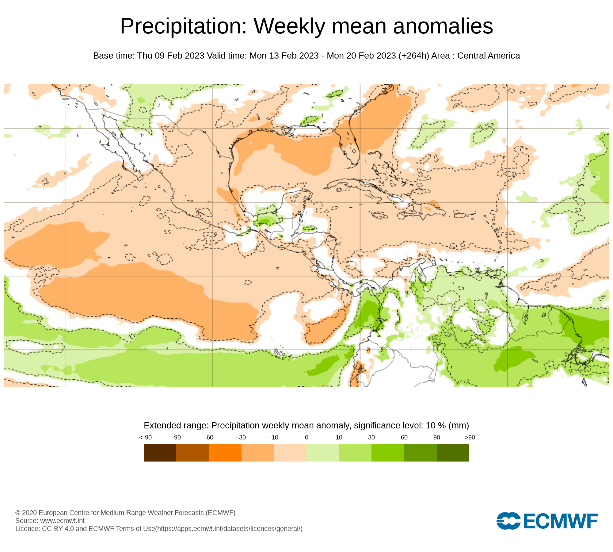 El pronostico semanal emitido por European Centre for Medium-Range Weather Forecast (ECMWF), se esperan eventos de precipitaciones promedio sobre el territorio nacional.