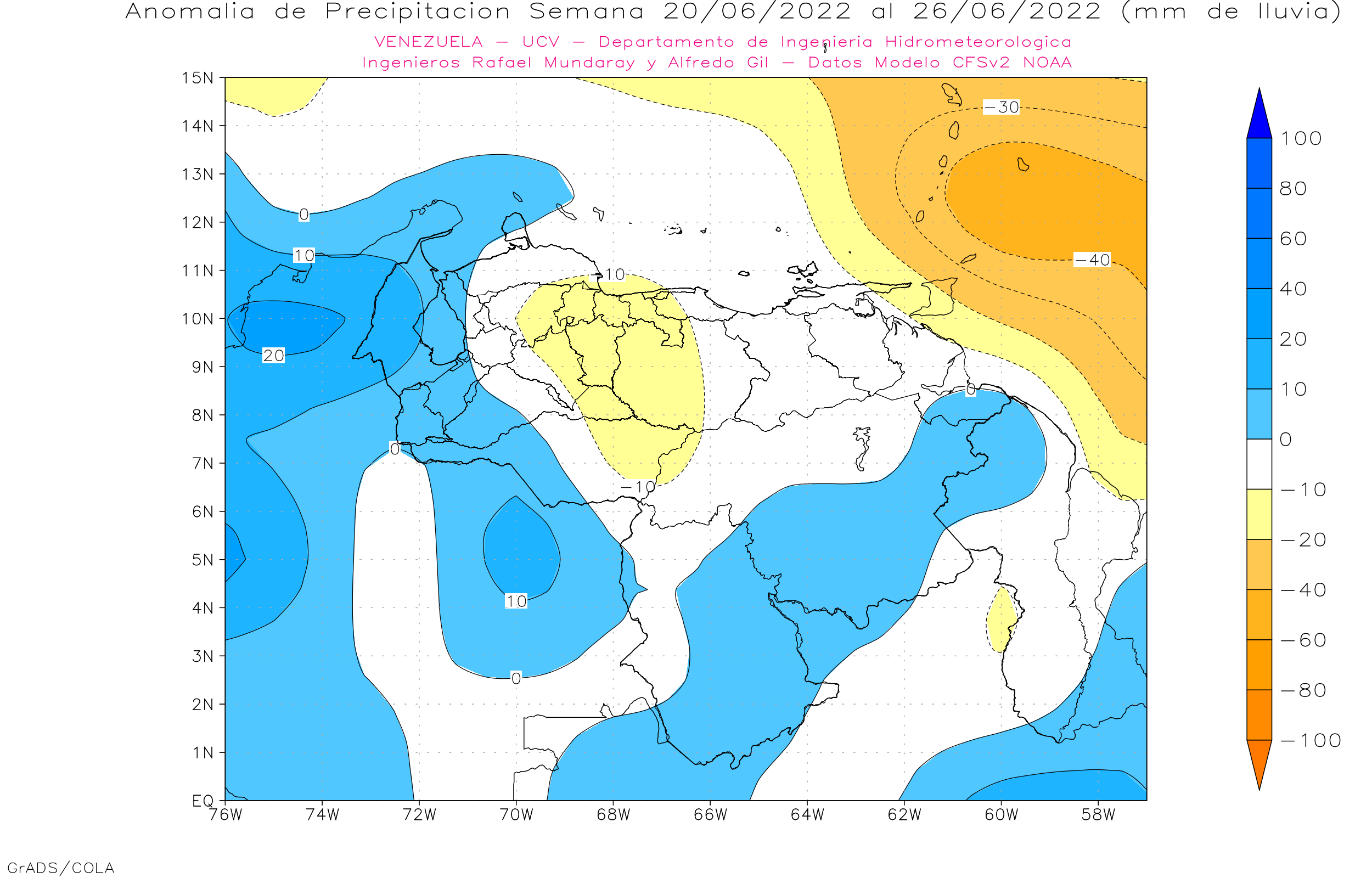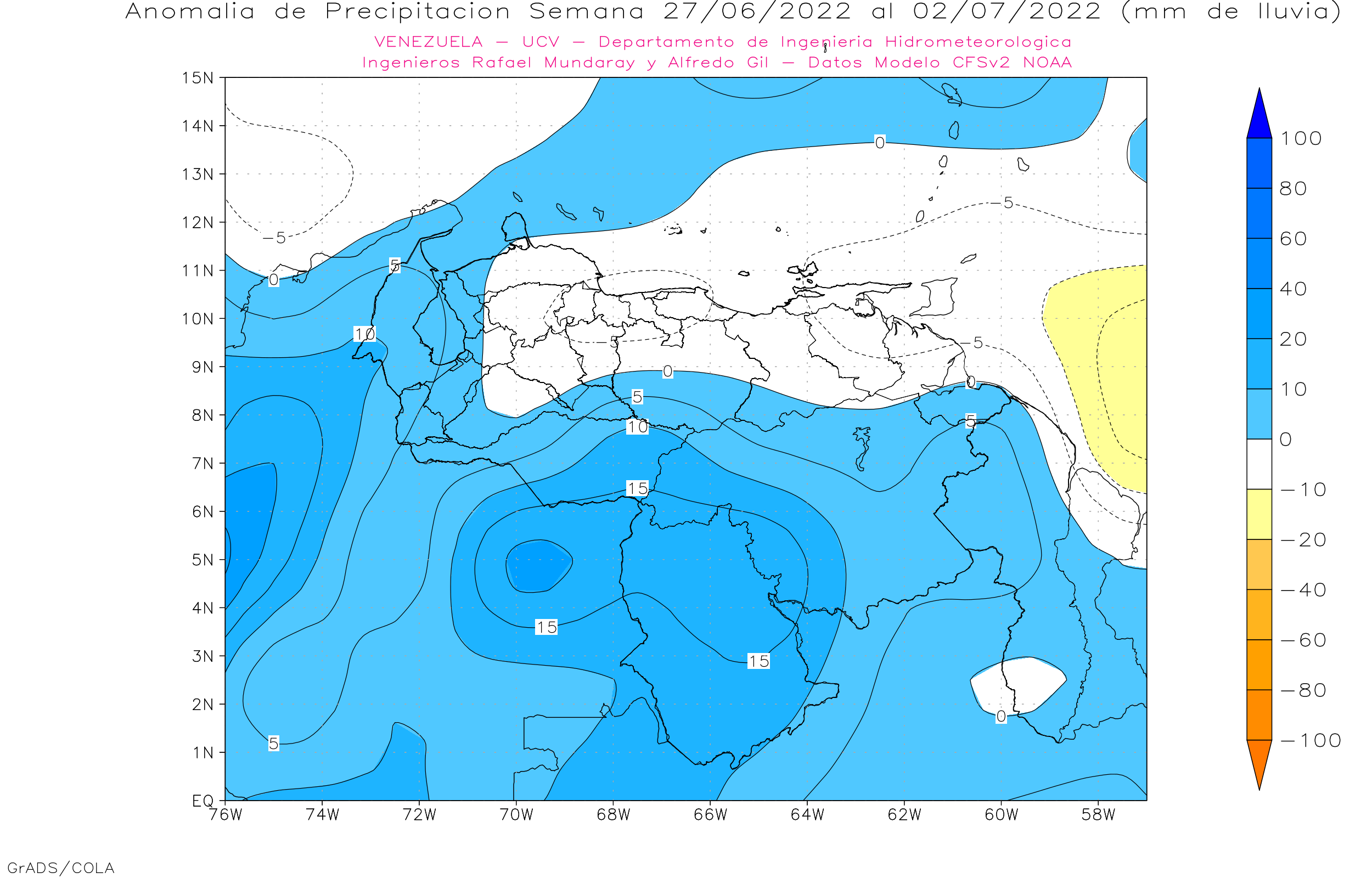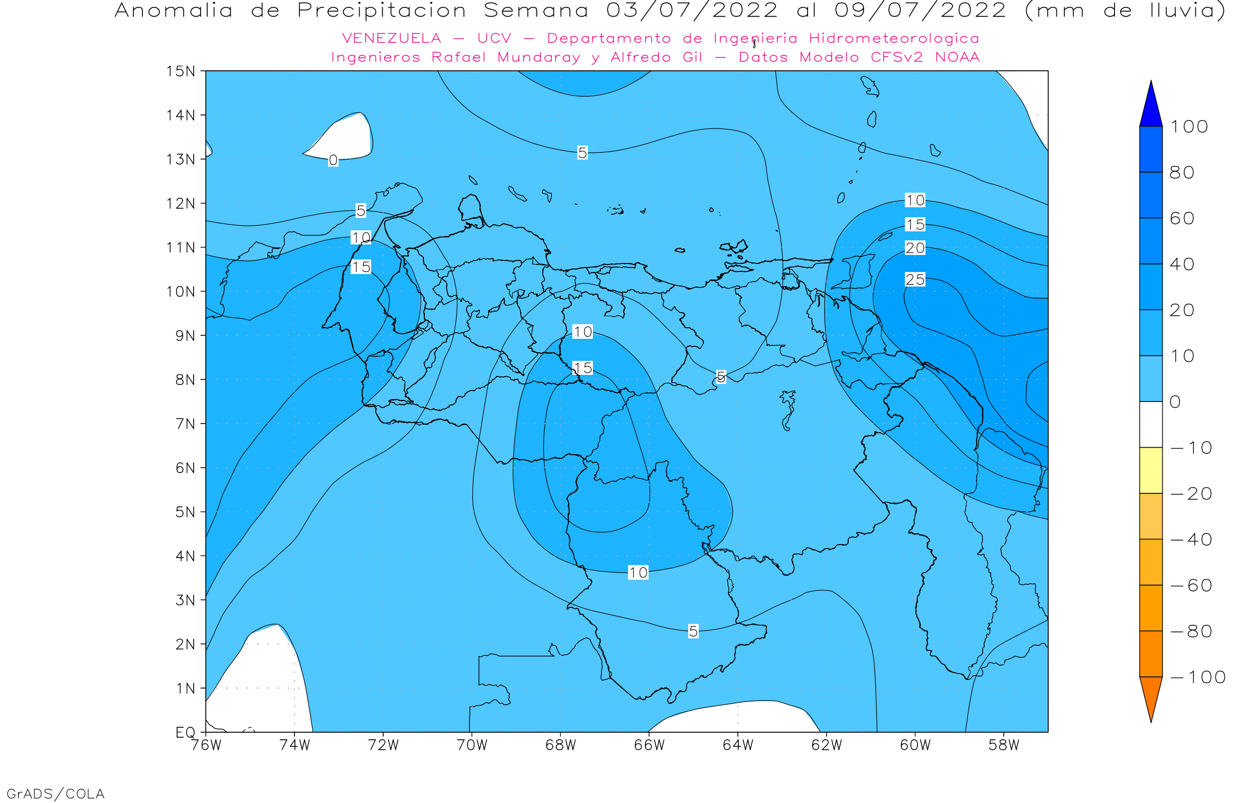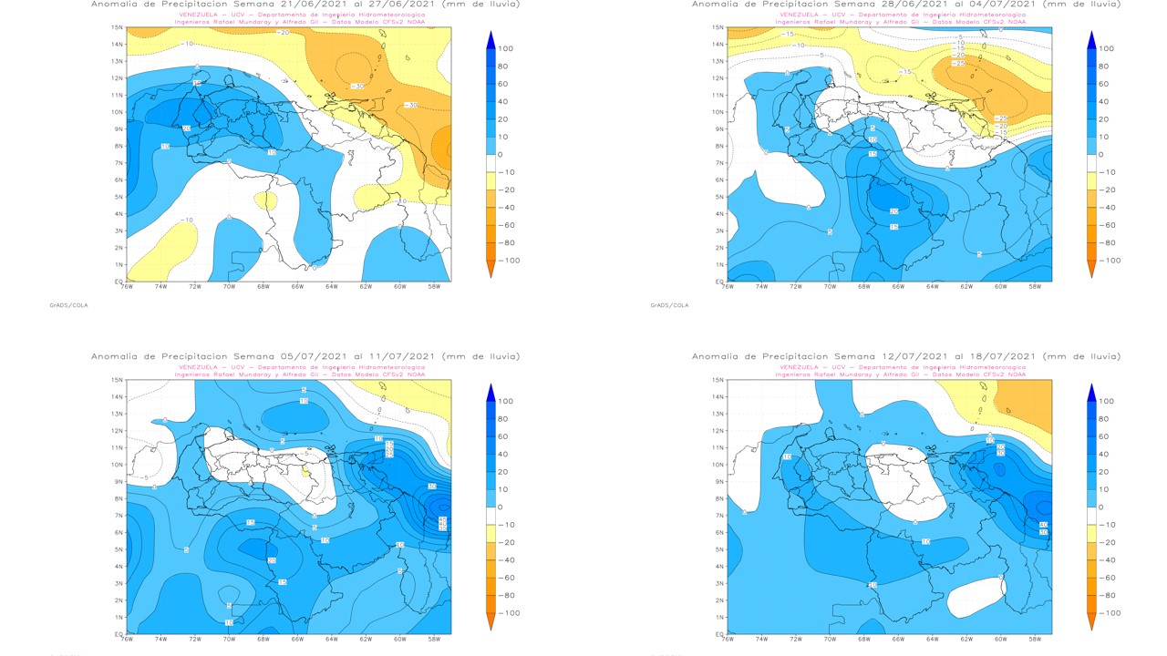 El modelo GFSV2 prevé en general eventos de precipitaciones dentro del promedio histórico en casi todo el territorio nacional, con anomalías positivas importantes oeste del estado Zulia, este de los estados Monagas y Cumana, Delta Amacuro, Amazonas  y  Bolívar.