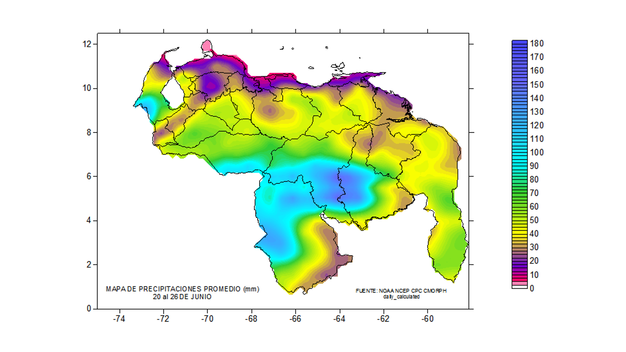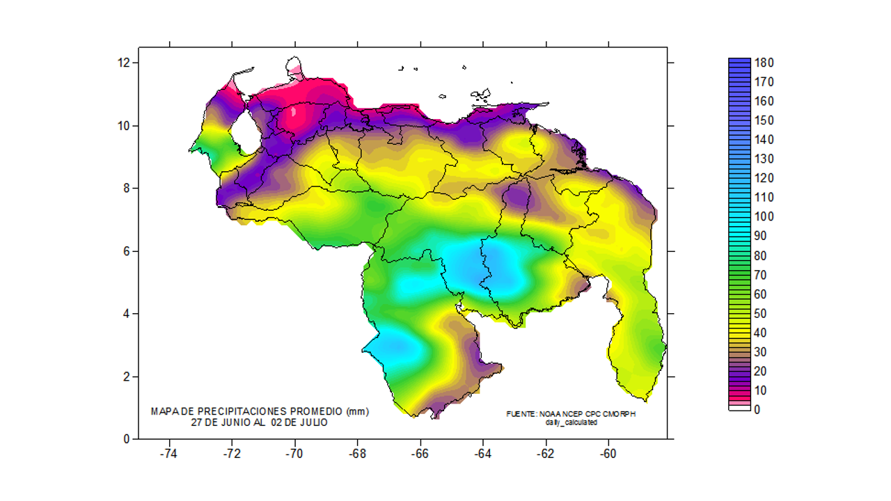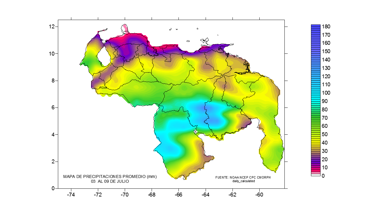De acuerdo a la estadística de las precipitaciones estimadas para esta semana, se observa que los eventos mas importantes se mantiene al sur del país, suroeste de Zulia, oeste de  Barinas,  Apure y sur de Guárico. Ya se observa que las lluvias por encima de los 40 mm se ubican al sur de 9 norte, debilitándose las lluvias a lo largo de la cordillera andina, Falcón, cuenca baja del Caroní, Lara, sureste de los estados Bolívar  y Amazonas, y norte de Zulia