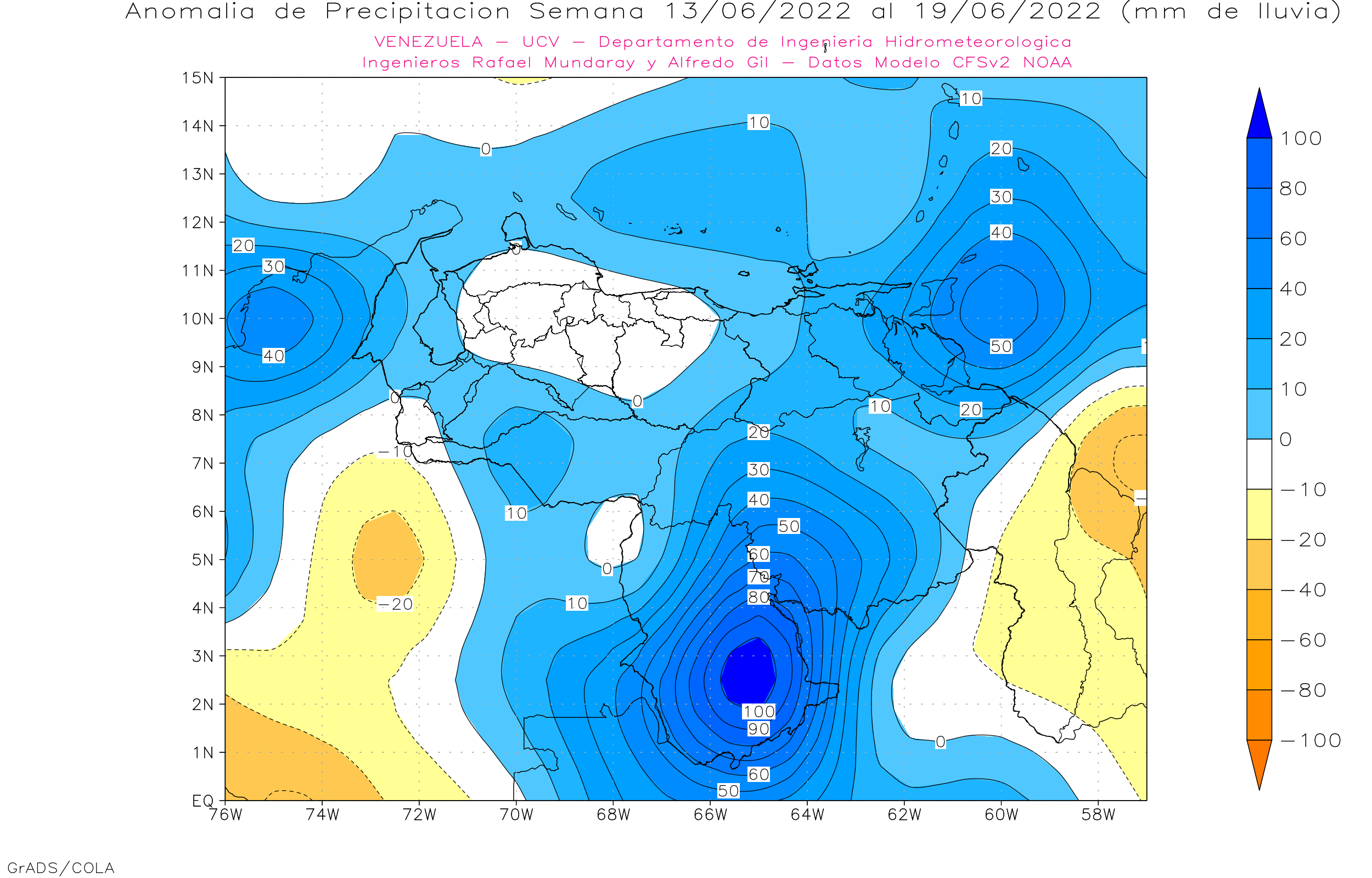 Pronostico de Anomalías Semanales para Venezuela, del 13/06 al 09/07/22, usando datos del Modelo CFSv2 de NOAA y ECMWF.