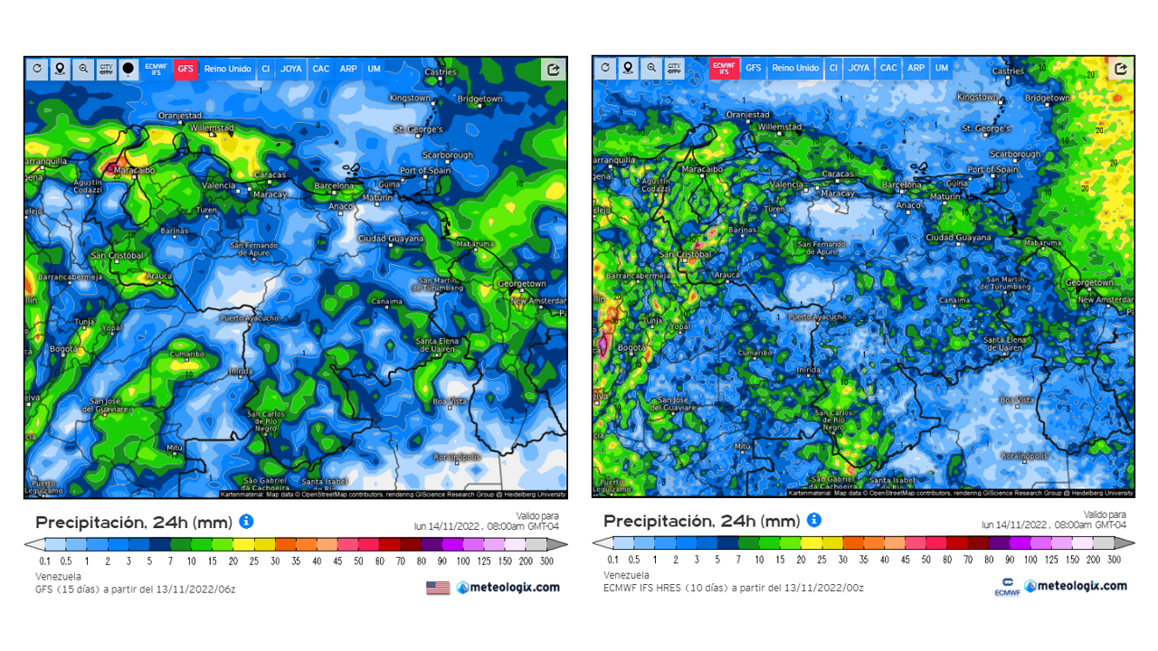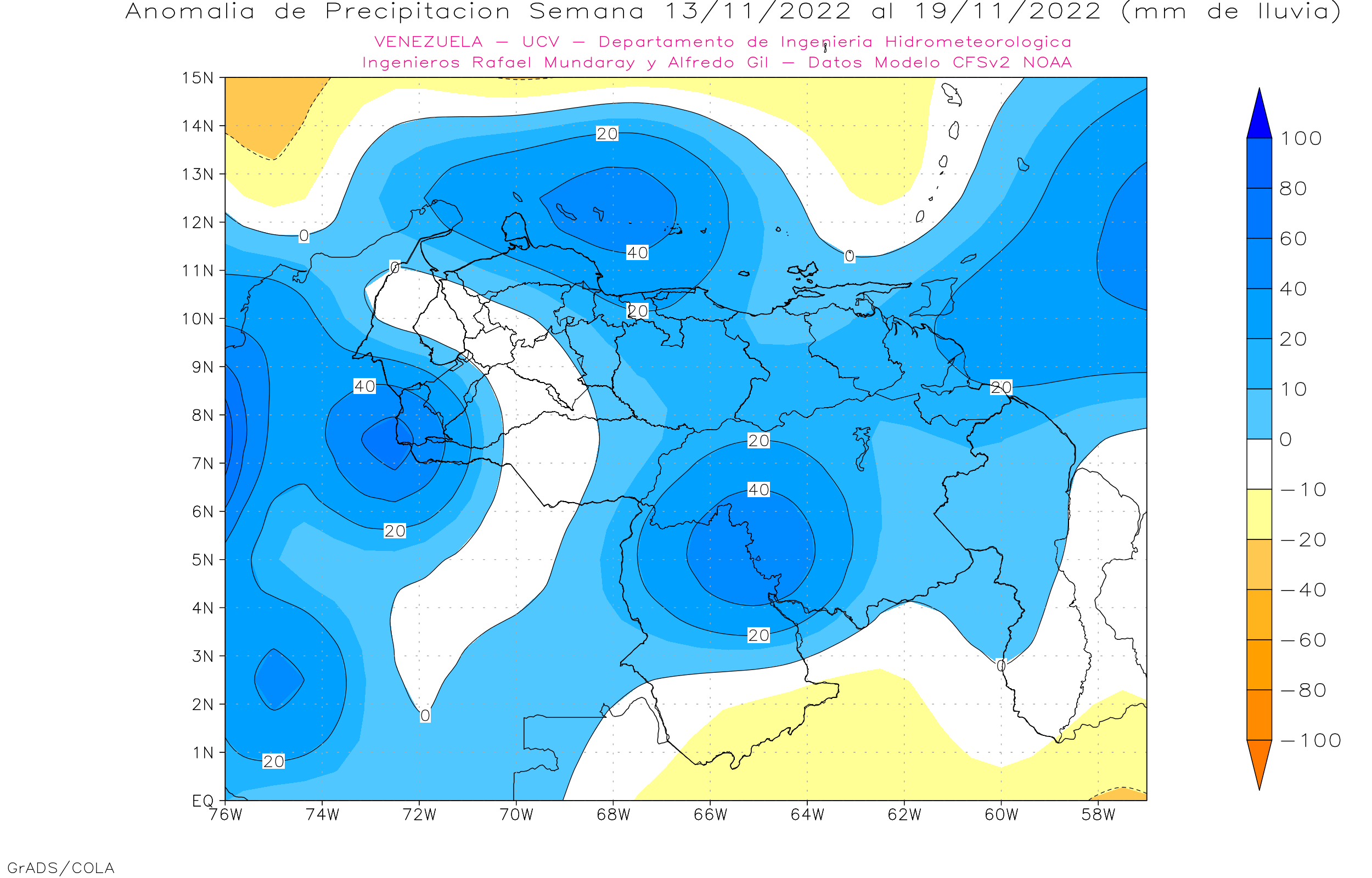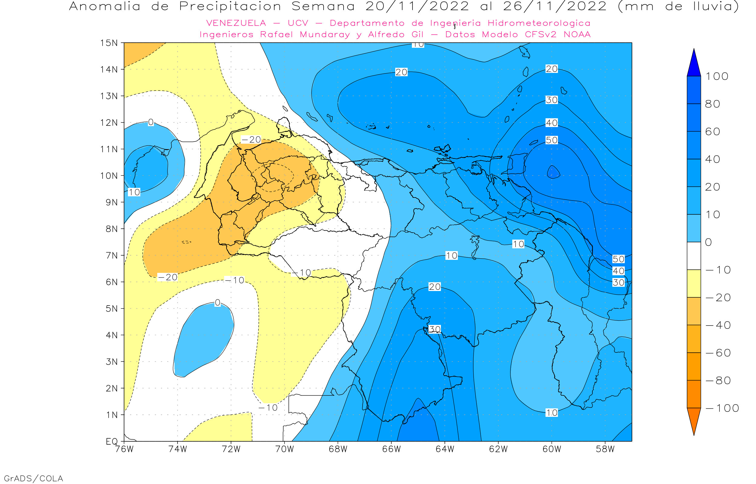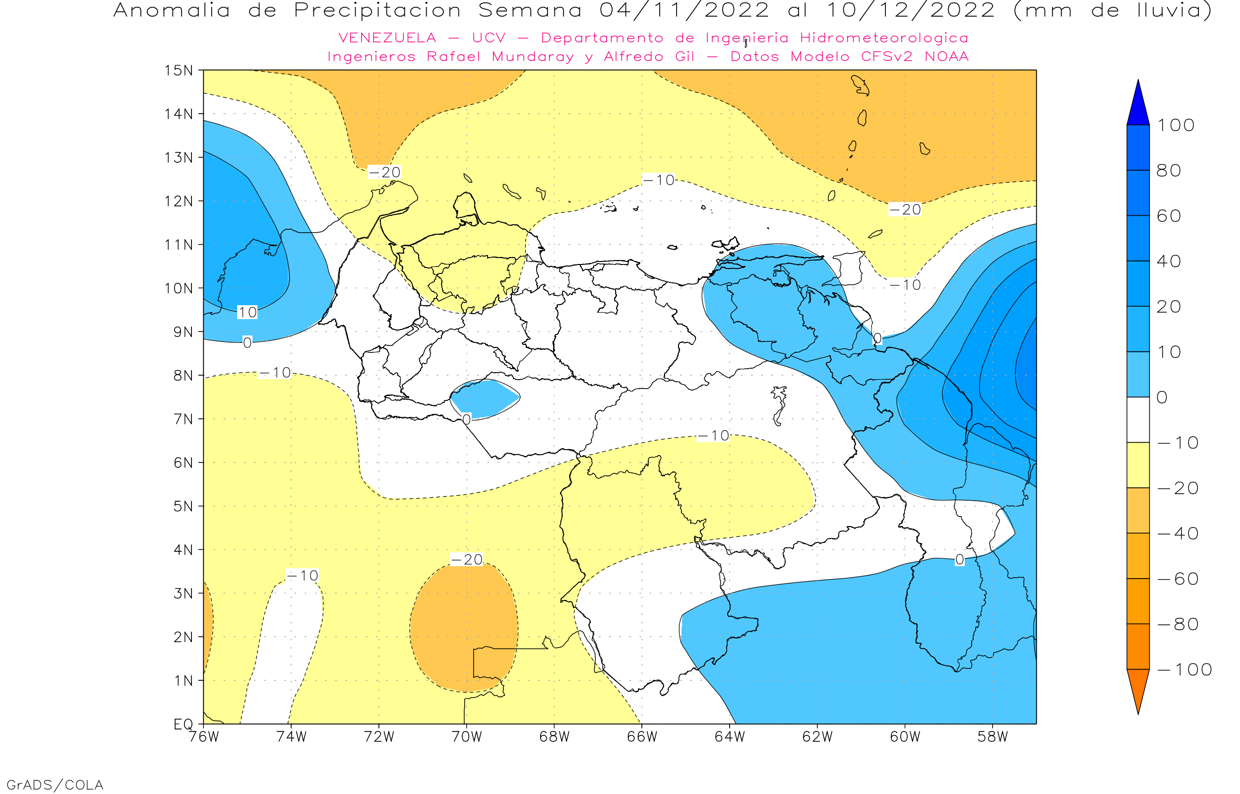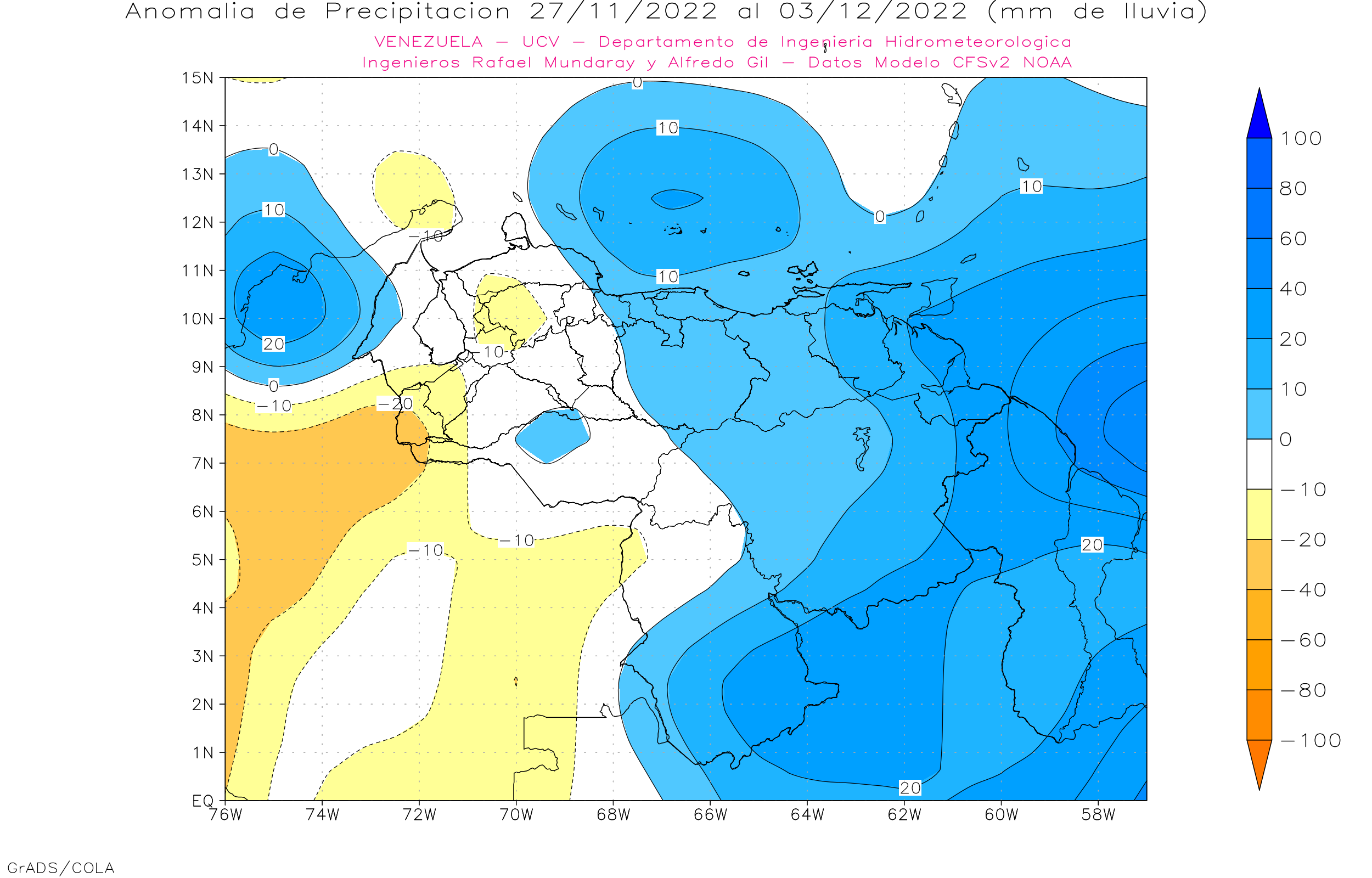 El modelo GFSv2 prevé en general eventos de precipitaciones dentro del promedio histórico en casi todo el territorio nacional. Las anomalías positivas al sur del lago, Táchira, a lo largo de la región norte costera, oeste de Bolívar y norte de Amazonas.