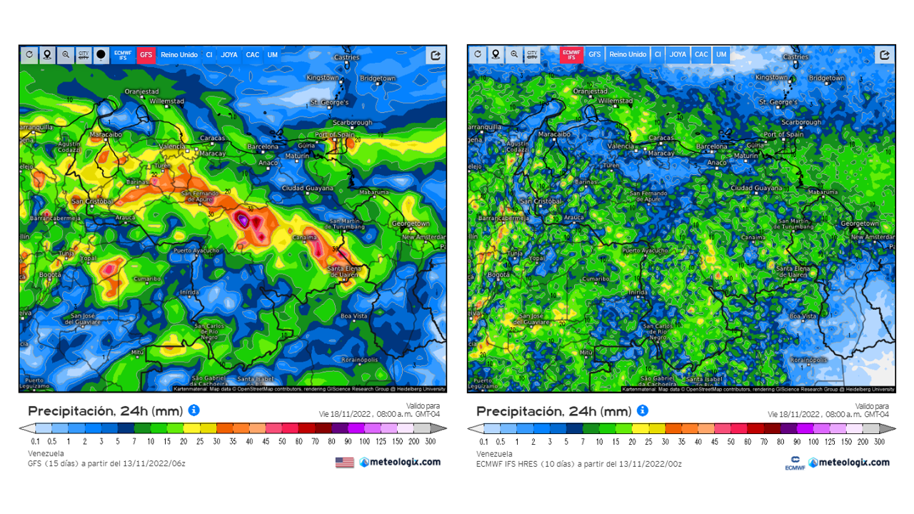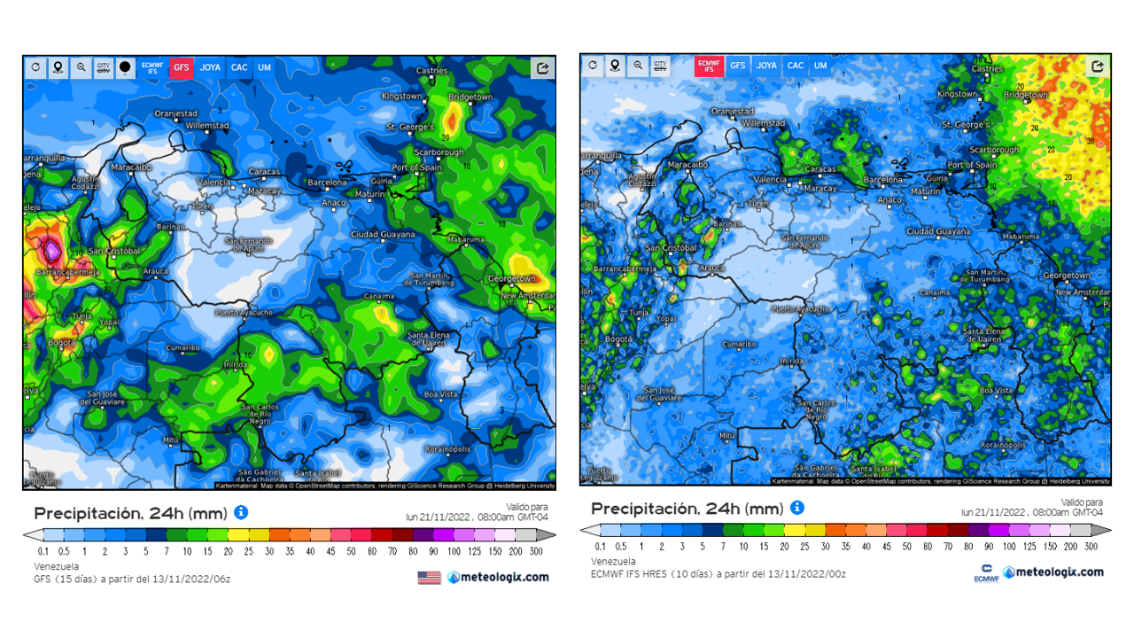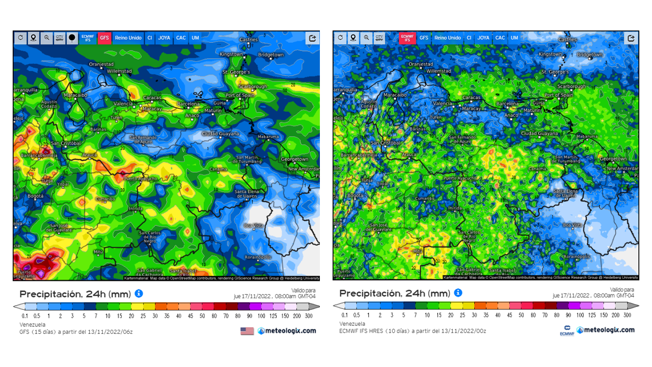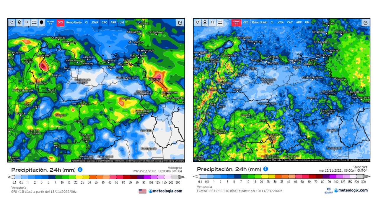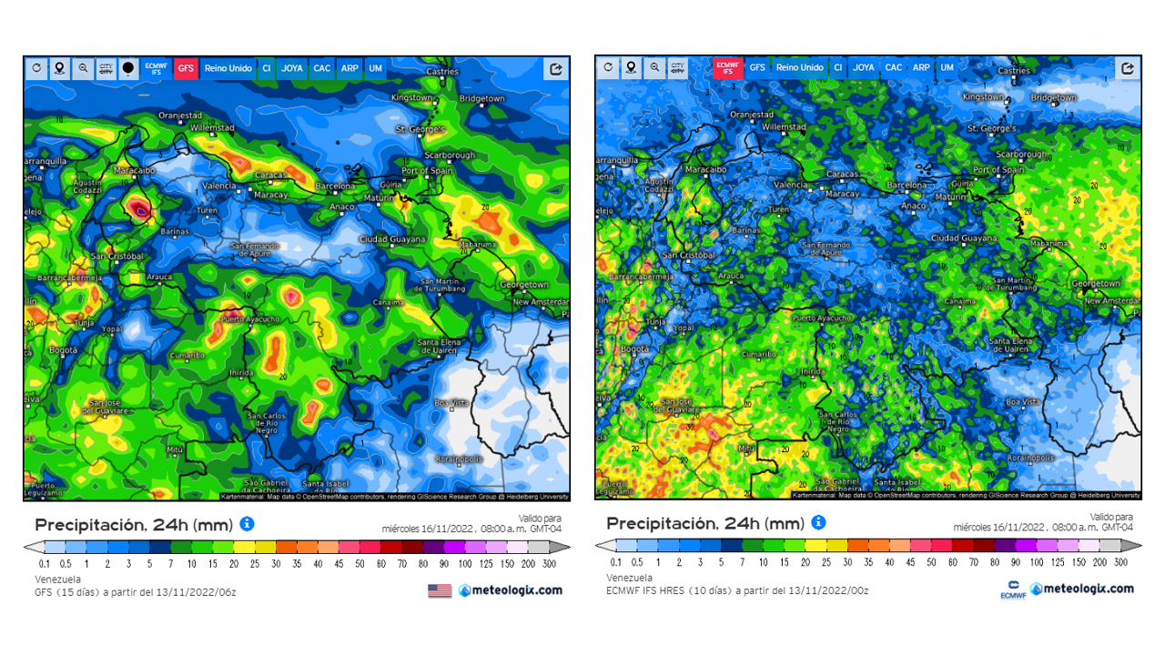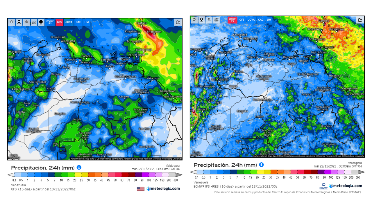 El modelo GFSv2 prevé en general eventos de precipitaciones dentro del promedio histórico en casi todo el territorio nacional. Las anomalías positivas al sur del lago, Táchira, a lo largo de la región norte costera, oeste de Bolívar y norte de Amazonas.