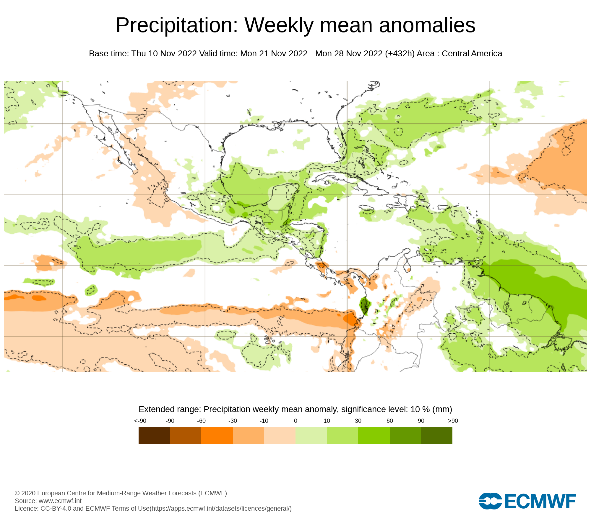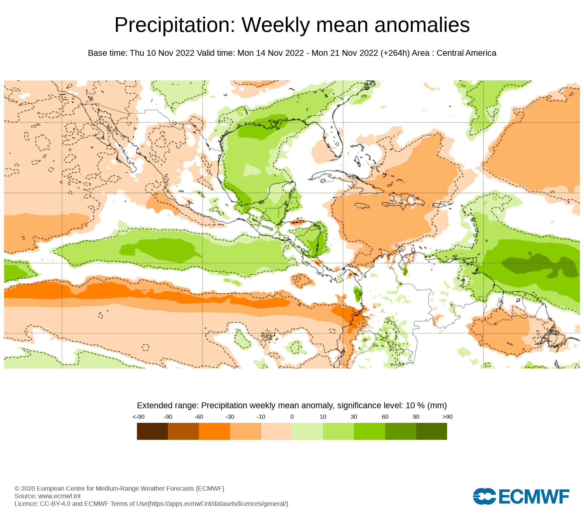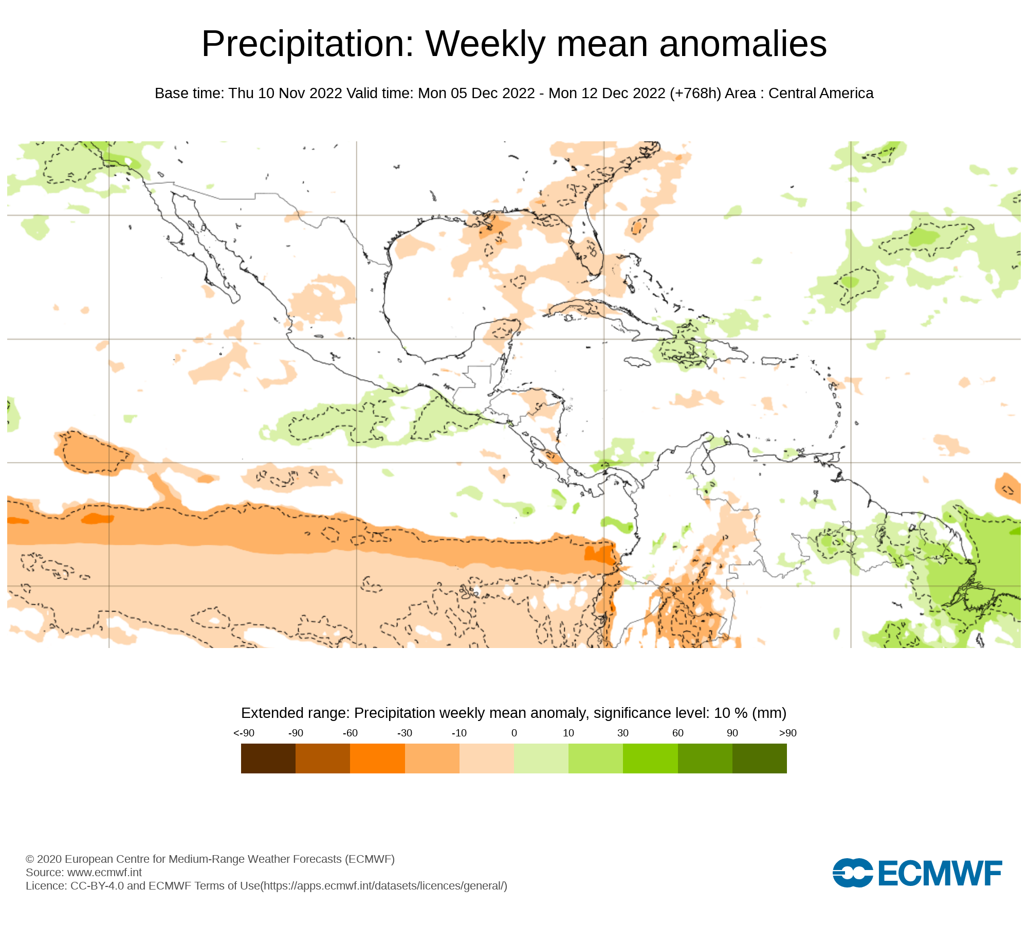 El pronostico semanal emitido por European Centre for Medium-Range Weather Forecast (ECMWF), se esperan eventos de precipitaciones promedio sobre el territorio nacional. Las anomalías mas importante a lo largo de la costa venezolana, Delta Amacuro y Bolívar